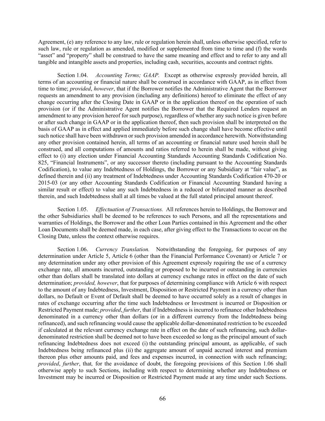 66 Agreement, (e) any reference to any law, rule or regulation herein shall, unless otherwise specified, refer to such law, rule or regulation as amended, modified or supplemented from time to time and (f) the words “asset” and “property” shall be construed to have the same meaning and effect and to refer to any and all tangible and intangible assets and properties, including cash, securities, accounts and contract rights. Section 1.04. Accounting Terms; GAAP. Except as otherwise expressly provided herein, all terms of an accounting or financial nature shall be construed in accordance with GAAP, as in effect from time to time; provided, however, that if the Borrower notifies the Administrative Agent that the Borrower requests an amendment to any provision (including any definitions) hereof to eliminate the effect of any change occurring after the Closing Date in GAAP or in the application thereof on the operation of such provision (or if the Administrative Agent notifies the Borrower that the Required Lenders request an amendment to any provision hereof for such purpose), regardless of whether any such notice is given before or after such change in GAAP or in the application thereof, then such provision shall be interpreted on the basis of GAAP as in effect and applied immediately before such change shall have become effective until such notice shall have been withdrawn or such provision amended in accordance herewith. Notwithstanding any other provision contained herein, all terms of an accounting or financial nature used herein shall be construed, and all computations of amounts and ratios referred to herein shall be made, without giving effect to (i) any election under Financial Accounting Standards Accounting Standards Codification No. 825, “Financial Instruments”, or any successor thereto (including pursuant to the Accounting Standards Codification), to value any Indebtedness of Holdings, the Borrower or any Subsidiary at “fair value”, as defined therein and (ii) any treatment of Indebtedness under Accounting Standards Codification 470-20 or 2015-03 (or any other Accounting Standards Codification or Financial Accounting Standard having a similar result or effect) to value any such Indebtedness in a reduced or bifurcated manner as described therein, and such Indebtedness shall at all times be valued at the full stated principal amount thereof. Section 1.05. Effectuation of Transactions. All references herein to Holdings, the Borrower and the other Subsidiaries shall be deemed to be references to such Persons, and all the representations and warranties of Holdings, the Borrower and the other Loan Parties contained in this Agreement and the other Loan Documents shall be deemed made, in each case, after giving effect to the Transactions to occur on the Closing Date, unless the context otherwise requires. Section 1.06. Currency Translation. Notwithstanding the foregoing, for purposes of any determination under Article 5, Article 6 (other than the Financial Performance Covenant) or Article 7 or any determination under any other provision of this Agreement expressly requiring the use of a currency exchange rate, all amounts incurred, outstanding or proposed to be incurred or outstanding in currencies other than dollars shall be translated into dollars at currency exchange rates in effect on the date of such determination; provided, however, that for purposes of determining compliance with Article 6 with respect to the amount of any Indebtedness, Investment, Disposition or Restricted Payment in a currency other than dollars, no Default or Event of Default shall be deemed to have occurred solely as a result of changes in rates of exchange occurring after the time such Indebtedness or Investment is incurred or Disposition or Restricted Payment made; provided, further, that if Indebtedness is incurred to refinance other Indebtedness denominated in a currency other than dollars (or in a different currency from the Indebtedness being refinanced), and such refinancing would cause the applicable dollar-denominated restriction to be exceeded if calculated at the relevant currency exchange rate in effect on the date of such refinancing, such dollar- denominated restriction shall be deemed not to have been exceeded so long as the principal amount of such refinancing Indebtedness does not exceed (i) the outstanding principal amount, as applicable, of such Indebtedness being refinanced plus (ii) the aggregate amount of unpaid accrued interest and premium thereon plus other amounts paid, and fees and expenses incurred, in connection with such refinancing; provided, further, that, for the avoidance of doubt, the foregoing provisions of this Section 1.06 shall otherwise apply to such Sections, including with respect to determining whether any Indebtedness or Investment may be incurred or Disposition or Restricted Payment made at any time under such Sections.
