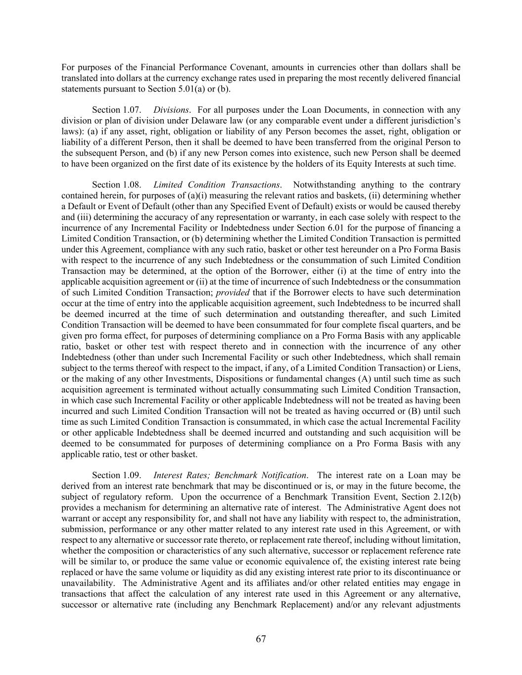 67 For purposes of the Financial Performance Covenant, amounts in currencies other than dollars shall be translated into dollars at the currency exchange rates used in preparing the most recently delivered financial statements pursuant to Section 5.01(a) or (b). Section 1.07. Divisions. For all purposes under the Loan Documents, in connection with any division or plan of division under Delaware law (or any comparable event under a different jurisdiction’s laws): (a) if any asset, right, obligation or liability of any Person becomes the asset, right, obligation or liability of a different Person, then it shall be deemed to have been transferred from the original Person to the subsequent Person, and (b) if any new Person comes into existence, such new Person shall be deemed to have been organized on the first date of its existence by the holders of its Equity Interests at such time. Section 1.08. Limited Condition Transactions. Notwithstanding anything to the contrary contained herein, for purposes of (a)(i) measuring the relevant ratios and baskets, (ii) determining whether a Default or Event of Default (other than any Specified Event of Default) exists or would be caused thereby and (iii) determining the accuracy of any representation or warranty, in each case solely with respect to the incurrence of any Incremental Facility or Indebtedness under Section 6.01 for the purpose of financing a Limited Condition Transaction, or (b) determining whether the Limited Condition Transaction is permitted under this Agreement, compliance with any such ratio, basket or other test hereunder on a Pro Forma Basis with respect to the incurrence of any such Indebtedness or the consummation of such Limited Condition Transaction may be determined, at the option of the Borrower, either (i) at the time of entry into the applicable acquisition agreement or (ii) at the time of incurrence of such Indebtedness or the consummation of such Limited Condition Transaction; provided that if the Borrower elects to have such determination occur at the time of entry into the applicable acquisition agreement, such Indebtedness to be incurred shall be deemed incurred at the time of such determination and outstanding thereafter, and such Limited Condition Transaction will be deemed to have been consummated for four complete fiscal quarters, and be given pro forma effect, for purposes of determining compliance on a Pro Forma Basis with any applicable ratio, basket or other test with respect thereto and in connection with the incurrence of any other Indebtedness (other than under such Incremental Facility or such other Indebtedness, which shall remain subject to the terms thereof with respect to the impact, if any, of a Limited Condition Transaction) or Liens, or the making of any other Investments, Dispositions or fundamental changes (A) until such time as such acquisition agreement is terminated without actually consummating such Limited Condition Transaction, in which case such Incremental Facility or other applicable Indebtedness will not be treated as having been incurred and such Limited Condition Transaction will not be treated as having occurred or (B) until such time as such Limited Condition Transaction is consummated, in which case the actual Incremental Facility or other applicable Indebtedness shall be deemed incurred and outstanding and such acquisition will be deemed to be consummated for purposes of determining compliance on a Pro Forma Basis with any applicable ratio, test or other basket. Section 1.09. Interest Rates; Benchmark Notification. The interest rate on a Loan may be derived from an interest rate benchmark that may be discontinued or is, or may in the future become, the subject of regulatory reform. Upon the occurrence of a Benchmark Transition Event, Section 2.12(b) provides a mechanism for determining an alternative rate of interest. The Administrative Agent does not warrant or accept any responsibility for, and shall not have any liability with respect to, the administration, submission, performance or any other matter related to any interest rate used in this Agreement, or with respect to any alternative or successor rate thereto, or replacement rate thereof, including without limitation, whether the composition or characteristics of any such alternative, successor or replacement reference rate will be similar to, or produce the same value or economic equivalence of, the existing interest rate being replaced or have the same volume or liquidity as did any existing interest rate prior to its discontinuance or unavailability. The Administrative Agent and its affiliates and/or other related entities may engage in transactions that affect the calculation of any interest rate used in this Agreement or any alternative, successor or alternative rate (including any Benchmark Replacement) and/or any relevant adjustments