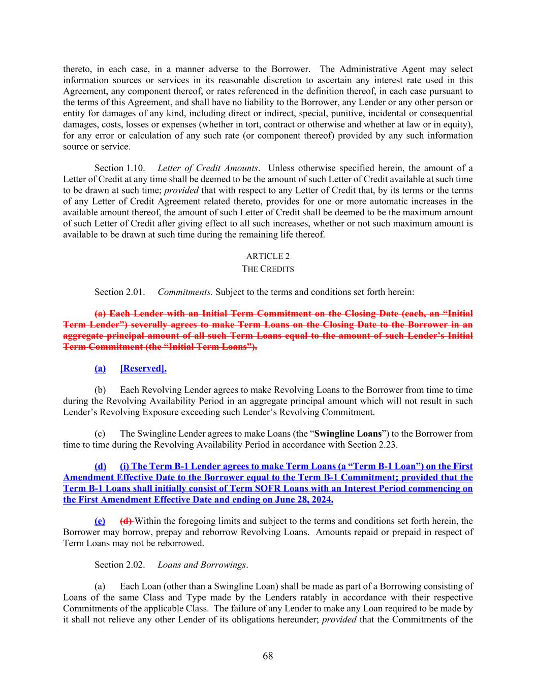 68 thereto, in each case, in a manner adverse to the Borrower. The Administrative Agent may select information sources or services in its reasonable discretion to ascertain any interest rate used in this Agreement, any component thereof, or rates referenced in the definition thereof, in each case pursuant to the terms of this Agreement, and shall have no liability to the Borrower, any Lender or any other person or entity for damages of any kind, including direct or indirect, special, punitive, incidental or consequential damages, costs, losses or expenses (whether in tort, contract or otherwise and whether at law or in equity), for any error or calculation of any such rate (or component thereof) provided by any such information source or service. Section 1.10. Letter of Credit Amounts. Unless otherwise specified herein, the amount of a Letter of Credit at any time shall be deemed to be the amount of such Letter of Credit available at such time to be drawn at such time; provided that with respect to any Letter of Credit that, by its terms or the terms of any Letter of Credit Agreement related thereto, provides for one or more automatic increases in the available amount thereof, the amount of such Letter of Credit shall be deemed to be the maximum amount of such Letter of Credit after giving effect to all such increases, whether or not such maximum amount is available to be drawn at such time during the remaining life thereof. ARTICLE 2 THE CREDITS Section 2.01. Commitments. Subject to the terms and conditions set forth herein: (a) Each Lender with an Initial Term Commitment on the Closing Date (each, an “Initial Term Lender”) severally agrees to make Term Loans on the Closing Date to the Borrower in an aggregate principal amount of all such Term Loans equal to the amount of such Lender’s Initial Term Commitment (the “Initial Term Loans”). (a) [Reserved]. (b) Each Revolving Lender agrees to make Revolving Loans to the Borrower from time to time during the Revolving Availability Period in an aggregate principal amount which will not result in such Lender’s Revolving Exposure exceeding such Lender’s Revolving Commitment. (c) The Swingline Lender agrees to make Loans (the “Swingline Loans”) to the Borrower from time to time during the Revolving Availability Period in accordance with Section 2.23. (d) (i) The Term B-1 Lender agrees to make Term Loans (a “Term B-1 Loan”) on the First Amendment Effective Date to the Borrower equal to the Term B-1 Commitment; provided that the Term B-1 Loans shall initially consist of Term SOFR Loans with an Interest Period commencing on the First Amendment Effective Date and ending on June 28, 2024. (e) (d) Within the foregoing limits and subject to the terms and conditions set forth herein, the Borrower may borrow, prepay and reborrow Revolving Loans. Amounts repaid or prepaid in respect of Term Loans may not be reborrowed. Section 2.02. Loans and Borrowings. (a) Each Loan (other than a Swingline Loan) shall be made as part of a Borrowing consisting of Loans of the same Class and Type made by the Lenders ratably in accordance with their respective Commitments of the applicable Class. The failure of any Lender to make any Loan required to be made by it shall not relieve any other Lender of its obligations hereunder; provided that the Commitments of the