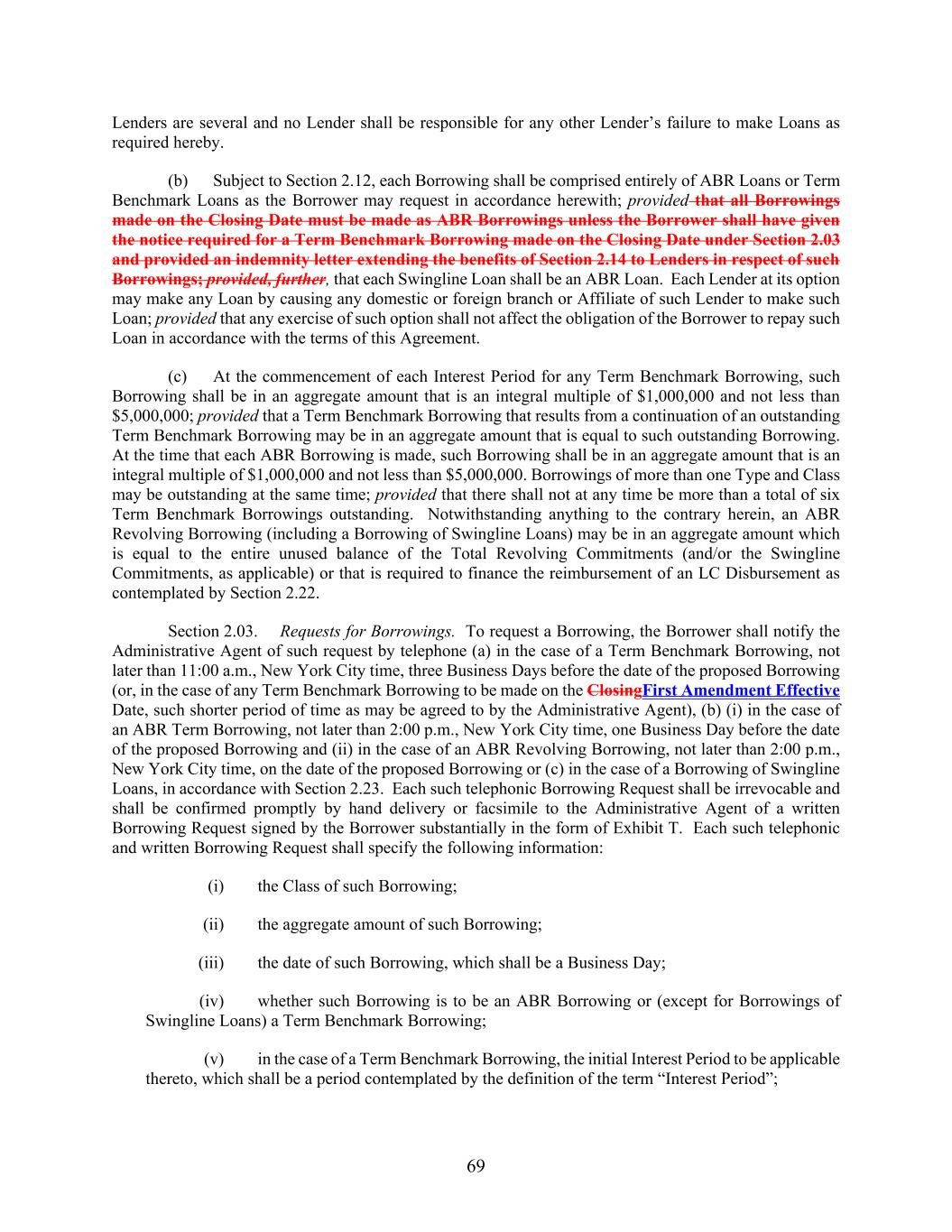 69 Lenders are several and no Lender shall be responsible for any other Lender’s failure to make Loans as required hereby. (b) Subject to Section 2.12, each Borrowing shall be comprised entirely of ABR Loans or Term Benchmark Loans as the Borrower may request in accordance herewith; provided that all Borrowings made on the Closing Date must be made as ABR Borrowings unless the Borrower shall have given the notice required for a Term Benchmark Borrowing made on the Closing Date under Section 2.03 and provided an indemnity letter extending the benefits of Section 2.14 to Lenders in respect of such Borrowings; provided, further, that each Swingline Loan shall be an ABR Loan. Each Lender at its option may make any Loan by causing any domestic or foreign branch or Affiliate of such Lender to make such Loan; provided that any exercise of such option shall not affect the obligation of the Borrower to repay such Loan in accordance with the terms of this Agreement. (c) At the commencement of each Interest Period for any Term Benchmark Borrowing, such Borrowing shall be in an aggregate amount that is an integral multiple of $1,000,000 and not less than $5,000,000; provided that a Term Benchmark Borrowing that results from a continuation of an outstanding Term Benchmark Borrowing may be in an aggregate amount that is equal to such outstanding Borrowing. At the time that each ABR Borrowing is made, such Borrowing shall be in an aggregate amount that is an integral multiple of $1,000,000 and not less than $5,000,000. Borrowings of more than one Type and Class may be outstanding at the same time; provided that there shall not at any time be more than a total of six Term Benchmark Borrowings outstanding. Notwithstanding anything to the contrary herein, an ABR Revolving Borrowing (including a Borrowing of Swingline Loans) may be in an aggregate amount which is equal to the entire unused balance of the Total Revolving Commitments (and/or the Swingline Commitments, as applicable) or that is required to finance the reimbursement of an LC Disbursement as contemplated by Section 2.22. Section 2.03. Requests for Borrowings. To request a Borrowing, the Borrower shall notify the Administrative Agent of such request by telephone (a) in the case of a Term Benchmark Borrowing, not later than 11:00 a.m., New York City time, three Business Days before the date of the proposed Borrowing (or, in the case of any Term Benchmark Borrowing to be made on the ClosingFirst Amendment Effective Date, such shorter period of time as may be agreed to by the Administrative Agent), (b) (i) in the case of an ABR Term Borrowing, not later than 2:00 p.m., New York City time, one Business Day before the date of the proposed Borrowing and (ii) in the case of an ABR Revolving Borrowing, not later than 2:00 p.m., New York City time, on the date of the proposed Borrowing or (c) in the case of a Borrowing of Swingline Loans, in accordance with Section 2.23. Each such telephonic Borrowing Request shall be irrevocable and shall be confirmed promptly by hand delivery or facsimile to the Administrative Agent of a written Borrowing Request signed by the Borrower substantially in the form of Exhibit T. Each such telephonic and written Borrowing Request shall specify the following information: (i) the Class of such Borrowing; (ii) the aggregate amount of such Borrowing; (iii) the date of such Borrowing, which shall be a Business Day; (iv) whether such Borrowing is to be an ABR Borrowing or (except for Borrowings of Swingline Loans) a Term Benchmark Borrowing; (v) in the case of a Term Benchmark Borrowing, the initial Interest Period to be applicable thereto, which shall be a period contemplated by the definition of the term “Interest Period”;