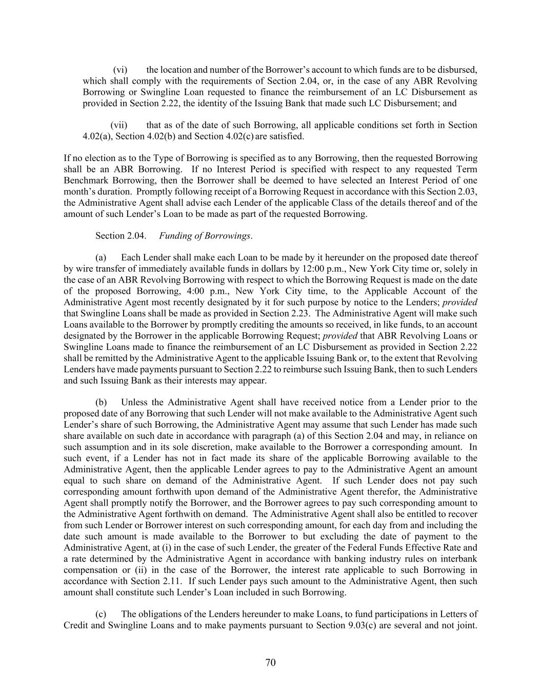 70 (vi) the location and number of the Borrower’s account to which funds are to be disbursed, which shall comply with the requirements of Section 2.04, or, in the case of any ABR Revolving Borrowing or Swingline Loan requested to finance the reimbursement of an LC Disbursement as provided in Section 2.22, the identity of the Issuing Bank that made such LC Disbursement; and (vii) that as of the date of such Borrowing, all applicable conditions set forth in Section 4.02(a), Section 4.02(b) and Section 4.02(c) are satisfied. If no election as to the Type of Borrowing is specified as to any Borrowing, then the requested Borrowing shall be an ABR Borrowing. If no Interest Period is specified with respect to any requested Term Benchmark Borrowing, then the Borrower shall be deemed to have selected an Interest Period of one month’s duration. Promptly following receipt of a Borrowing Request in accordance with this Section 2.03, the Administrative Agent shall advise each Lender of the applicable Class of the details thereof and of the amount of such Lender’s Loan to be made as part of the requested Borrowing. Section 2.04. Funding of Borrowings. (a) Each Lender shall make each Loan to be made by it hereunder on the proposed date thereof by wire transfer of immediately available funds in dollars by 12:00 p.m., New York City time or, solely in the case of an ABR Revolving Borrowing with respect to which the Borrowing Request is made on the date of the proposed Borrowing, 4:00 p.m., New York City time, to the Applicable Account of the Administrative Agent most recently designated by it for such purpose by notice to the Lenders; provided that Swingline Loans shall be made as provided in Section 2.23. The Administrative Agent will make such Loans available to the Borrower by promptly crediting the amounts so received, in like funds, to an account designated by the Borrower in the applicable Borrowing Request; provided that ABR Revolving Loans or Swingline Loans made to finance the reimbursement of an LC Disbursement as provided in Section 2.22 shall be remitted by the Administrative Agent to the applicable Issuing Bank or, to the extent that Revolving Lenders have made payments pursuant to Section 2.22 to reimburse such Issuing Bank, then to such Lenders and such Issuing Bank as their interests may appear. (b) Unless the Administrative Agent shall have received notice from a Lender prior to the proposed date of any Borrowing that such Lender will not make available to the Administrative Agent such Lender’s share of such Borrowing, the Administrative Agent may assume that such Lender has made such share available on such date in accordance with paragraph (a) of this Section 2.04 and may, in reliance on such assumption and in its sole discretion, make available to the Borrower a corresponding amount. In such event, if a Lender has not in fact made its share of the applicable Borrowing available to the Administrative Agent, then the applicable Lender agrees to pay to the Administrative Agent an amount equal to such share on demand of the Administrative Agent. If such Lender does not pay such corresponding amount forthwith upon demand of the Administrative Agent therefor, the Administrative Agent shall promptly notify the Borrower, and the Borrower agrees to pay such corresponding amount to the Administrative Agent forthwith on demand. The Administrative Agent shall also be entitled to recover from such Lender or Borrower interest on such corresponding amount, for each day from and including the date such amount is made available to the Borrower to but excluding the date of payment to the Administrative Agent, at (i) in the case of such Lender, the greater of the Federal Funds Effective Rate and a rate determined by the Administrative Agent in accordance with banking industry rules on interbank compensation or (ii) in the case of the Borrower, the interest rate applicable to such Borrowing in accordance with Section 2.11. If such Lender pays such amount to the Administrative Agent, then such amount shall constitute such Lender’s Loan included in such Borrowing. (c) The obligations of the Lenders hereunder to make Loans, to fund participations in Letters of Credit and Swingline Loans and to make payments pursuant to Section 9.03(c) are several and not joint.