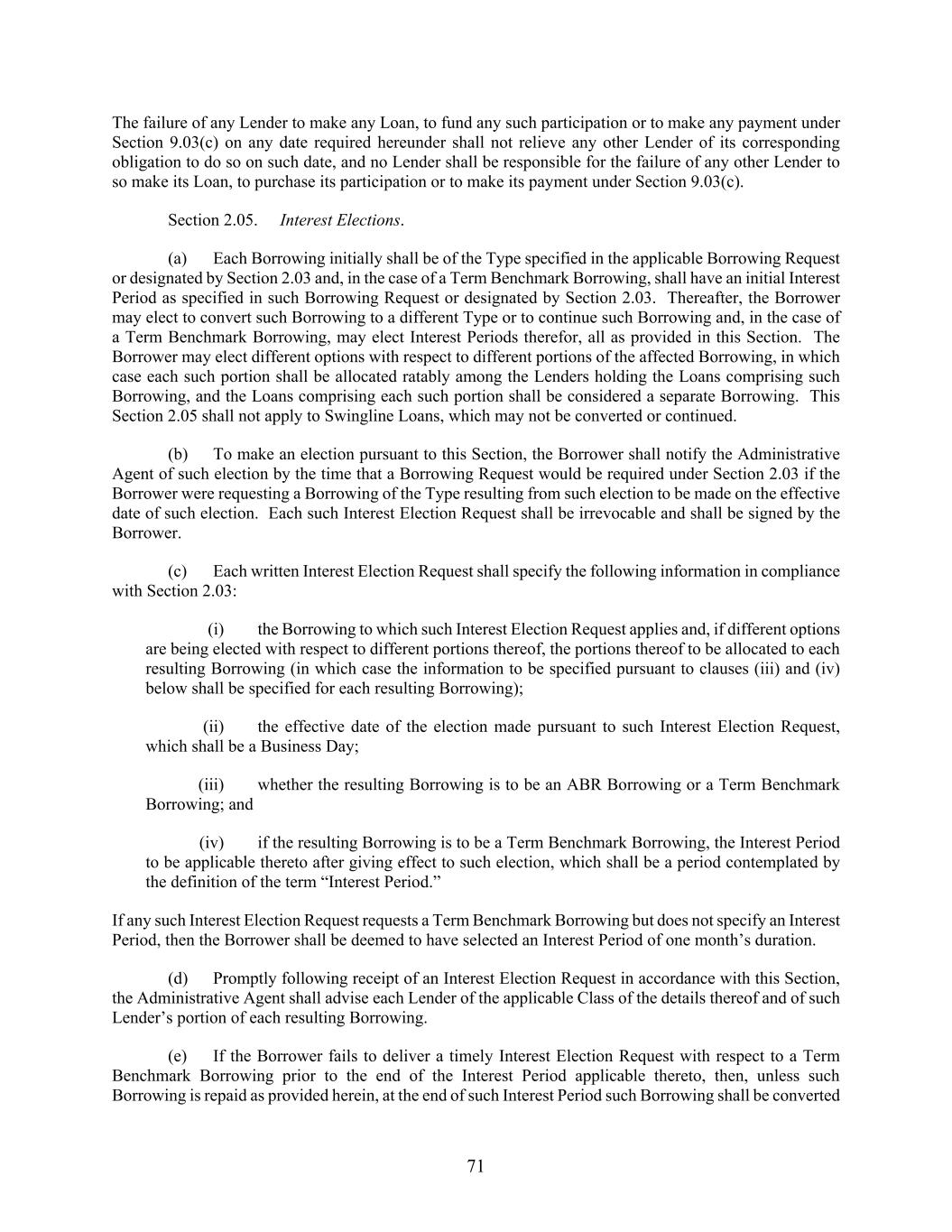 71 The failure of any Lender to make any Loan, to fund any such participation or to make any payment under Section 9.03(c) on any date required hereunder shall not relieve any other Lender of its corresponding obligation to do so on such date, and no Lender shall be responsible for the failure of any other Lender to so make its Loan, to purchase its participation or to make its payment under Section 9.03(c). Section 2.05. Interest Elections. (a) Each Borrowing initially shall be of the Type specified in the applicable Borrowing Request or designated by Section 2.03 and, in the case of a Term Benchmark Borrowing, shall have an initial Interest Period as specified in such Borrowing Request or designated by Section 2.03. Thereafter, the Borrower may elect to convert such Borrowing to a different Type or to continue such Borrowing and, in the case of a Term Benchmark Borrowing, may elect Interest Periods therefor, all as provided in this Section. The Borrower may elect different options with respect to different portions of the affected Borrowing, in which case each such portion shall be allocated ratably among the Lenders holding the Loans comprising such Borrowing, and the Loans comprising each such portion shall be considered a separate Borrowing. This Section 2.05 shall not apply to Swingline Loans, which may not be converted or continued. (b) To make an election pursuant to this Section, the Borrower shall notify the Administrative Agent of such election by the time that a Borrowing Request would be required under Section 2.03 if the Borrower were requesting a Borrowing of the Type resulting from such election to be made on the effective date of such election. Each such Interest Election Request shall be irrevocable and shall be signed by the Borrower. (c) Each written Interest Election Request shall specify the following information in compliance with Section 2.03: (i) the Borrowing to which such Interest Election Request applies and, if different options are being elected with respect to different portions thereof, the portions thereof to be allocated to each resulting Borrowing (in which case the information to be specified pursuant to clauses (iii) and (iv) below shall be specified for each resulting Borrowing); (ii) the effective date of the election made pursuant to such Interest Election Request, which shall be a Business Day; (iii) whether the resulting Borrowing is to be an ABR Borrowing or a Term Benchmark Borrowing; and (iv) if the resulting Borrowing is to be a Term Benchmark Borrowing, the Interest Period to be applicable thereto after giving effect to such election, which shall be a period contemplated by the definition of the term “Interest Period.” If any such Interest Election Request requests a Term Benchmark Borrowing but does not specify an Interest Period, then the Borrower shall be deemed to have selected an Interest Period of one month’s duration. (d) Promptly following receipt of an Interest Election Request in accordance with this Section, the Administrative Agent shall advise each Lender of the applicable Class of the details thereof and of such Lender’s portion of each resulting Borrowing. (e) If the Borrower fails to deliver a timely Interest Election Request with respect to a Term Benchmark Borrowing prior to the end of the Interest Period applicable thereto, then, unless such Borrowing is repaid as provided herein, at the end of such Interest Period such Borrowing shall be converted