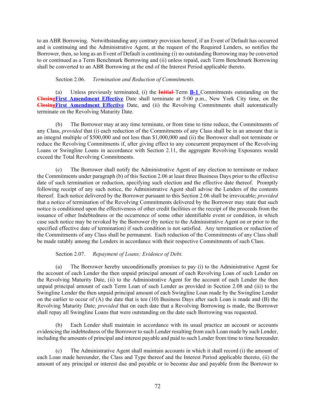 72 to an ABR Borrowing. Notwithstanding any contrary provision hereof, if an Event of Default has occurred and is continuing and the Administrative Agent, at the request of the Required Lenders, so notifies the Borrower, then, so long as an Event of Default is continuing (i) no outstanding Borrowing may be converted to or continued as a Term Benchmark Borrowing and (ii) unless repaid, each Term Benchmark Borrowing shall be converted to an ABR Borrowing at the end of the Interest Period applicable thereto. Section 2.06. Termination and Reduction of Commitments. (a) Unless previously terminated, (i) the Initial Term B-1 Commitments outstanding on the ClosingFirst Amendment Effective Date shall terminate at 5:00 p.m., New York City time, on the ClosingFirst Amendment Effective Date, and (ii) the Revolving Commitments shall automatically terminate on the Revolving Maturity Date. (b) The Borrower may at any time terminate, or from time to time reduce, the Commitments of any Class, provided that (i) each reduction of the Commitments of any Class shall be in an amount that is an integral multiple of $500,000 and not less than $1,000,000 and (ii) the Borrower shall not terminate or reduce the Revolving Commitments if, after giving effect to any concurrent prepayment of the Revolving Loans or Swingline Loans in accordance with Section 2.11, the aggregate Revolving Exposures would exceed the Total Revolving Commitments. (c) The Borrower shall notify the Administrative Agent of any election to terminate or reduce the Commitments under paragraph (b) of this Section 2.06 at least three Business Days prior to the effective date of such termination or reduction, specifying such election and the effective date thereof. Promptly following receipt of any such notice, the Administrative Agent shall advise the Lenders of the contents thereof. Each notice delivered by the Borrower pursuant to this Section 2.06 shall be irrevocable; provided that a notice of termination of the Revolving Commitments delivered by the Borrower may state that such notice is conditioned upon the effectiveness of other credit facilities or the receipt of the proceeds from the issuance of other Indebtedness or the occurrence of some other identifiable event or condition, in which case such notice may be revoked by the Borrower (by notice to the Administrative Agent on or prior to the specified effective date of termination) if such condition is not satisfied. Any termination or reduction of the Commitments of any Class shall be permanent. Each reduction of the Commitments of any Class shall be made ratably among the Lenders in accordance with their respective Commitments of such Class. Section 2.07. Repayment of Loans; Evidence of Debt. (a) The Borrower hereby unconditionally promises to pay (i) to the Administrative Agent for the account of each Lender the then unpaid principal amount of each Revolving Loan of such Lender on the Revolving Maturity Date, (ii) to the Administrative Agent for the account of each Lender the then unpaid principal amount of each Term Loan of such Lender as provided in Section 2.08 and (iii) to the Swingline Lender the then unpaid principal amount of each Swingline Loan made by the Swingline Lender on the earlier to occur of (A) the date that is ten (10) Business Days after such Loan is made and (B) the Revolving Maturity Date; provided that on each date that a Revolving Borrowing is made, the Borrower shall repay all Swingline Loans that were outstanding on the date such Borrowing was requested. (b) Each Lender shall maintain in accordance with its usual practice an account or accounts evidencing the indebtedness of the Borrower to such Lender resulting from each Loan made by such Lender, including the amounts of principal and interest payable and paid to such Lender from time to time hereunder. (c) The Administrative Agent shall maintain accounts in which it shall record (i) the amount of each Loan made hereunder, the Class and Type thereof and the Interest Period applicable thereto, (ii) the amount of any principal or interest due and payable or to become due and payable from the Borrower to