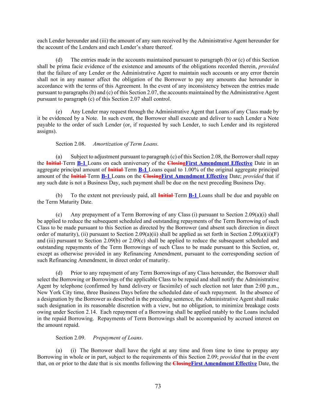 73 each Lender hereunder and (iii) the amount of any sum received by the Administrative Agent hereunder for the account of the Lenders and each Lender’s share thereof. (d) The entries made in the accounts maintained pursuant to paragraph (b) or (c) of this Section shall be prima facie evidence of the existence and amounts of the obligations recorded therein, provided that the failure of any Lender or the Administrative Agent to maintain such accounts or any error therein shall not in any manner affect the obligation of the Borrower to pay any amounts due hereunder in accordance with the terms of this Agreement. In the event of any inconsistency between the entries made pursuant to paragraphs (b) and (c) of this Section 2.07, the accounts maintained by the Administrative Agent pursuant to paragraph (c) of this Section 2.07 shall control. (e) Any Lender may request through the Administrative Agent that Loans of any Class made by it be evidenced by a Note. In such event, the Borrower shall execute and deliver to such Lender a Note payable to the order of such Lender (or, if requested by such Lender, to such Lender and its registered assigns). Section 2.08. Amortization of Term Loans. (a) Subject to adjustment pursuant to paragraph (c) of this Section 2.08, the Borrower shall repay the Initial Term B-1 Loans on each anniversary of the ClosingFirst Amendment Effective Date in an aggregate principal amount of Initial Term B-1 Loans equal to 1.00% of the original aggregate principal amount of the Initial Term B-1 Loans on the ClosingFirst Amendment Effective Date; provided that if any such date is not a Business Day, such payment shall be due on the next preceding Business Day. (b) To the extent not previously paid, all Initial Term B-1 Loans shall be due and payable on the Term Maturity Date. (c) Any prepayment of a Term Borrowing of any Class (i) pursuant to Section 2.09(a)(i) shall be applied to reduce the subsequent scheduled and outstanding repayments of the Term Borrowing of such Class to be made pursuant to this Section as directed by the Borrower (and absent such direction in direct order of maturity), (ii) pursuant to Section 2.09(a)(ii) shall be applied as set forth in Section 2.09(a)(ii)(F) and (iii) pursuant to Section 2.09(b) or 2.09(c) shall be applied to reduce the subsequent scheduled and outstanding repayments of the Term Borrowings of such Class to be made pursuant to this Section, or, except as otherwise provided in any Refinancing Amendment, pursuant to the corresponding section of such Refinancing Amendment, in direct order of maturity. (d) Prior to any repayment of any Term Borrowings of any Class hereunder, the Borrower shall select the Borrowing or Borrowings of the applicable Class to be repaid and shall notify the Administrative Agent by telephone (confirmed by hand delivery or facsimile) of such election not later than 2:00 p.m., New York City time, three Business Days before the scheduled date of such repayment. In the absence of a designation by the Borrower as described in the preceding sentence, the Administrative Agent shall make such designation in its reasonable discretion with a view, but no obligation, to minimize breakage costs owing under Section 2.14. Each repayment of a Borrowing shall be applied ratably to the Loans included in the repaid Borrowing. Repayments of Term Borrowings shall be accompanied by accrued interest on the amount repaid. Section 2.09. Prepayment of Loans. (a) (i) The Borrower shall have the right at any time and from time to time to prepay any Borrowing in whole or in part, subject to the requirements of this Section 2.09; provided that in the event that, on or prior to the date that is six months following the ClosingFirst Amendment Effective Date, the