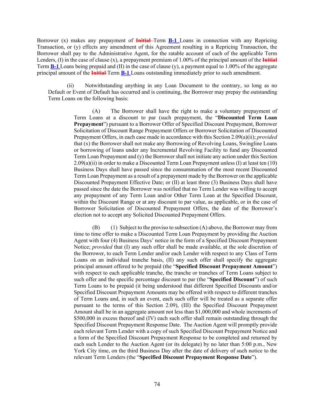 74 Borrower (x) makes any prepayment of Initial Term B-1 Loans in connection with any Repricing Transaction, or (y) effects any amendment of this Agreement resulting in a Repricing Transaction, the Borrower shall pay to the Administrative Agent, for the ratable account of each of the applicable Term Lenders, (I) in the case of clause (x), a prepayment premium of 1.00% of the principal amount of the Initial Term B-1 Loans being prepaid and (II) in the case of clause (y), a payment equal to 1.00% of the aggregate principal amount of the Initial Term B-1 Loans outstanding immediately prior to such amendment. (ii) Notwithstanding anything in any Loan Document to the contrary, so long as no Default or Event of Default has occurred and is continuing, the Borrower may prepay the outstanding Term Loans on the following basis: (A) The Borrower shall have the right to make a voluntary prepayment of Term Loans at a discount to par (such prepayment, the “Discounted Term Loan Prepayment”) pursuant to a Borrower Offer of Specified Discount Prepayment, Borrower Solicitation of Discount Range Prepayment Offers or Borrower Solicitation of Discounted Prepayment Offers, in each case made in accordance with this Section 2.09(a)(ii); provided that (x) the Borrower shall not make any Borrowing of Revolving Loans, Swingline Loans or borrowing of loans under any Incremental Revolving Facility to fund any Discounted Term Loan Prepayment and (y) the Borrower shall not initiate any action under this Section 2.09(a)(ii) in order to make a Discounted Term Loan Prepayment unless (I) at least ten (10) Business Days shall have passed since the consummation of the most recent Discounted Term Loan Prepayment as a result of a prepayment made by the Borrower on the applicable Discounted Prepayment Effective Date; or (II) at least three (3) Business Days shall have passed since the date the Borrower was notified that no Term Lender was willing to accept any prepayment of any Term Loan and/or Other Term Loan at the Specified Discount, within the Discount Range or at any discount to par value, as applicable, or in the case of Borrower Solicitation of Discounted Prepayment Offers, the date of the Borrower’s election not to accept any Solicited Discounted Prepayment Offers. (B) (1) Subject to the proviso to subsection (A) above, the Borrower may from time to time offer to make a Discounted Term Loan Prepayment by providing the Auction Agent with four (4) Business Days’ notice in the form of a Specified Discount Prepayment Notice; provided that (I) any such offer shall be made available, at the sole discretion of the Borrower, to each Term Lender and/or each Lender with respect to any Class of Term Loans on an individual tranche basis, (II) any such offer shall specify the aggregate principal amount offered to be prepaid (the “Specified Discount Prepayment Amount”) with respect to each applicable tranche, the tranche or tranches of Term Loans subject to such offer and the specific percentage discount to par (the “Specified Discount”) of such Term Loans to be prepaid (it being understood that different Specified Discounts and/or Specified Discount Prepayment Amounts may be offered with respect to different tranches of Term Loans and, in such an event, each such offer will be treated as a separate offer pursuant to the terms of this Section 2.09), (III) the Specified Discount Prepayment Amount shall be in an aggregate amount not less than $1,000,000 and whole increments of $500,000 in excess thereof and (IV) each such offer shall remain outstanding through the Specified Discount Prepayment Response Date. The Auction Agent will promptly provide each relevant Term Lender with a copy of such Specified Discount Prepayment Notice and a form of the Specified Discount Prepayment Response to be completed and returned by each such Lender to the Auction Agent (or its delegate) by no later than 5:00 p.m., New York City time, on the third Business Day after the date of delivery of such notice to the relevant Term Lenders (the “Specified Discount Prepayment Response Date”).