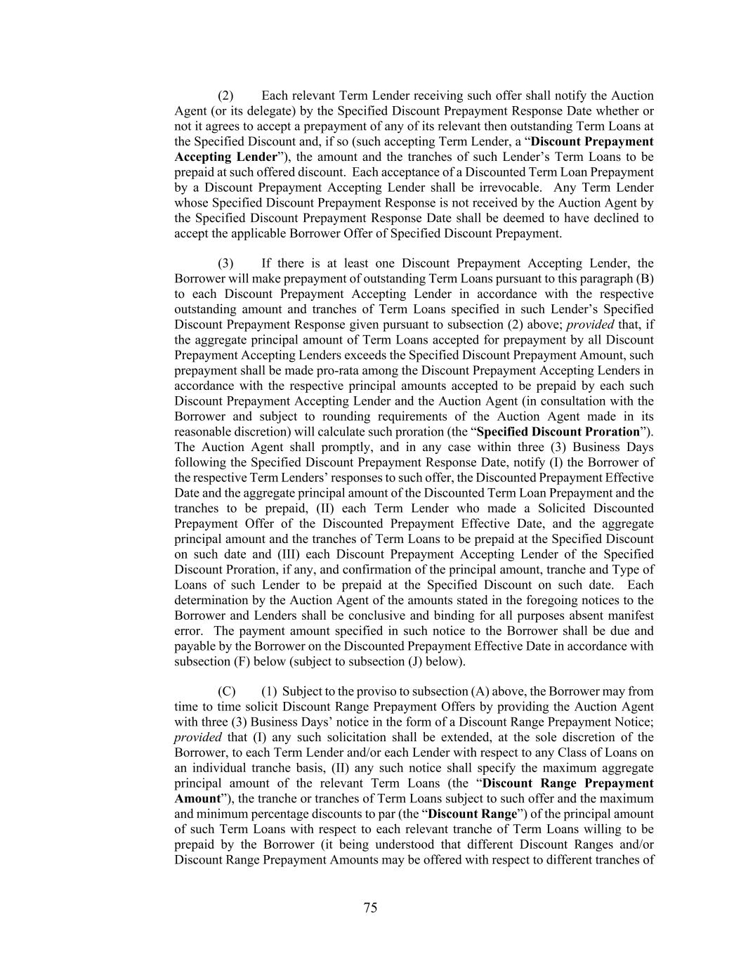75 (2) Each relevant Term Lender receiving such offer shall notify the Auction Agent (or its delegate) by the Specified Discount Prepayment Response Date whether or not it agrees to accept a prepayment of any of its relevant then outstanding Term Loans at the Specified Discount and, if so (such accepting Term Lender, a “Discount Prepayment Accepting Lender”), the amount and the tranches of such Lender’s Term Loans to be prepaid at such offered discount. Each acceptance of a Discounted Term Loan Prepayment by a Discount Prepayment Accepting Lender shall be irrevocable. Any Term Lender whose Specified Discount Prepayment Response is not received by the Auction Agent by the Specified Discount Prepayment Response Date shall be deemed to have declined to accept the applicable Borrower Offer of Specified Discount Prepayment. (3) If there is at least one Discount Prepayment Accepting Lender, the Borrower will make prepayment of outstanding Term Loans pursuant to this paragraph (B) to each Discount Prepayment Accepting Lender in accordance with the respective outstanding amount and tranches of Term Loans specified in such Lender’s Specified Discount Prepayment Response given pursuant to subsection (2) above; provided that, if the aggregate principal amount of Term Loans accepted for prepayment by all Discount Prepayment Accepting Lenders exceeds the Specified Discount Prepayment Amount, such prepayment shall be made pro-rata among the Discount Prepayment Accepting Lenders in accordance with the respective principal amounts accepted to be prepaid by each such Discount Prepayment Accepting Lender and the Auction Agent (in consultation with the Borrower and subject to rounding requirements of the Auction Agent made in its reasonable discretion) will calculate such proration (the “Specified Discount Proration”). The Auction Agent shall promptly, and in any case within three (3) Business Days following the Specified Discount Prepayment Response Date, notify (I) the Borrower of the respective Term Lenders’ responses to such offer, the Discounted Prepayment Effective Date and the aggregate principal amount of the Discounted Term Loan Prepayment and the tranches to be prepaid, (II) each Term Lender who made a Solicited Discounted Prepayment Offer of the Discounted Prepayment Effective Date, and the aggregate principal amount and the tranches of Term Loans to be prepaid at the Specified Discount on such date and (III) each Discount Prepayment Accepting Lender of the Specified Discount Proration, if any, and confirmation of the principal amount, tranche and Type of Loans of such Lender to be prepaid at the Specified Discount on such date. Each determination by the Auction Agent of the amounts stated in the foregoing notices to the Borrower and Lenders shall be conclusive and binding for all purposes absent manifest error. The payment amount specified in such notice to the Borrower shall be due and payable by the Borrower on the Discounted Prepayment Effective Date in accordance with subsection (F) below (subject to subsection (J) below). (C) (1) Subject to the proviso to subsection (A) above, the Borrower may from time to time solicit Discount Range Prepayment Offers by providing the Auction Agent with three (3) Business Days’ notice in the form of a Discount Range Prepayment Notice; provided that (I) any such solicitation shall be extended, at the sole discretion of the Borrower, to each Term Lender and/or each Lender with respect to any Class of Loans on an individual tranche basis, (II) any such notice shall specify the maximum aggregate principal amount of the relevant Term Loans (the “Discount Range Prepayment Amount”), the tranche or tranches of Term Loans subject to such offer and the maximum and minimum percentage discounts to par (the “Discount Range”) of the principal amount of such Term Loans with respect to each relevant tranche of Term Loans willing to be prepaid by the Borrower (it being understood that different Discount Ranges and/or Discount Range Prepayment Amounts may be offered with respect to different tranches of