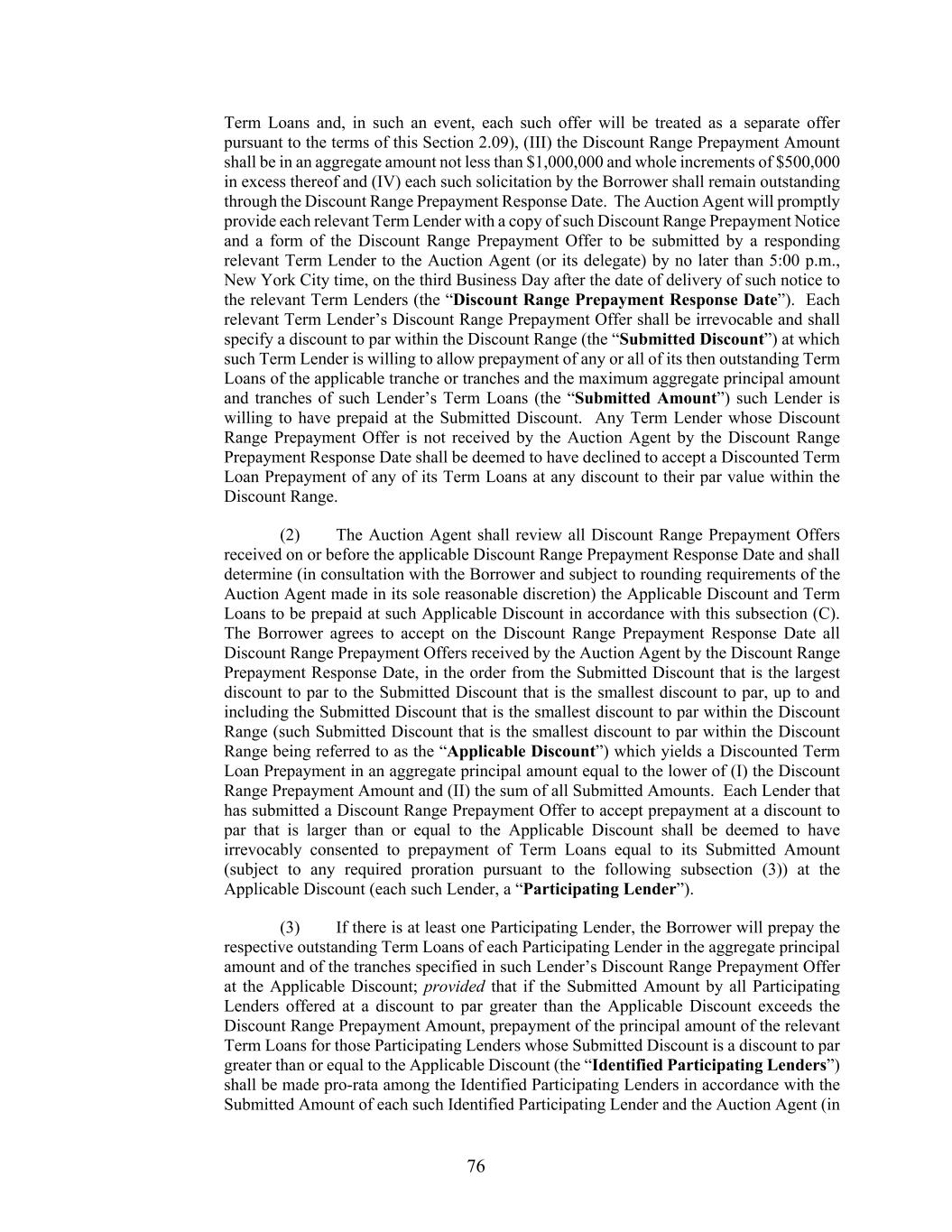 76 Term Loans and, in such an event, each such offer will be treated as a separate offer pursuant to the terms of this Section 2.09), (III) the Discount Range Prepayment Amount shall be in an aggregate amount not less than $1,000,000 and whole increments of $500,000 in excess thereof and (IV) each such solicitation by the Borrower shall remain outstanding through the Discount Range Prepayment Response Date. The Auction Agent will promptly provide each relevant Term Lender with a copy of such Discount Range Prepayment Notice and a form of the Discount Range Prepayment Offer to be submitted by a responding relevant Term Lender to the Auction Agent (or its delegate) by no later than 5:00 p.m., New York City time, on the third Business Day after the date of delivery of such notice to the relevant Term Lenders (the “Discount Range Prepayment Response Date”). Each relevant Term Lender’s Discount Range Prepayment Offer shall be irrevocable and shall specify a discount to par within the Discount Range (the “Submitted Discount”) at which such Term Lender is willing to allow prepayment of any or all of its then outstanding Term Loans of the applicable tranche or tranches and the maximum aggregate principal amount and tranches of such Lender’s Term Loans (the “Submitted Amount”) such Lender is willing to have prepaid at the Submitted Discount. Any Term Lender whose Discount Range Prepayment Offer is not received by the Auction Agent by the Discount Range Prepayment Response Date shall be deemed to have declined to accept a Discounted Term Loan Prepayment of any of its Term Loans at any discount to their par value within the Discount Range. (2) The Auction Agent shall review all Discount Range Prepayment Offers received on or before the applicable Discount Range Prepayment Response Date and shall determine (in consultation with the Borrower and subject to rounding requirements of the Auction Agent made in its sole reasonable discretion) the Applicable Discount and Term Loans to be prepaid at such Applicable Discount in accordance with this subsection (C). The Borrower agrees to accept on the Discount Range Prepayment Response Date all Discount Range Prepayment Offers received by the Auction Agent by the Discount Range Prepayment Response Date, in the order from the Submitted Discount that is the largest discount to par to the Submitted Discount that is the smallest discount to par, up to and including the Submitted Discount that is the smallest discount to par within the Discount Range (such Submitted Discount that is the smallest discount to par within the Discount Range being referred to as the “Applicable Discount”) which yields a Discounted Term Loan Prepayment in an aggregate principal amount equal to the lower of (I) the Discount Range Prepayment Amount and (II) the sum of all Submitted Amounts. Each Lender that has submitted a Discount Range Prepayment Offer to accept prepayment at a discount to par that is larger than or equal to the Applicable Discount shall be deemed to have irrevocably consented to prepayment of Term Loans equal to its Submitted Amount (subject to any required proration pursuant to the following subsection (3)) at the Applicable Discount (each such Lender, a “Participating Lender”). (3) If there is at least one Participating Lender, the Borrower will prepay the respective outstanding Term Loans of each Participating Lender in the aggregate principal amount and of the tranches specified in such Lender’s Discount Range Prepayment Offer at the Applicable Discount; provided that if the Submitted Amount by all Participating Lenders offered at a discount to par greater than the Applicable Discount exceeds the Discount Range Prepayment Amount, prepayment of the principal amount of the relevant Term Loans for those Participating Lenders whose Submitted Discount is a discount to par greater than or equal to the Applicable Discount (the “Identified Participating Lenders”) shall be made pro-rata among the Identified Participating Lenders in accordance with the Submitted Amount of each such Identified Participating Lender and the Auction Agent (in