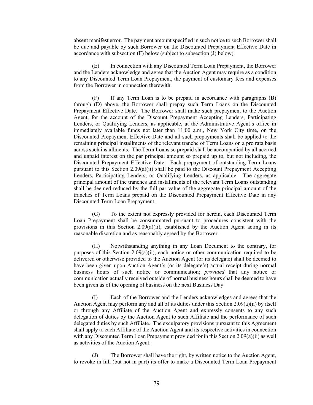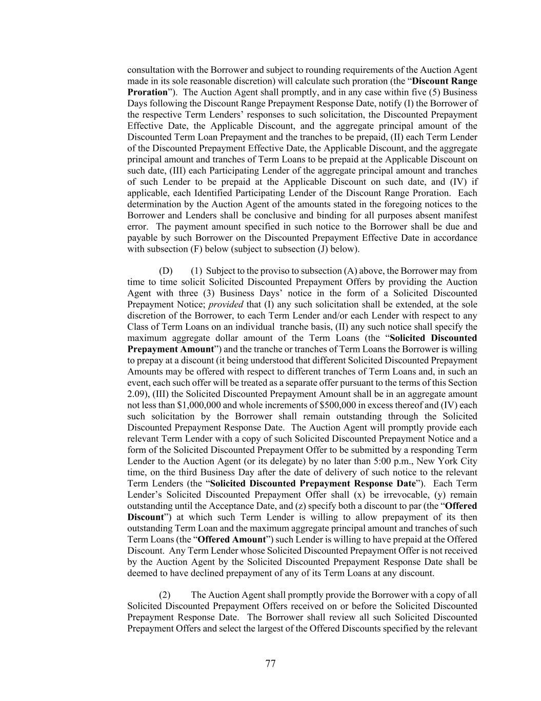 77 consultation with the Borrower and subject to rounding requirements of the Auction Agent made in its sole reasonable discretion) will calculate such proration (the “Discount Range Proration”). The Auction Agent shall promptly, and in any case within five (5) Business Days following the Discount Range Prepayment Response Date, notify (I) the Borrower of the respective Term Lenders’ responses to such solicitation, the Discounted Prepayment Effective Date, the Applicable Discount, and the aggregate principal amount of the Discounted Term Loan Prepayment and the tranches to be prepaid, (II) each Term Lender of the Discounted Prepayment Effective Date, the Applicable Discount, and the aggregate principal amount and tranches of Term Loans to be prepaid at the Applicable Discount on such date, (III) each Participating Lender of the aggregate principal amount and tranches of such Lender to be prepaid at the Applicable Discount on such date, and (IV) if applicable, each Identified Participating Lender of the Discount Range Proration. Each determination by the Auction Agent of the amounts stated in the foregoing notices to the Borrower and Lenders shall be conclusive and binding for all purposes absent manifest error. The payment amount specified in such notice to the Borrower shall be due and payable by such Borrower on the Discounted Prepayment Effective Date in accordance with subsection (F) below (subject to subsection (J) below). (D) (1) Subject to the proviso to subsection (A) above, the Borrower may from time to time solicit Solicited Discounted Prepayment Offers by providing the Auction Agent with three (3) Business Days’ notice in the form of a Solicited Discounted Prepayment Notice; provided that (I) any such solicitation shall be extended, at the sole discretion of the Borrower, to each Term Lender and/or each Lender with respect to any Class of Term Loans on an individual tranche basis, (II) any such notice shall specify the maximum aggregate dollar amount of the Term Loans (the “Solicited Discounted Prepayment Amount”) and the tranche or tranches of Term Loans the Borrower is willing to prepay at a discount (it being understood that different Solicited Discounted Prepayment Amounts may be offered with respect to different tranches of Term Loans and, in such an event, each such offer will be treated as a separate offer pursuant to the terms of this Section 2.09), (III) the Solicited Discounted Prepayment Amount shall be in an aggregate amount not less than $1,000,000 and whole increments of $500,000 in excess thereof and (IV) each such solicitation by the Borrower shall remain outstanding through the Solicited Discounted Prepayment Response Date. The Auction Agent will promptly provide each relevant Term Lender with a copy of such Solicited Discounted Prepayment Notice and a form of the Solicited Discounted Prepayment Offer to be submitted by a responding Term Lender to the Auction Agent (or its delegate) by no later than 5:00 p.m., New York City time, on the third Business Day after the date of delivery of such notice to the relevant Term Lenders (the “Solicited Discounted Prepayment Response Date”). Each Term Lender’s Solicited Discounted Prepayment Offer shall (x) be irrevocable, (y) remain outstanding until the Acceptance Date, and (z) specify both a discount to par (the “Offered Discount”) at which such Term Lender is willing to allow prepayment of its then outstanding Term Loan and the maximum aggregate principal amount and tranches of such Term Loans (the “Offered Amount”) such Lender is willing to have prepaid at the Offered Discount. Any Term Lender whose Solicited Discounted Prepayment Offer is not received by the Auction Agent by the Solicited Discounted Prepayment Response Date shall be deemed to have declined prepayment of any of its Term Loans at any discount. (2) The Auction Agent shall promptly provide the Borrower with a copy of all Solicited Discounted Prepayment Offers received on or before the Solicited Discounted Prepayment Response Date. The Borrower shall review all such Solicited Discounted Prepayment Offers and select the largest of the Offered Discounts specified by the relevant