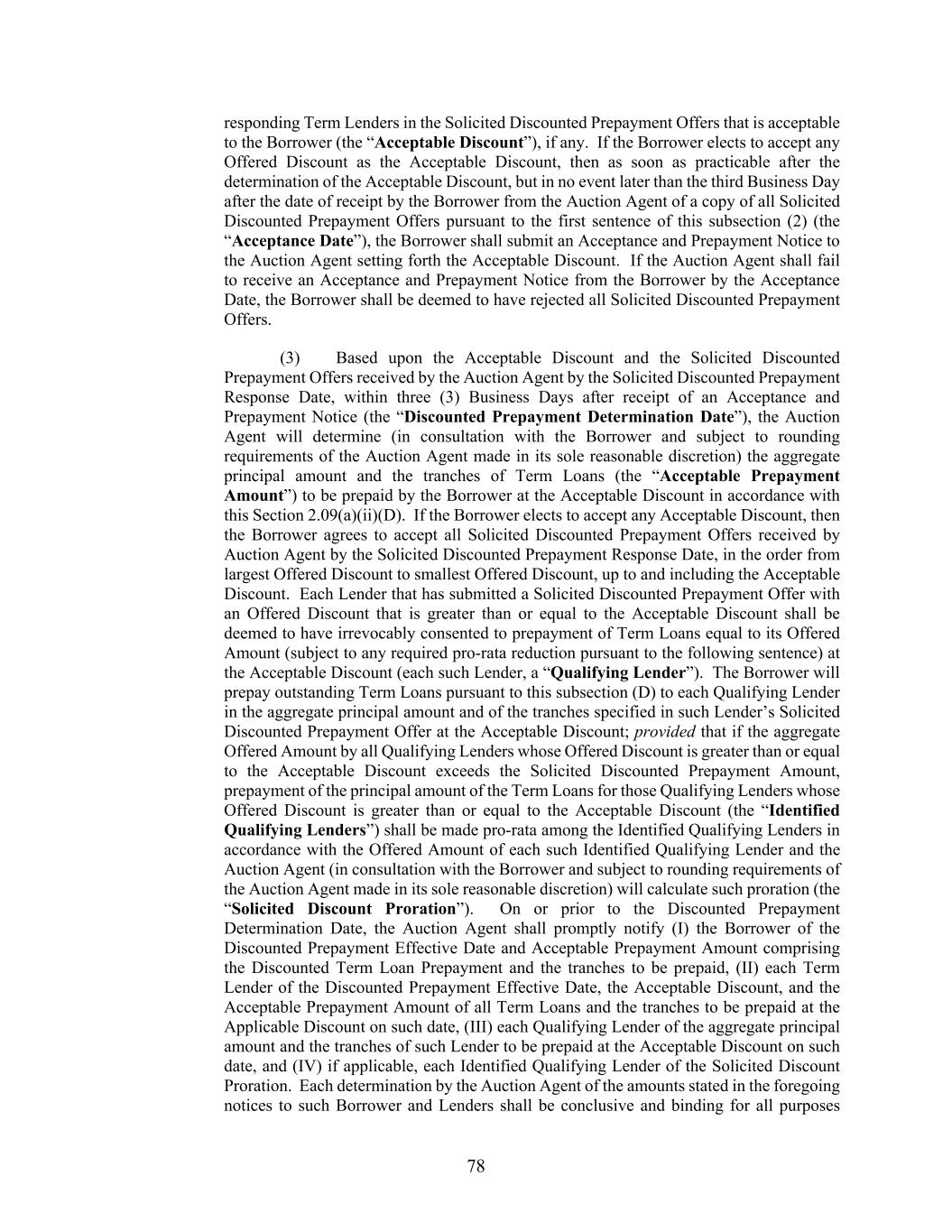 78 responding Term Lenders in the Solicited Discounted Prepayment Offers that is acceptable to the Borrower (the “Acceptable Discount”), if any. If the Borrower elects to accept any Offered Discount as the Acceptable Discount, then as soon as practicable after the determination of the Acceptable Discount, but in no event later than the third Business Day after the date of receipt by the Borrower from the Auction Agent of a copy of all Solicited Discounted Prepayment Offers pursuant to the first sentence of this subsection (2) (the “Acceptance Date”), the Borrower shall submit an Acceptance and Prepayment Notice to the Auction Agent setting forth the Acceptable Discount. If the Auction Agent shall fail to receive an Acceptance and Prepayment Notice from the Borrower by the Acceptance Date, the Borrower shall be deemed to have rejected all Solicited Discounted Prepayment Offers. (3) Based upon the Acceptable Discount and the Solicited Discounted Prepayment Offers received by the Auction Agent by the Solicited Discounted Prepayment Response Date, within three (3) Business Days after receipt of an Acceptance and Prepayment Notice (the “Discounted Prepayment Determination Date”), the Auction Agent will determine (in consultation with the Borrower and subject to rounding requirements of the Auction Agent made in its sole reasonable discretion) the aggregate principal amount and the tranches of Term Loans (the “Acceptable Prepayment Amount”) to be prepaid by the Borrower at the Acceptable Discount in accordance with this Section 2.09(a)(ii)(D). If the Borrower elects to accept any Acceptable Discount, then the Borrower agrees to accept all Solicited Discounted Prepayment Offers received by Auction Agent by the Solicited Discounted Prepayment Response Date, in the order from largest Offered Discount to smallest Offered Discount, up to and including the Acceptable Discount. Each Lender that has submitted a Solicited Discounted Prepayment Offer with an Offered Discount that is greater than or equal to the Acceptable Discount shall be deemed to have irrevocably consented to prepayment of Term Loans equal to its Offered Amount (subject to any required pro-rata reduction pursuant to the following sentence) at the Acceptable Discount (each such Lender, a “Qualifying Lender”). The Borrower will prepay outstanding Term Loans pursuant to this subsection (D) to each Qualifying Lender in the aggregate principal amount and of the tranches specified in such Lender’s Solicited Discounted Prepayment Offer at the Acceptable Discount; provided that if the aggregate Offered Amount by all Qualifying Lenders whose Offered Discount is greater than or equal to the Acceptable Discount exceeds the Solicited Discounted Prepayment Amount, prepayment of the principal amount of the Term Loans for those Qualifying Lenders whose Offered Discount is greater than or equal to the Acceptable Discount (the “Identified Qualifying Lenders”) shall be made pro-rata among the Identified Qualifying Lenders in accordance with the Offered Amount of each such Identified Qualifying Lender and the Auction Agent (in consultation with the Borrower and subject to rounding requirements of the Auction Agent made in its sole reasonable discretion) will calculate such proration (the “Solicited Discount Proration”). On or prior to the Discounted Prepayment Determination Date, the Auction Agent shall promptly notify (I) the Borrower of the Discounted Prepayment Effective Date and Acceptable Prepayment Amount comprising the Discounted Term Loan Prepayment and the tranches to be prepaid, (II) each Term Lender of the Discounted Prepayment Effective Date, the Acceptable Discount, and the Acceptable Prepayment Amount of all Term Loans and the tranches to be prepaid at the Applicable Discount on such date, (III) each Qualifying Lender of the aggregate principal amount and the tranches of such Lender to be prepaid at the Acceptable Discount on such date, and (IV) if applicable, each Identified Qualifying Lender of the Solicited Discount Proration. Each determination by the Auction Agent of the amounts stated in the foregoing notices to such Borrower and Lenders shall be conclusive and binding for all purposes