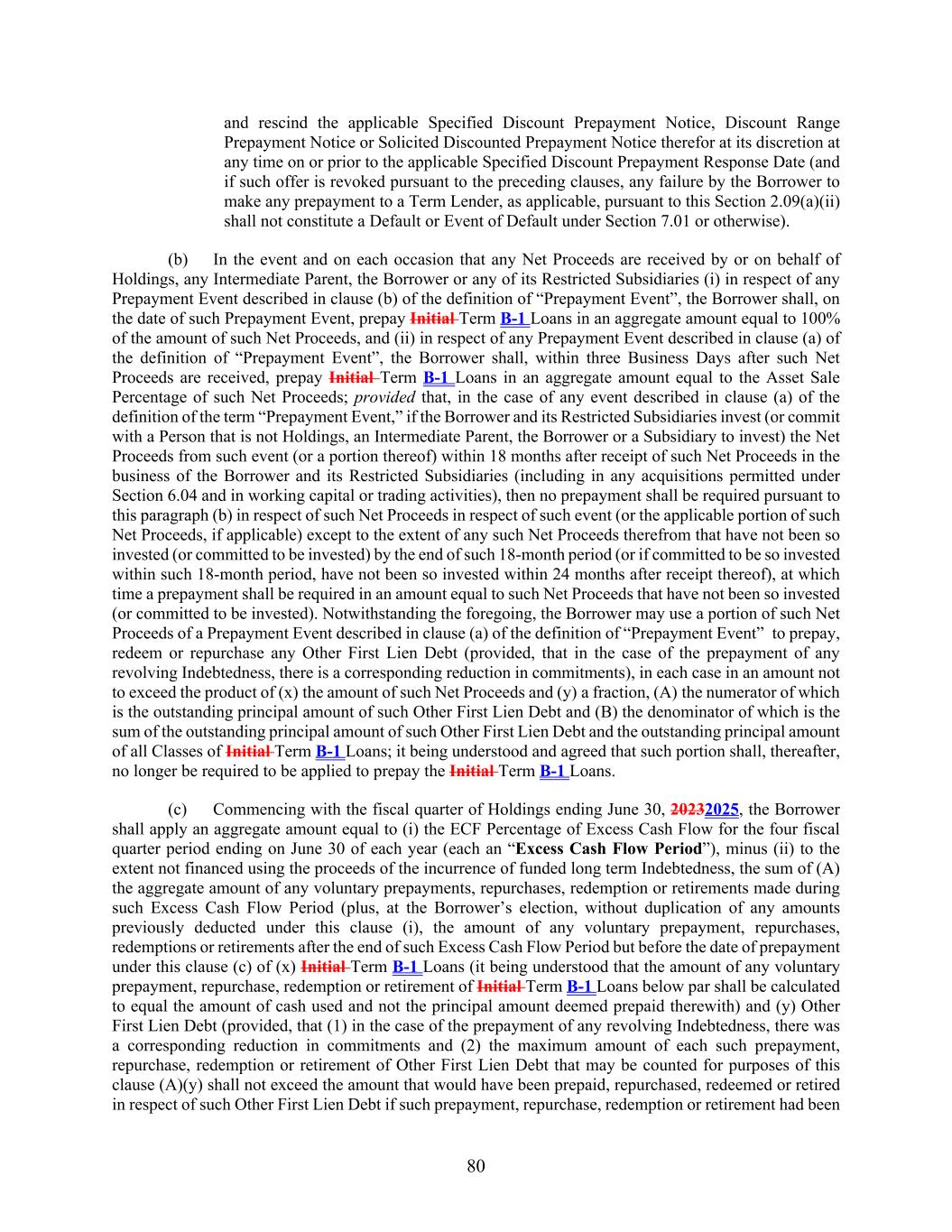 80 and rescind the applicable Specified Discount Prepayment Notice, Discount Range Prepayment Notice or Solicited Discounted Prepayment Notice therefor at its discretion at any time on or prior to the applicable Specified Discount Prepayment Response Date (and if such offer is revoked pursuant to the preceding clauses, any failure by the Borrower to make any prepayment to a Term Lender, as applicable, pursuant to this Section 2.09(a)(ii) shall not constitute a Default or Event of Default under Section 7.01 or otherwise). (b) In the event and on each occasion that any Net Proceeds are received by or on behalf of Holdings, any Intermediate Parent, the Borrower or any of its Restricted Subsidiaries (i) in respect of any Prepayment Event described in clause (b) of the definition of “Prepayment Event”, the Borrower shall, on the date of such Prepayment Event, prepay Initial Term B-1 Loans in an aggregate amount equal to 100% of the amount of such Net Proceeds, and (ii) in respect of any Prepayment Event described in clause (a) of the definition of “Prepayment Event”, the Borrower shall, within three Business Days after such Net Proceeds are received, prepay Initial Term B-1 Loans in an aggregate amount equal to the Asset Sale Percentage of such Net Proceeds; provided that, in the case of any event described in clause (a) of the definition of the term “Prepayment Event,” if the Borrower and its Restricted Subsidiaries invest (or commit with a Person that is not Holdings, an Intermediate Parent, the Borrower or a Subsidiary to invest) the Net Proceeds from such event (or a portion thereof) within 18 months after receipt of such Net Proceeds in the business of the Borrower and its Restricted Subsidiaries (including in any acquisitions permitted under Section 6.04 and in working capital or trading activities), then no prepayment shall be required pursuant to this paragraph (b) in respect of such Net Proceeds in respect of such event (or the applicable portion of such Net Proceeds, if applicable) except to the extent of any such Net Proceeds therefrom that have not been so invested (or committed to be invested) by the end of such 18-month period (or if committed to be so invested within such 18-month period, have not been so invested within 24 months after receipt thereof), at which time a prepayment shall be required in an amount equal to such Net Proceeds that have not been so invested (or committed to be invested). Notwithstanding the foregoing, the Borrower may use a portion of such Net Proceeds of a Prepayment Event described in clause (a) of the definition of “Prepayment Event” to prepay, redeem or repurchase any Other First Lien Debt (provided, that in the case of the prepayment of any revolving Indebtedness, there is a corresponding reduction in commitments), in each case in an amount not to exceed the product of (x) the amount of such Net Proceeds and (y) a fraction, (A) the numerator of which is the outstanding principal amount of such Other First Lien Debt and (B) the denominator of which is the sum of the outstanding principal amount of such Other First Lien Debt and the outstanding principal amount of all Classes of Initial Term B-1 Loans; it being understood and agreed that such portion shall, thereafter, no longer be required to be applied to prepay the Initial Term B-1 Loans. (c) Commencing with the fiscal quarter of Holdings ending June 30, 20232025, the Borrower shall apply an aggregate amount equal to (i) the ECF Percentage of Excess Cash Flow for the four fiscal quarter period ending on June 30 of each year (each an “Excess Cash Flow Period”), minus (ii) to the extent not financed using the proceeds of the incurrence of funded long term Indebtedness, the sum of (A) the aggregate amount of any voluntary prepayments, repurchases, redemption or retirements made during such Excess Cash Flow Period (plus, at the Borrower’s election, without duplication of any amounts previously deducted under this clause (i), the amount of any voluntary prepayment, repurchases, redemptions or retirements after the end of such Excess Cash Flow Period but before the date of prepayment under this clause (c) of (x) Initial Term B-1 Loans (it being understood that the amount of any voluntary prepayment, repurchase, redemption or retirement of Initial Term B-1 Loans below par shall be calculated to equal the amount of cash used and not the principal amount deemed prepaid therewith) and (y) Other First Lien Debt (provided, that (1) in the case of the prepayment of any revolving Indebtedness, there was a corresponding reduction in commitments and (2) the maximum amount of each such prepayment, repurchase, redemption or retirement of Other First Lien Debt that may be counted for purposes of this clause (A)(y) shall not exceed the amount that would have been prepaid, repurchased, redeemed or retired in respect of such Other First Lien Debt if such prepayment, repurchase, redemption or retirement had been