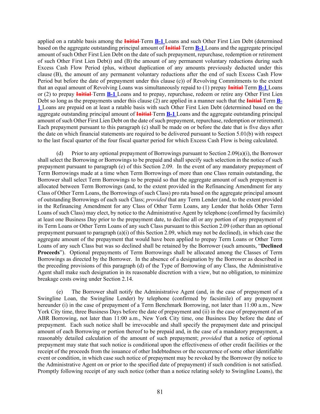 81 applied on a ratable basis among the Initial Term B-1 Loans and such Other First Lien Debt (determined based on the aggregate outstanding principal amount of Initial Term B-1 Loans and the aggregate principal amount of such Other First Lien Debt on the date of such prepayment, repurchase, redemption or retirement of such Other First Lien Debt)) and (B) the amount of any permanent voluntary reductions during such Excess Cash Flow Period (plus, without duplication of any amounts previously deducted under this clause (B), the amount of any permanent voluntary reductions after the end of such Excess Cash Flow Period but before the date of prepayment under this clause (c)) of Revolving Commitments to the extent that an equal amount of Revolving Loans was simultaneously repaid to (1) prepay Initial Term B-1 Loans or (2) to prepay Initial Term B-1 Loans and to prepay, repurchase, redeem or retire any Other First Lien Debt so long as the prepayments under this clause (2) are applied in a manner such that the Initial Term B- 1 Loans are prepaid on at least a ratable basis with such Other First Lien Debt (determined based on the aggregate outstanding principal amount of Initial Term B-1 Loans and the aggregate outstanding principal amount of such Other First Lien Debt on the date of such prepayment, repurchase, redemption or retirement). Each prepayment pursuant to this paragraph (c) shall be made on or before the date that is five days after the date on which financial statements are required to be delivered pursuant to Section 5.01(b) with respect to the last fiscal quarter of the four fiscal quarter period for which Excess Cash Flow is being calculated. (d) Prior to any optional prepayment of Borrowings pursuant to Section 2.09(a)(i), the Borrower shall select the Borrowing or Borrowings to be prepaid and shall specify such selection in the notice of such prepayment pursuant to paragraph (e) of this Section 2.09. In the event of any mandatory prepayment of Term Borrowings made at a time when Term Borrowings of more than one Class remain outstanding, the Borrower shall select Term Borrowings to be prepaid so that the aggregate amount of such prepayment is allocated between Term Borrowings (and, to the extent provided in the Refinancing Amendment for any Class of Other Term Loans, the Borrowings of such Class) pro rata based on the aggregate principal amount of outstanding Borrowings of each such Class; provided that any Term Lender (and, to the extent provided in the Refinancing Amendment for any Class of Other Term Loans, any Lender that holds Other Term Loans of such Class) may elect, by notice to the Administrative Agent by telephone (confirmed by facsimile) at least one Business Day prior to the prepayment date, to decline all or any portion of any prepayment of its Term Loans or Other Term Loans of any such Class pursuant to this Section 2.09 (other than an optional prepayment pursuant to paragraph (a)(i) of this Section 2.09, which may not be declined), in which case the aggregate amount of the prepayment that would have been applied to prepay Term Loans or Other Term Loans of any such Class but was so declined shall be retained by the Borrower (such amounts, “Declined Proceeds”). Optional prepayments of Term Borrowings shall be allocated among the Classes of Term Borrowings as directed by the Borrower. In the absence of a designation by the Borrower as described in the preceding provisions of this paragraph (d) of the Type of Borrowing of any Class, the Administrative Agent shall make such designation in its reasonable discretion with a view, but no obligation, to minimize breakage costs owing under Section 2.14. (e) The Borrower shall notify the Administrative Agent (and, in the case of prepayment of a Swingline Loan, the Swingline Lender) by telephone (confirmed by facsimile) of any prepayment hereunder (i) in the case of prepayment of a Term Benchmark Borrowing, not later than 11:00 a.m., New York City time, three Business Days before the date of prepayment and (ii) in the case of prepayment of an ABR Borrowing, not later than 11:00 a.m., New York City time, one Business Day before the date of prepayment. Each such notice shall be irrevocable and shall specify the prepayment date and principal amount of each Borrowing or portion thereof to be prepaid and, in the case of a mandatory prepayment, a reasonably detailed calculation of the amount of such prepayment; provided that a notice of optional prepayment may state that such notice is conditional upon the effectiveness of other credit facilities or the receipt of the proceeds from the issuance of other Indebtedness or the occurrence of some other identifiable event or condition, in which case such notice of prepayment may be revoked by the Borrower (by notice to the Administrative Agent on or prior to the specified date of prepayment) if such condition is not satisfied. Promptly following receipt of any such notice (other than a notice relating solely to Swingline Loans), the