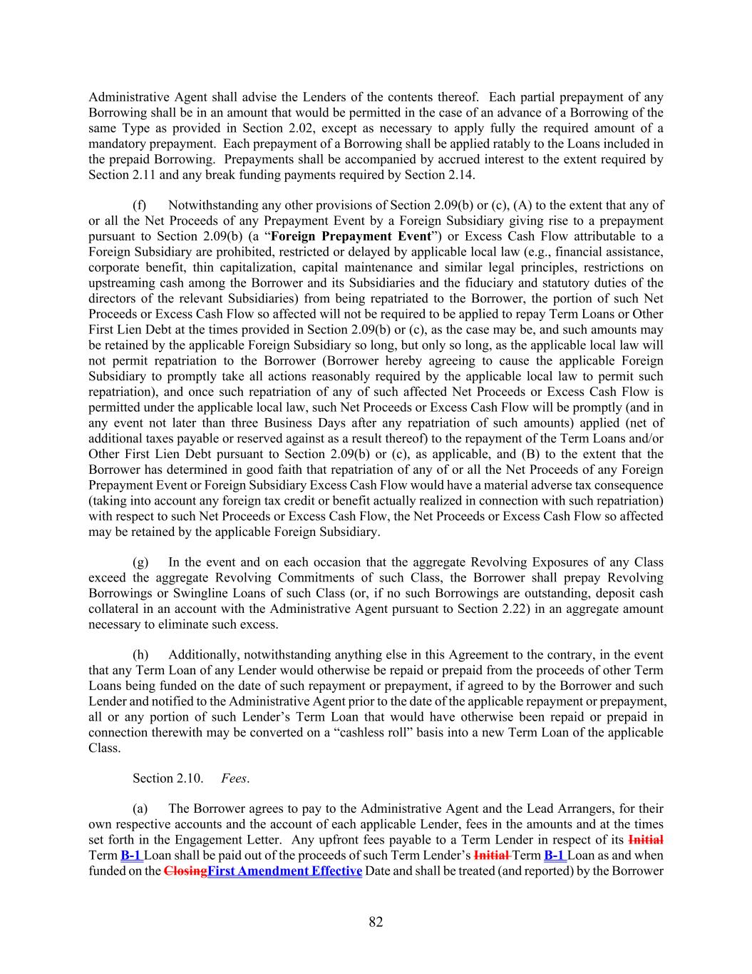 82 Administrative Agent shall advise the Lenders of the contents thereof. Each partial prepayment of any Borrowing shall be in an amount that would be permitted in the case of an advance of a Borrowing of the same Type as provided in Section 2.02, except as necessary to apply fully the required amount of a mandatory prepayment. Each prepayment of a Borrowing shall be applied ratably to the Loans included in the prepaid Borrowing. Prepayments shall be accompanied by accrued interest to the extent required by Section 2.11 and any break funding payments required by Section 2.14. (f) Notwithstanding any other provisions of Section 2.09(b) or (c), (A) to the extent that any of or all the Net Proceeds of any Prepayment Event by a Foreign Subsidiary giving rise to a prepayment pursuant to Section 2.09(b) (a “Foreign Prepayment Event”) or Excess Cash Flow attributable to a Foreign Subsidiary are prohibited, restricted or delayed by applicable local law (e.g., financial assistance, corporate benefit, thin capitalization, capital maintenance and similar legal principles, restrictions on upstreaming cash among the Borrower and its Subsidiaries and the fiduciary and statutory duties of the directors of the relevant Subsidiaries) from being repatriated to the Borrower, the portion of such Net Proceeds or Excess Cash Flow so affected will not be required to be applied to repay Term Loans or Other First Lien Debt at the times provided in Section 2.09(b) or (c), as the case may be, and such amounts may be retained by the applicable Foreign Subsidiary so long, but only so long, as the applicable local law will not permit repatriation to the Borrower (Borrower hereby agreeing to cause the applicable Foreign Subsidiary to promptly take all actions reasonably required by the applicable local law to permit such repatriation), and once such repatriation of any of such affected Net Proceeds or Excess Cash Flow is permitted under the applicable local law, such Net Proceeds or Excess Cash Flow will be promptly (and in any event not later than three Business Days after any repatriation of such amounts) applied (net of additional taxes payable or reserved against as a result thereof) to the repayment of the Term Loans and/or Other First Lien Debt pursuant to Section 2.09(b) or (c), as applicable, and (B) to the extent that the Borrower has determined in good faith that repatriation of any of or all the Net Proceeds of any Foreign Prepayment Event or Foreign Subsidiary Excess Cash Flow would have a material adverse tax consequence (taking into account any foreign tax credit or benefit actually realized in connection with such repatriation) with respect to such Net Proceeds or Excess Cash Flow, the Net Proceeds or Excess Cash Flow so affected may be retained by the applicable Foreign Subsidiary. (g) In the event and on each occasion that the aggregate Revolving Exposures of any Class exceed the aggregate Revolving Commitments of such Class, the Borrower shall prepay Revolving Borrowings or Swingline Loans of such Class (or, if no such Borrowings are outstanding, deposit cash collateral in an account with the Administrative Agent pursuant to Section 2.22) in an aggregate amount necessary to eliminate such excess. (h) Additionally, notwithstanding anything else in this Agreement to the contrary, in the event that any Term Loan of any Lender would otherwise be repaid or prepaid from the proceeds of other Term Loans being funded on the date of such repayment or prepayment, if agreed to by the Borrower and such Lender and notified to the Administrative Agent prior to the date of the applicable repayment or prepayment, all or any portion of such Lender’s Term Loan that would have otherwise been repaid or prepaid in connection therewith may be converted on a “cashless roll” basis into a new Term Loan of the applicable Class. Section 2.10. Fees. (a) The Borrower agrees to pay to the Administrative Agent and the Lead Arrangers, for their own respective accounts and the account of each applicable Lender, fees in the amounts and at the times set forth in the Engagement Letter. Any upfront fees payable to a Term Lender in respect of its Initial Term B-1 Loan shall be paid out of the proceeds of such Term Lender’s Initial Term B-1 Loan as and when funded on the ClosingFirst Amendment Effective Date and shall be treated (and reported) by the Borrower