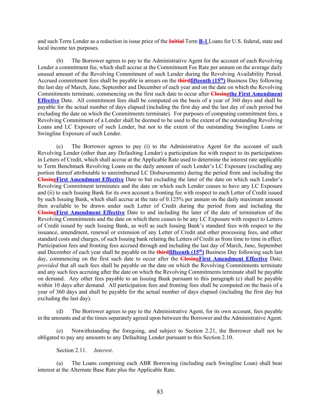 83 and such Term Lender as a reduction in issue price of the Initial Term B-1 Loans for U.S. federal, state and local income tax purposes. (b) The Borrower agrees to pay to the Administrative Agent for the account of each Revolving Lender a commitment fee, which shall accrue at the Commitment Fee Rate per annum on the average daily unused amount of the Revolving Commitment of such Lender during the Revolving Availability Period. Accrued commitment fees shall be payable in arrears on the thirdfifteenth (15th) Business Day following the last day of March, June, September and December of each year and on the date on which the Revolving Commitments terminate, commencing on the first such date to occur after Closingthe First Amendment Effective Date. All commitment fees shall be computed on the basis of a year of 360 days and shall be payable for the actual number of days elapsed (including the first day and the last day of each period but excluding the date on which the Commitments terminate). For purposes of computing commitment fees, a Revolving Commitment of a Lender shall be deemed to be used to the extent of the outstanding Revolving Loans and LC Exposure of such Lender, but not to the extent of the outstanding Swingline Loans or Swingline Exposure of such Lender. (c) The Borrower agrees to pay (i) to the Administrative Agent for the account of each Revolving Lender (other than any Defaulting Lender) a participation fee with respect to its participations in Letters of Credit, which shall accrue at the Applicable Rate used to determine the interest rate applicable to Term Benchmark Revolving Loans on the daily amount of such Lender’s LC Exposure (excluding any portion thereof attributable to unreimbursed LC Disbursements) during the period from and including the ClosingFirst Amendment Effective Date to but excluding the later of the date on which such Lender’s Revolving Commitment terminates and the date on which such Lender ceases to have any LC Exposure and (ii) to each Issuing Bank for its own account a fronting fee with respect to each Letter of Credit issued by such Issuing Bank, which shall accrue at the rate of 0.125% per annum on the daily maximum amount then available to be drawn under such Letter of Credit during the period from and including the ClosingFirst Amendment Effective Date to and including the later of the date of termination of the Revolving Commitments and the date on which there ceases to be any LC Exposure with respect to Letters of Credit issued by such Issuing Bank, as well as such Issuing Bank’s standard fees with respect to the issuance, amendment, renewal or extension of any Letter of Credit and other processing fees, and other standard costs and charges, of such Issuing bank relating the Letters of Credit as from time to time in effect. Participation fees and fronting fees accrued through and including the last day of March, June, September and December of each year shall be payable on the thirdfifteenth (15th) Business Day following such last day, commencing on the first such date to occur after the ClosingFirst Amendment Effective Date; provided that all such fees shall be payable on the date on which the Revolving Commitments terminate and any such fees accruing after the date on which the Revolving Commitments terminate shall be payable on demand. Any other fees payable to an Issuing Bank pursuant to this paragraph (c) shall be payable within 10 days after demand. All participation fees and fronting fees shall be computed on the basis of a year of 360 days and shall be payable for the actual number of days elapsed (including the first day but excluding the last day). (d) The Borrower agrees to pay to the Administrative Agent, for its own account, fees payable in the amounts and at the times separately agreed upon between the Borrower and the Administrative Agent. (e) Notwithstanding the foregoing, and subject to Section 2.21, the Borrower shall not be obligated to pay any amounts to any Defaulting Lender pursuant to this Section 2.10. Section 2.11. Interest. (a) The Loans comprising each ABR Borrowing (including each Swingline Loan) shall bear interest at the Alternate Base Rate plus the Applicable Rate.