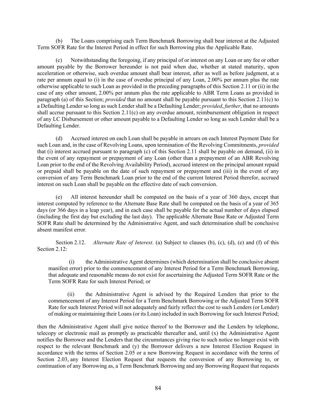 84 (b) The Loans comprising each Term Benchmark Borrowing shall bear interest at the Adjusted Term SOFR Rate for the Interest Period in effect for such Borrowing plus the Applicable Rate. (c) Notwithstanding the foregoing, if any principal of or interest on any Loan or any fee or other amount payable by the Borrower hereunder is not paid when due, whether at stated maturity, upon acceleration or otherwise, such overdue amount shall bear interest, after as well as before judgment, at a rate per annum equal to (i) in the case of overdue principal of any Loan, 2.00% per annum plus the rate otherwise applicable to such Loan as provided in the preceding paragraphs of this Section 2.11 or (ii) in the case of any other amount, 2.00% per annum plus the rate applicable to ABR Term Loans as provided in paragraph (a) of this Section; provided that no amount shall be payable pursuant to this Section 2.11(c) to a Defaulting Lender so long as such Lender shall be a Defaulting Lender; provided, further, that no amounts shall accrue pursuant to this Section 2.11(c) on any overdue amount, reimbursement obligation in respect of any LC Disbursement or other amount payable to a Defaulting Lender so long as such Lender shall be a Defaulting Lender. (d) Accrued interest on each Loan shall be payable in arrears on each Interest Payment Date for such Loan and, in the case of Revolving Loans, upon termination of the Revolving Commitments, provided that (i) interest accrued pursuant to paragraph (c) of this Section 2.11 shall be payable on demand, (ii) in the event of any repayment or prepayment of any Loan (other than a prepayment of an ABR Revolving Loan prior to the end of the Revolving Availability Period), accrued interest on the principal amount repaid or prepaid shall be payable on the date of such repayment or prepayment and (iii) in the event of any conversion of any Term Benchmark Loan prior to the end of the current Interest Period therefor, accrued interest on such Loan shall be payable on the effective date of such conversion. (e) All interest hereunder shall be computed on the basis of a year of 360 days, except that interest computed by reference to the Alternate Base Rate shall be computed on the basis of a year of 365 days (or 366 days in a leap year), and in each case shall be payable for the actual number of days elapsed (including the first day but excluding the last day). The applicable Alternate Base Rate or Adjusted Term SOFR Rate shall be determined by the Administrative Agent, and such determination shall be conclusive absent manifest error. Section 2.12. Alternate Rate of Interest. (a) Subject to clauses (b), (c), (d), (e) and (f) of this Section 2.12: (i) the Administrative Agent determines (which determination shall be conclusive absent manifest error) prior to the commencement of any Interest Period for a Term Benchmark Borrowing, that adequate and reasonable means do not exist for ascertaining the Adjusted Term SOFR Rate or the Term SOFR Rate for such Interest Period; or (ii) the Administrative Agent is advised by the Required Lenders that prior to the commencement of any Interest Period for a Term Benchmark Borrowing or the Adjusted Term SOFR Rate for such Interest Period will not adequately and fairly reflect the cost to such Lenders (or Lender) of making or maintaining their Loans (or its Loan) included in such Borrowing for such Interest Period; then the Administrative Agent shall give notice thereof to the Borrower and the Lenders by telephone, telecopy or electronic mail as promptly as practicable thereafter and, until (x) the Administrative Agent notifies the Borrower and the Lenders that the circumstances giving rise to such notice no longer exist with respect to the relevant Benchmark and (y) the Borrower delivers a new Interest Election Request in accordance with the terms of Section 2.05 or a new Borrowing Request in accordance with the terms of Section 2.03, any Interest Election Request that requests the conversion of any Borrowing to, or continuation of any Borrowing as, a Term Benchmark Borrowing and any Borrowing Request that requests