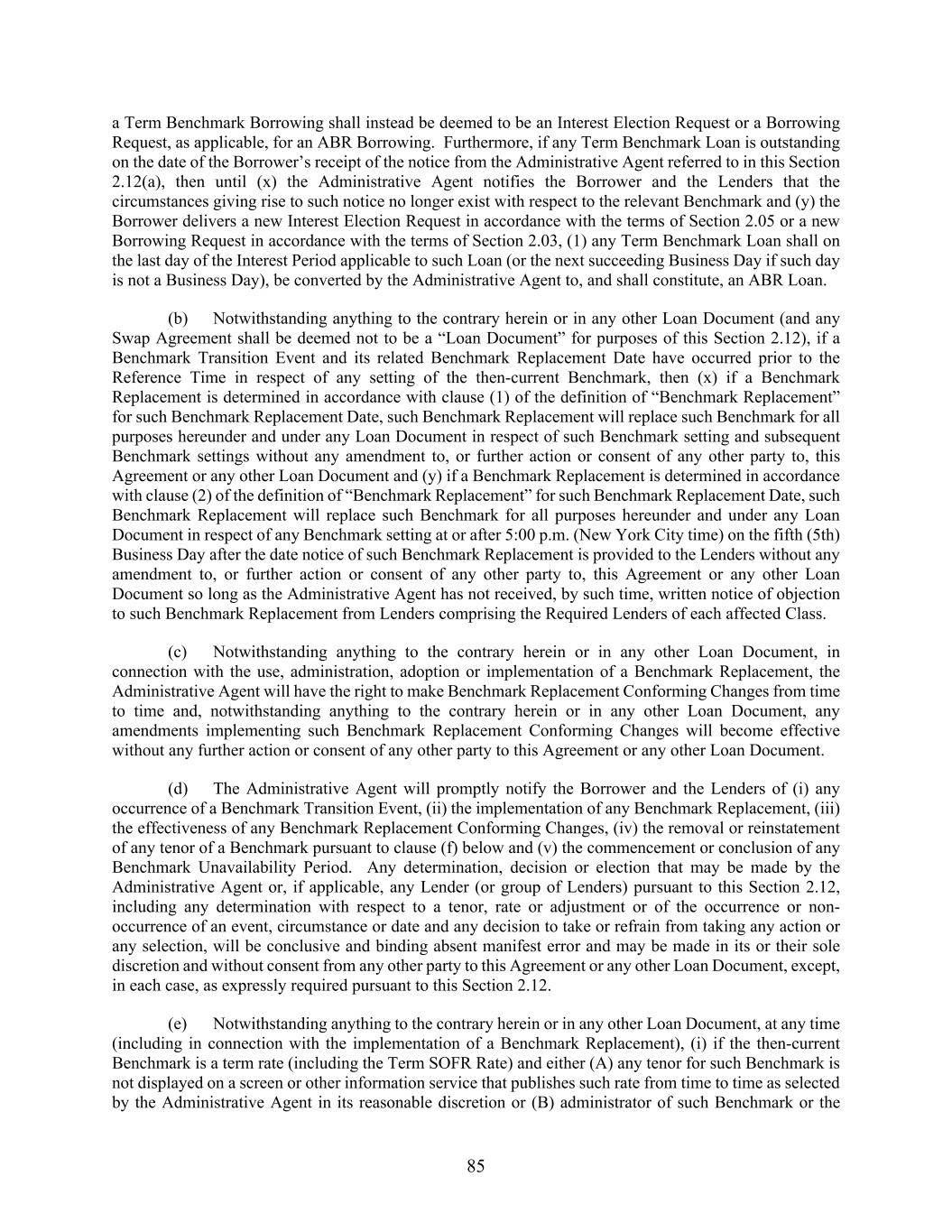 85 a Term Benchmark Borrowing shall instead be deemed to be an Interest Election Request or a Borrowing Request, as applicable, for an ABR Borrowing. Furthermore, if any Term Benchmark Loan is outstanding on the date of the Borrower’s receipt of the notice from the Administrative Agent referred to in this Section 2.12(a), then until (x) the Administrative Agent notifies the Borrower and the Lenders that the circumstances giving rise to such notice no longer exist with respect to the relevant Benchmark and (y) the Borrower delivers a new Interest Election Request in accordance with the terms of Section 2.05 or a new Borrowing Request in accordance with the terms of Section 2.03, (1) any Term Benchmark Loan shall on the last day of the Interest Period applicable to such Loan (or the next succeeding Business Day if such day is not a Business Day), be converted by the Administrative Agent to, and shall constitute, an ABR Loan. (b) Notwithstanding anything to the contrary herein or in any other Loan Document (and any Swap Agreement shall be deemed not to be a “Loan Document” for purposes of this Section 2.12), if a Benchmark Transition Event and its related Benchmark Replacement Date have occurred prior to the Reference Time in respect of any setting of the then-current Benchmark, then (x) if a Benchmark Replacement is determined in accordance with clause (1) of the definition of “Benchmark Replacement” for such Benchmark Replacement Date, such Benchmark Replacement will replace such Benchmark for all purposes hereunder and under any Loan Document in respect of such Benchmark setting and subsequent Benchmark settings without any amendment to, or further action or consent of any other party to, this Agreement or any other Loan Document and (y) if a Benchmark Replacement is determined in accordance with clause (2) of the definition of “Benchmark Replacement” for such Benchmark Replacement Date, such Benchmark Replacement will replace such Benchmark for all purposes hereunder and under any Loan Document in respect of any Benchmark setting at or after 5:00 p.m. (New York City time) on the fifth (5th) Business Day after the date notice of such Benchmark Replacement is provided to the Lenders without any amendment to, or further action or consent of any other party to, this Agreement or any other Loan Document so long as the Administrative Agent has not received, by such time, written notice of objection to such Benchmark Replacement from Lenders comprising the Required Lenders of each affected Class. (c) Notwithstanding anything to the contrary herein or in any other Loan Document, in connection with the use, administration, adoption or implementation of a Benchmark Replacement, the Administrative Agent will have the right to make Benchmark Replacement Conforming Changes from time to time and, notwithstanding anything to the contrary herein or in any other Loan Document, any amendments implementing such Benchmark Replacement Conforming Changes will become effective without any further action or consent of any other party to this Agreement or any other Loan Document. (d) The Administrative Agent will promptly notify the Borrower and the Lenders of (i) any occurrence of a Benchmark Transition Event, (ii) the implementation of any Benchmark Replacement, (iii) the effectiveness of any Benchmark Replacement Conforming Changes, (iv) the removal or reinstatement of any tenor of a Benchmark pursuant to clause (f) below and (v) the commencement or conclusion of any Benchmark Unavailability Period. Any determination, decision or election that may be made by the Administrative Agent or, if applicable, any Lender (or group of Lenders) pursuant to this Section 2.12, including any determination with respect to a tenor, rate or adjustment or of the occurrence or non- occurrence of an event, circumstance or date and any decision to take or refrain from taking any action or any selection, will be conclusive and binding absent manifest error and may be made in its or their sole discretion and without consent from any other party to this Agreement or any other Loan Document, except, in each case, as expressly required pursuant to this Section 2.12. (e) Notwithstanding anything to the contrary herein or in any other Loan Document, at any time (including in connection with the implementation of a Benchmark Replacement), (i) if the then-current Benchmark is a term rate (including the Term SOFR Rate) and either (A) any tenor for such Benchmark is not displayed on a screen or other information service that publishes such rate from time to time as selected by the Administrative Agent in its reasonable discretion or (B) administrator of such Benchmark or the