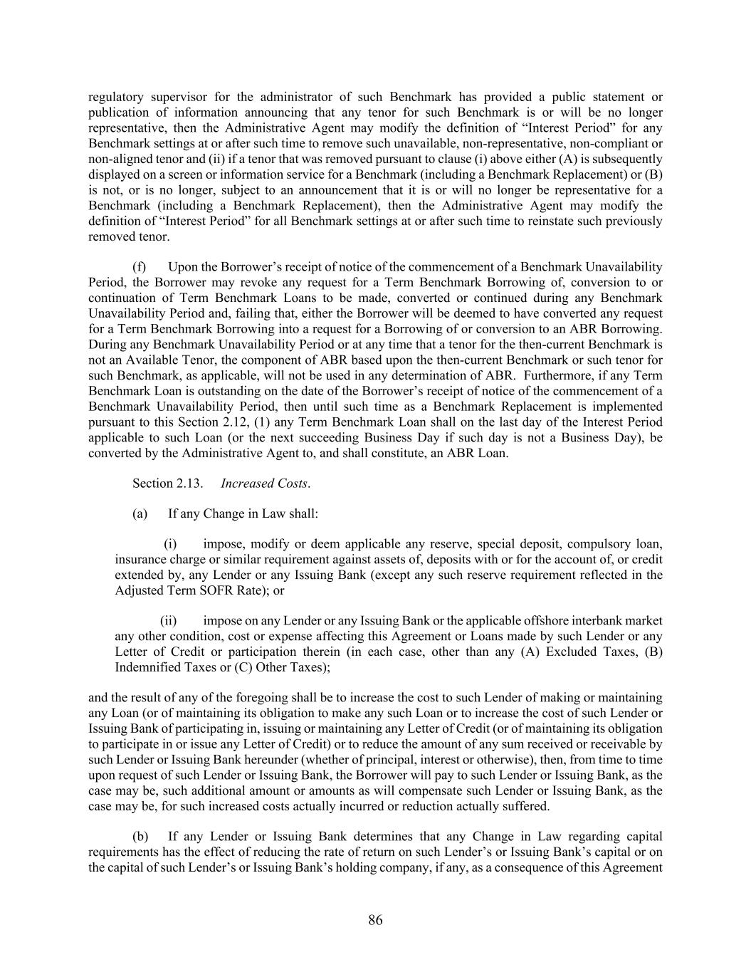 86 regulatory supervisor for the administrator of such Benchmark has provided a public statement or publication of information announcing that any tenor for such Benchmark is or will be no longer representative, then the Administrative Agent may modify the definition of “Interest Period” for any Benchmark settings at or after such time to remove such unavailable, non-representative, non-compliant or non-aligned tenor and (ii) if a tenor that was removed pursuant to clause (i) above either (A) is subsequently displayed on a screen or information service for a Benchmark (including a Benchmark Replacement) or (B) is not, or is no longer, subject to an announcement that it is or will no longer be representative for a Benchmark (including a Benchmark Replacement), then the Administrative Agent may modify the definition of “Interest Period” for all Benchmark settings at or after such time to reinstate such previously removed tenor. (f) Upon the Borrower’s receipt of notice of the commencement of a Benchmark Unavailability Period, the Borrower may revoke any request for a Term Benchmark Borrowing of, conversion to or continuation of Term Benchmark Loans to be made, converted or continued during any Benchmark Unavailability Period and, failing that, either the Borrower will be deemed to have converted any request for a Term Benchmark Borrowing into a request for a Borrowing of or conversion to an ABR Borrowing. During any Benchmark Unavailability Period or at any time that a tenor for the then-current Benchmark is not an Available Tenor, the component of ABR based upon the then-current Benchmark or such tenor for such Benchmark, as applicable, will not be used in any determination of ABR. Furthermore, if any Term Benchmark Loan is outstanding on the date of the Borrower’s receipt of notice of the commencement of a Benchmark Unavailability Period, then until such time as a Benchmark Replacement is implemented pursuant to this Section 2.12, (1) any Term Benchmark Loan shall on the last day of the Interest Period applicable to such Loan (or the next succeeding Business Day if such day is not a Business Day), be converted by the Administrative Agent to, and shall constitute, an ABR Loan. Section 2.13. Increased Costs. (a) If any Change in Law shall: (i) impose, modify or deem applicable any reserve, special deposit, compulsory loan, insurance charge or similar requirement against assets of, deposits with or for the account of, or credit extended by, any Lender or any Issuing Bank (except any such reserve requirement reflected in the Adjusted Term SOFR Rate); or (ii) impose on any Lender or any Issuing Bank or the applicable offshore interbank market any other condition, cost or expense affecting this Agreement or Loans made by such Lender or any Letter of Credit or participation therein (in each case, other than any (A) Excluded Taxes, (B) Indemnified Taxes or (C) Other Taxes); and the result of any of the foregoing shall be to increase the cost to such Lender of making or maintaining any Loan (or of maintaining its obligation to make any such Loan or to increase the cost of such Lender or Issuing Bank of participating in, issuing or maintaining any Letter of Credit (or of maintaining its obligation to participate in or issue any Letter of Credit) or to reduce the amount of any sum received or receivable by such Lender or Issuing Bank hereunder (whether of principal, interest or otherwise), then, from time to time upon request of such Lender or Issuing Bank, the Borrower will pay to such Lender or Issuing Bank, as the case may be, such additional amount or amounts as will compensate such Lender or Issuing Bank, as the case may be, for such increased costs actually incurred or reduction actually suffered. (b) If any Lender or Issuing Bank determines that any Change in Law regarding capital requirements has the effect of reducing the rate of return on such Lender’s or Issuing Bank’s capital or on the capital of such Lender’s or Issuing Bank’s holding company, if any, as a consequence of this Agreement