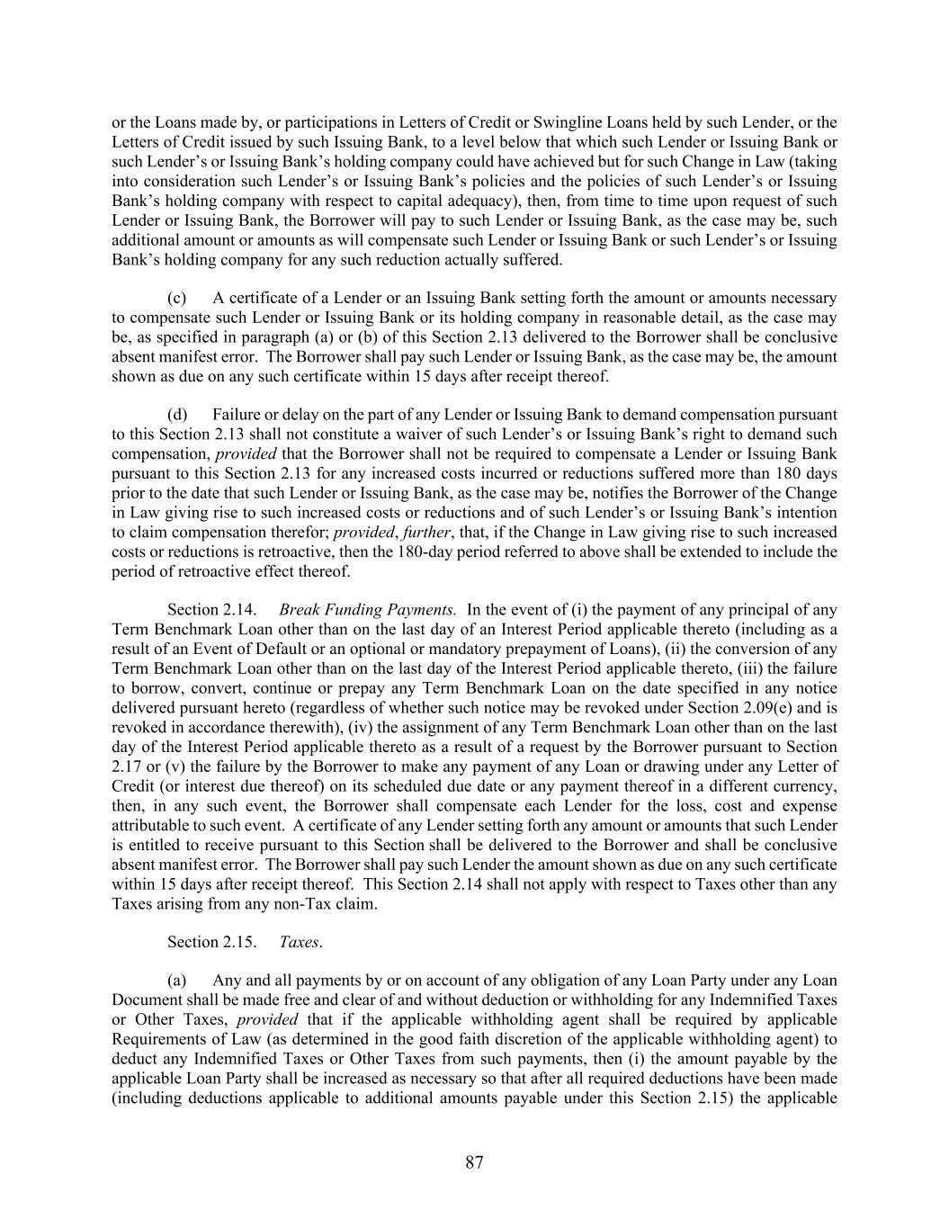 87 or the Loans made by, or participations in Letters of Credit or Swingline Loans held by such Lender, or the Letters of Credit issued by such Issuing Bank, to a level below that which such Lender or Issuing Bank or such Lender’s or Issuing Bank’s holding company could have achieved but for such Change in Law (taking into consideration such Lender’s or Issuing Bank’s policies and the policies of such Lender’s or Issuing Bank’s holding company with respect to capital adequacy), then, from time to time upon request of such Lender or Issuing Bank, the Borrower will pay to such Lender or Issuing Bank, as the case may be, such additional amount or amounts as will compensate such Lender or Issuing Bank or such Lender’s or Issuing Bank’s holding company for any such reduction actually suffered. (c) A certificate of a Lender or an Issuing Bank setting forth the amount or amounts necessary to compensate such Lender or Issuing Bank or its holding company in reasonable detail, as the case may be, as specified in paragraph (a) or (b) of this Section 2.13 delivered to the Borrower shall be conclusive absent manifest error. The Borrower shall pay such Lender or Issuing Bank, as the case may be, the amount shown as due on any such certificate within 15 days after receipt thereof. (d) Failure or delay on the part of any Lender or Issuing Bank to demand compensation pursuant to this Section 2.13 shall not constitute a waiver of such Lender’s or Issuing Bank’s right to demand such compensation, provided that the Borrower shall not be required to compensate a Lender or Issuing Bank pursuant to this Section 2.13 for any increased costs incurred or reductions suffered more than 180 days prior to the date that such Lender or Issuing Bank, as the case may be, notifies the Borrower of the Change in Law giving rise to such increased costs or reductions and of such Lender’s or Issuing Bank’s intention to claim compensation therefor; provided, further, that, if the Change in Law giving rise to such increased costs or reductions is retroactive, then the 180-day period referred to above shall be extended to include the period of retroactive effect thereof. Section 2.14. Break Funding Payments. In the event of (i) the payment of any principal of any Term Benchmark Loan other than on the last day of an Interest Period applicable thereto (including as a result of an Event of Default or an optional or mandatory prepayment of Loans), (ii) the conversion of any Term Benchmark Loan other than on the last day of the Interest Period applicable thereto, (iii) the failure to borrow, convert, continue or prepay any Term Benchmark Loan on the date specified in any notice delivered pursuant hereto (regardless of whether such notice may be revoked under Section 2.09(e) and is revoked in accordance therewith), (iv) the assignment of any Term Benchmark Loan other than on the last day of the Interest Period applicable thereto as a result of a request by the Borrower pursuant to Section 2.17 or (v) the failure by the Borrower to make any payment of any Loan or drawing under any Letter of Credit (or interest due thereof) on its scheduled due date or any payment thereof in a different currency, then, in any such event, the Borrower shall compensate each Lender for the loss, cost and expense attributable to such event. A certificate of any Lender setting forth any amount or amounts that such Lender is entitled to receive pursuant to this Section shall be delivered to the Borrower and shall be conclusive absent manifest error. The Borrower shall pay such Lender the amount shown as due on any such certificate within 15 days after receipt thereof. This Section 2.14 shall not apply with respect to Taxes other than any Taxes arising from any non-Tax claim. Section 2.15. Taxes. (a) Any and all payments by or on account of any obligation of any Loan Party under any Loan Document shall be made free and clear of and without deduction or withholding for any Indemnified Taxes or Other Taxes, provided that if the applicable withholding agent shall be required by applicable Requirements of Law (as determined in the good faith discretion of the applicable withholding agent) to deduct any Indemnified Taxes or Other Taxes from such payments, then (i) the amount payable by the applicable Loan Party shall be increased as necessary so that after all required deductions have been made (including deductions applicable to additional amounts payable under this Section 2.15) the applicable