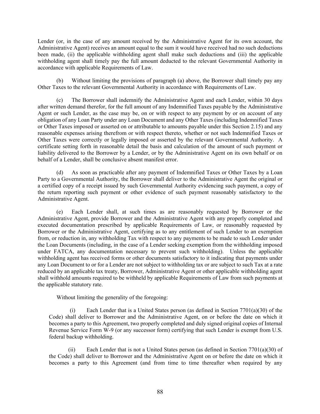 88 Lender (or, in the case of any amount received by the Administrative Agent for its own account, the Administrative Agent) receives an amount equal to the sum it would have received had no such deductions been made, (ii) the applicable withholding agent shall make such deductions and (iii) the applicable withholding agent shall timely pay the full amount deducted to the relevant Governmental Authority in accordance with applicable Requirements of Law. (b) Without limiting the provisions of paragraph (a) above, the Borrower shall timely pay any Other Taxes to the relevant Governmental Authority in accordance with Requirements of Law. (c) The Borrower shall indemnify the Administrative Agent and each Lender, within 30 days after written demand therefor, for the full amount of any Indemnified Taxes payable by the Administrative Agent or such Lender, as the case may be, on or with respect to any payment by or on account of any obligation of any Loan Party under any Loan Document and any Other Taxes (including Indemnified Taxes or Other Taxes imposed or asserted on or attributable to amounts payable under this Section 2.15) and any reasonable expenses arising therefrom or with respect thereto, whether or not such Indemnified Taxes or Other Taxes were correctly or legally imposed or asserted by the relevant Governmental Authority. A certificate setting forth in reasonable detail the basis and calculation of the amount of such payment or liability delivered to the Borrower by a Lender, or by the Administrative Agent on its own behalf or on behalf of a Lender, shall be conclusive absent manifest error. (d) As soon as practicable after any payment of Indemnified Taxes or Other Taxes by a Loan Party to a Governmental Authority, the Borrower shall deliver to the Administrative Agent the original or a certified copy of a receipt issued by such Governmental Authority evidencing such payment, a copy of the return reporting such payment or other evidence of such payment reasonably satisfactory to the Administrative Agent. (e) Each Lender shall, at such times as are reasonably requested by Borrower or the Administrative Agent, provide Borrower and the Administrative Agent with any properly completed and executed documentation prescribed by applicable Requirements of Law, or reasonably requested by Borrower or the Administrative Agent, certifying as to any entitlement of such Lender to an exemption from, or reduction in, any withholding Tax with respect to any payments to be made to such Lender under the Loan Documents (including, in the case of a Lender seeking exemption from the withholding imposed under FATCA, any documentation necessary to prevent such withholding). Unless the applicable withholding agent has received forms or other documents satisfactory to it indicating that payments under any Loan Document to or for a Lender are not subject to withholding tax or are subject to such Tax at a rate reduced by an applicable tax treaty, Borrower, Administrative Agent or other applicable withholding agent shall withhold amounts required to be withheld by applicable Requirements of Law from such payments at the applicable statutory rate. Without limiting the generality of the foregoing: (i) Each Lender that is a United States person (as defined in Section 7701(a)(30) of the Code) shall deliver to Borrower and the Administrative Agent, on or before the date on which it becomes a party to this Agreement, two properly completed and duly signed original copies of Internal Revenue Service Form W-9 (or any successor form) certifying that such Lender is exempt from U.S. federal backup withholding. (ii) Each Lender that is not a United States person (as defined in Section 7701(a)(30) of the Code) shall deliver to Borrower and the Administrative Agent on or before the date on which it becomes a party to this Agreement (and from time to time thereafter when required by any