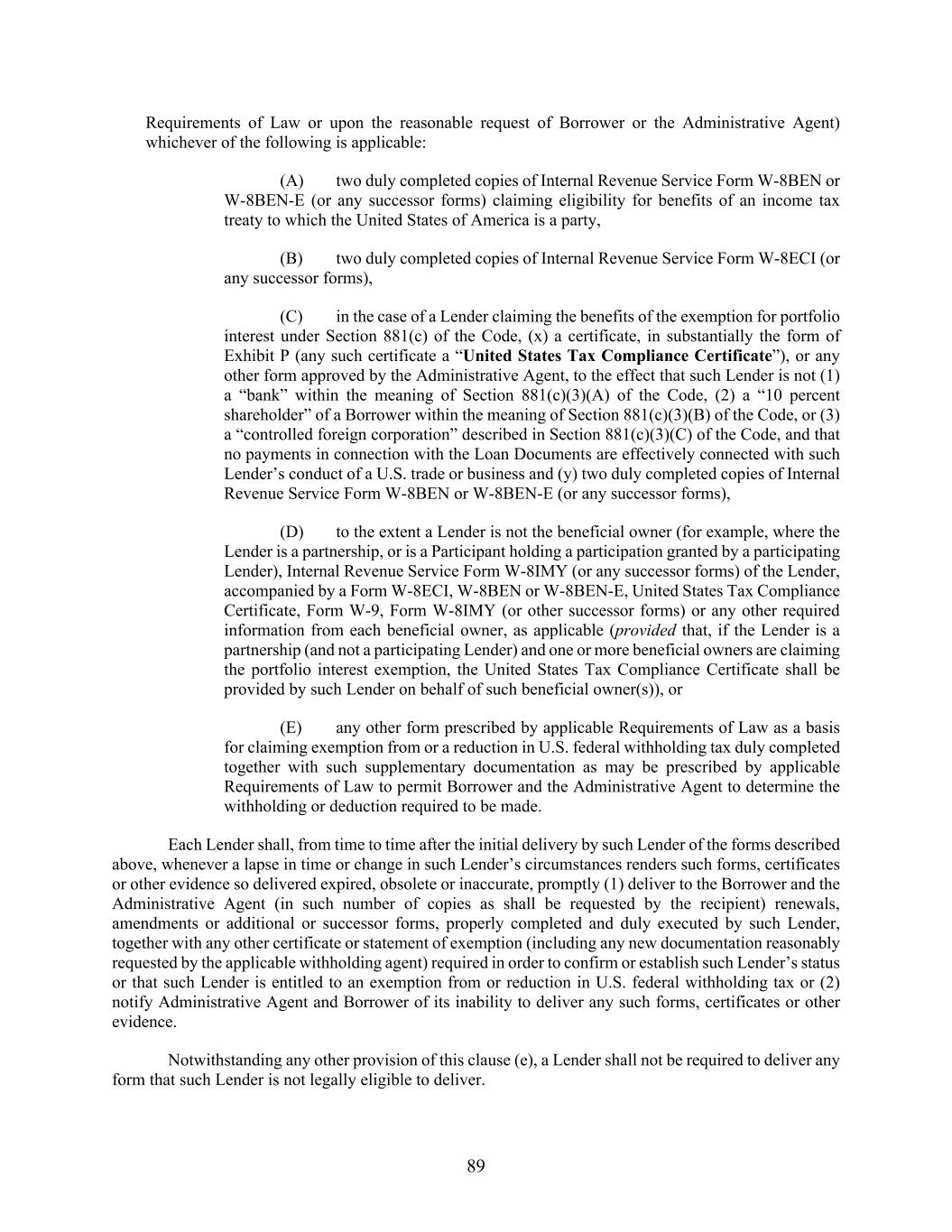 89 Requirements of Law or upon the reasonable request of Borrower or the Administrative Agent) whichever of the following is applicable: (A) two duly completed copies of Internal Revenue Service Form W-8BEN or W-8BEN-E (or any successor forms) claiming eligibility for benefits of an income tax treaty to which the United States of America is a party, (B) two duly completed copies of Internal Revenue Service Form W-8ECI (or any successor forms), (C) in the case of a Lender claiming the benefits of the exemption for portfolio interest under Section 881(c) of the Code, (x) a certificate, in substantially the form of Exhibit P (any such certificate a “United States Tax Compliance Certificate”), or any other form approved by the Administrative Agent, to the effect that such Lender is not (1) a “bank” within the meaning of Section 881(c)(3)(A) of the Code, (2) a “10 percent shareholder” of a Borrower within the meaning of Section 881(c)(3)(B) of the Code, or (3) a “controlled foreign corporation” described in Section 881(c)(3)(C) of the Code, and that no payments in connection with the Loan Documents are effectively connected with such Lender’s conduct of a U.S. trade or business and (y) two duly completed copies of Internal Revenue Service Form W-8BEN or W-8BEN-E (or any successor forms), (D) to the extent a Lender is not the beneficial owner (for example, where the Lender is a partnership, or is a Participant holding a participation granted by a participating Lender), Internal Revenue Service Form W-8IMY (or any successor forms) of the Lender, accompanied by a Form W-8ECI, W-8BEN or W-8BEN-E, United States Tax Compliance Certificate, Form W-9, Form W-8IMY (or other successor forms) or any other required information from each beneficial owner, as applicable (provided that, if the Lender is a partnership (and not a participating Lender) and one or more beneficial owners are claiming the portfolio interest exemption, the United States Tax Compliance Certificate shall be provided by such Lender on behalf of such beneficial owner(s)), or (E) any other form prescribed by applicable Requirements of Law as a basis for claiming exemption from or a reduction in U.S. federal withholding tax duly completed together with such supplementary documentation as may be prescribed by applicable Requirements of Law to permit Borrower and the Administrative Agent to determine the withholding or deduction required to be made. Each Lender shall, from time to time after the initial delivery by such Lender of the forms described above, whenever a lapse in time or change in such Lender’s circumstances renders such forms, certificates or other evidence so delivered expired, obsolete or inaccurate, promptly (1) deliver to the Borrower and the Administrative Agent (in such number of copies as shall be requested by the recipient) renewals, amendments or additional or successor forms, properly completed and duly executed by such Lender, together with any other certificate or statement of exemption (including any new documentation reasonably requested by the applicable withholding agent) required in order to confirm or establish such Lender’s status or that such Lender is entitled to an exemption from or reduction in U.S. federal withholding tax or (2) notify Administrative Agent and Borrower of its inability to deliver any such forms, certificates or other evidence. Notwithstanding any other provision of this clause (e), a Lender shall not be required to deliver any form that such Lender is not legally eligible to deliver.