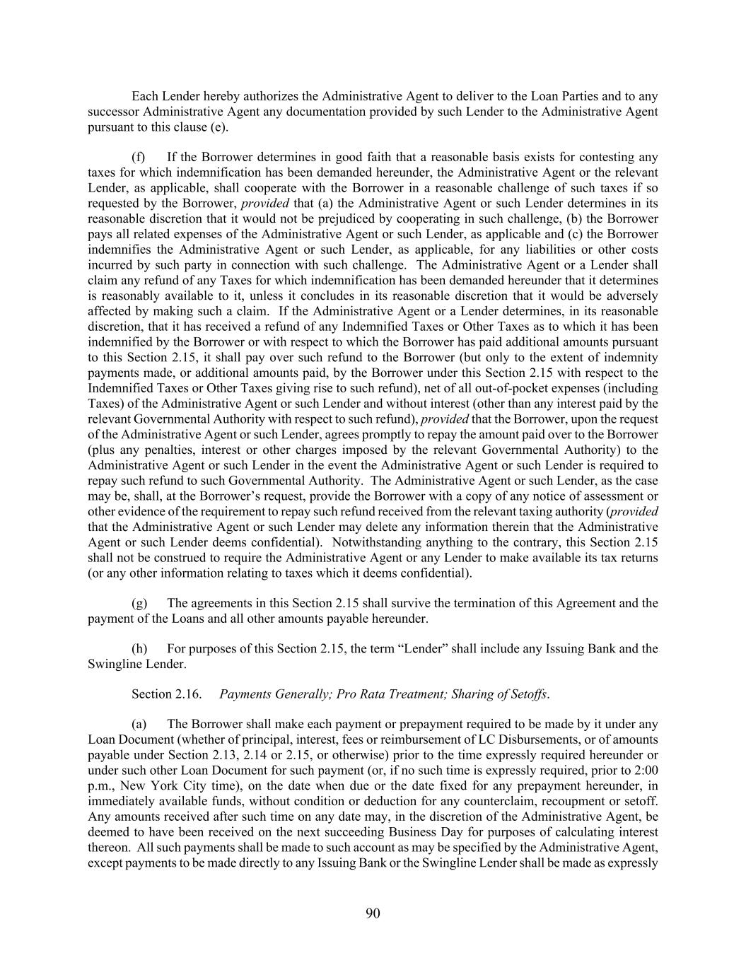 90 Each Lender hereby authorizes the Administrative Agent to deliver to the Loan Parties and to any successor Administrative Agent any documentation provided by such Lender to the Administrative Agent pursuant to this clause (e). (f) If the Borrower determines in good faith that a reasonable basis exists for contesting any taxes for which indemnification has been demanded hereunder, the Administrative Agent or the relevant Lender, as applicable, shall cooperate with the Borrower in a reasonable challenge of such taxes if so requested by the Borrower, provided that (a) the Administrative Agent or such Lender determines in its reasonable discretion that it would not be prejudiced by cooperating in such challenge, (b) the Borrower pays all related expenses of the Administrative Agent or such Lender, as applicable and (c) the Borrower indemnifies the Administrative Agent or such Lender, as applicable, for any liabilities or other costs incurred by such party in connection with such challenge. The Administrative Agent or a Lender shall claim any refund of any Taxes for which indemnification has been demanded hereunder that it determines is reasonably available to it, unless it concludes in its reasonable discretion that it would be adversely affected by making such a claim. If the Administrative Agent or a Lender determines, in its reasonable discretion, that it has received a refund of any Indemnified Taxes or Other Taxes as to which it has been indemnified by the Borrower or with respect to which the Borrower has paid additional amounts pursuant to this Section 2.15, it shall pay over such refund to the Borrower (but only to the extent of indemnity payments made, or additional amounts paid, by the Borrower under this Section 2.15 with respect to the Indemnified Taxes or Other Taxes giving rise to such refund), net of all out-of-pocket expenses (including Taxes) of the Administrative Agent or such Lender and without interest (other than any interest paid by the relevant Governmental Authority with respect to such refund), provided that the Borrower, upon the request of the Administrative Agent or such Lender, agrees promptly to repay the amount paid over to the Borrower (plus any penalties, interest or other charges imposed by the relevant Governmental Authority) to the Administrative Agent or such Lender in the event the Administrative Agent or such Lender is required to repay such refund to such Governmental Authority. The Administrative Agent or such Lender, as the case may be, shall, at the Borrower’s request, provide the Borrower with a copy of any notice of assessment or other evidence of the requirement to repay such refund received from the relevant taxing authority (provided that the Administrative Agent or such Lender may delete any information therein that the Administrative Agent or such Lender deems confidential). Notwithstanding anything to the contrary, this Section 2.15 shall not be construed to require the Administrative Agent or any Lender to make available its tax returns (or any other information relating to taxes which it deems confidential). (g) The agreements in this Section 2.15 shall survive the termination of this Agreement and the payment of the Loans and all other amounts payable hereunder. (h) For purposes of this Section 2.15, the term “Lender” shall include any Issuing Bank and the Swingline Lender. Section 2.16. Payments Generally; Pro Rata Treatment; Sharing of Setoffs. (a) The Borrower shall make each payment or prepayment required to be made by it under any Loan Document (whether of principal, interest, fees or reimbursement of LC Disbursements, or of amounts payable under Section 2.13, 2.14 or 2.15, or otherwise) prior to the time expressly required hereunder or under such other Loan Document for such payment (or, if no such time is expressly required, prior to 2:00 p.m., New York City time), on the date when due or the date fixed for any prepayment hereunder, in immediately available funds, without condition or deduction for any counterclaim, recoupment or setoff. Any amounts received after such time on any date may, in the discretion of the Administrative Agent, be deemed to have been received on the next succeeding Business Day for purposes of calculating interest thereon. All such payments shall be made to such account as may be specified by the Administrative Agent, except payments to be made directly to any Issuing Bank or the Swingline Lender shall be made as expressly