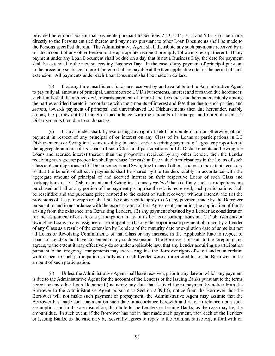 91 provided herein and except that payments pursuant to Sections 2.13, 2.14, 2.15 and 9.03 shall be made directly to the Persons entitled thereto and payments pursuant to other Loan Documents shall be made to the Persons specified therein. The Administrative Agent shall distribute any such payments received by it for the account of any other Person to the appropriate recipient promptly following receipt thereof. If any payment under any Loan Document shall be due on a day that is not a Business Day, the date for payment shall be extended to the next succeeding Business Day. In the case of any payment of principal pursuant to the preceding sentence, interest thereon shall be payable at the then applicable rate for the period of such extension. All payments under each Loan Document shall be made in dollars. (b) If at any time insufficient funds are received by and available to the Administrative Agent to pay fully all amounts of principal, unreimbursed LC Disbursements, interest and fees then due hereunder, such funds shall be applied first, towards payment of interest and fees then due hereunder, ratably among the parties entitled thereto in accordance with the amounts of interest and fees then due to such parties, and second, towards payment of principal and unreimbursed LC Disbursements then due hereunder, ratably among the parties entitled thereto in accordance with the amounts of principal and unreimbursed LC Disbursements then due to such parties. (c) If any Lender shall, by exercising any right of setoff or counterclaim or otherwise, obtain payment in respect of any principal of or interest on any Class of its Loans or participations in LC Disbursements or Swingline Loans resulting in such Lender receiving payment of a greater proportion of the aggregate amount of its Loans of such Class and participations in LC Disbursements and Swingline Loans and accrued interest thereon than the proportion received by any other Lender, then the Lender receiving such greater proportion shall purchase (for cash at face value) participations in the Loans of such Class and participations in LC Disbursements and Swingline Loans of other Lenders to the extent necessary so that the benefit of all such payments shall be shared by the Lenders ratably in accordance with the aggregate amount of principal of and accrued interest on their respective Loans of such Class and participations in LC Disbursements and Swingline Loans; provided that (i) if any such participations are purchased and all or any portion of the payment giving rise thereto is recovered, such participations shall be rescinded and the purchase price restored to the extent of such recovery, without interest and (ii) the provisions of this paragraph (c) shall not be construed to apply to (A) any payment made by the Borrower pursuant to and in accordance with the express terms of this Agreement (including the application of funds arising from the existence of a Defaulting Lender), (B) any payment obtained by a Lender as consideration for the assignment of or sale of a participation in any of its Loans or participations in LC Disbursements or Swingline Loans to any assignee or participant or (C) any disproportionate payment obtained by a Lender of any Class as a result of the extension by Lenders of the maturity date or expiration date of some but not all Loans or Revolving Commitments of that Class or any increase in the Applicable Rate in respect of Loans of Lenders that have consented to any such extension. The Borrower consents to the foregoing and agrees, to the extent it may effectively do so under applicable law, that any Lender acquiring a participation pursuant to the foregoing arrangements may exercise against the Borrower rights of setoff and counterclaim with respect to such participation as fully as if such Lender were a direct creditor of the Borrower in the amount of such participation. (d) Unless the Administrative Agent shall have received, prior to any date on which any payment is due to the Administrative Agent for the account of the Lenders or the Issuing Banks pursuant to the terms hereof or any other Loan Document (including any date that is fixed for prepayment by notice from the Borrower to the Administrative Agent pursuant to Section 2.09(b)), notice from the Borrower that the Borrower will not make such payment or prepayment, the Administrative Agent may assume that the Borrower has made such payment on such date in accordance herewith and may, in reliance upon such assumption and in its sole discretion, distribute to the Lenders or Issuing Banks, as the case may be, the amount due. In such event, if the Borrower has not in fact made such payment, then each of the Lenders or Issuing Banks, as the case may be, severally agrees to repay to the Administrative Agent forthwith on