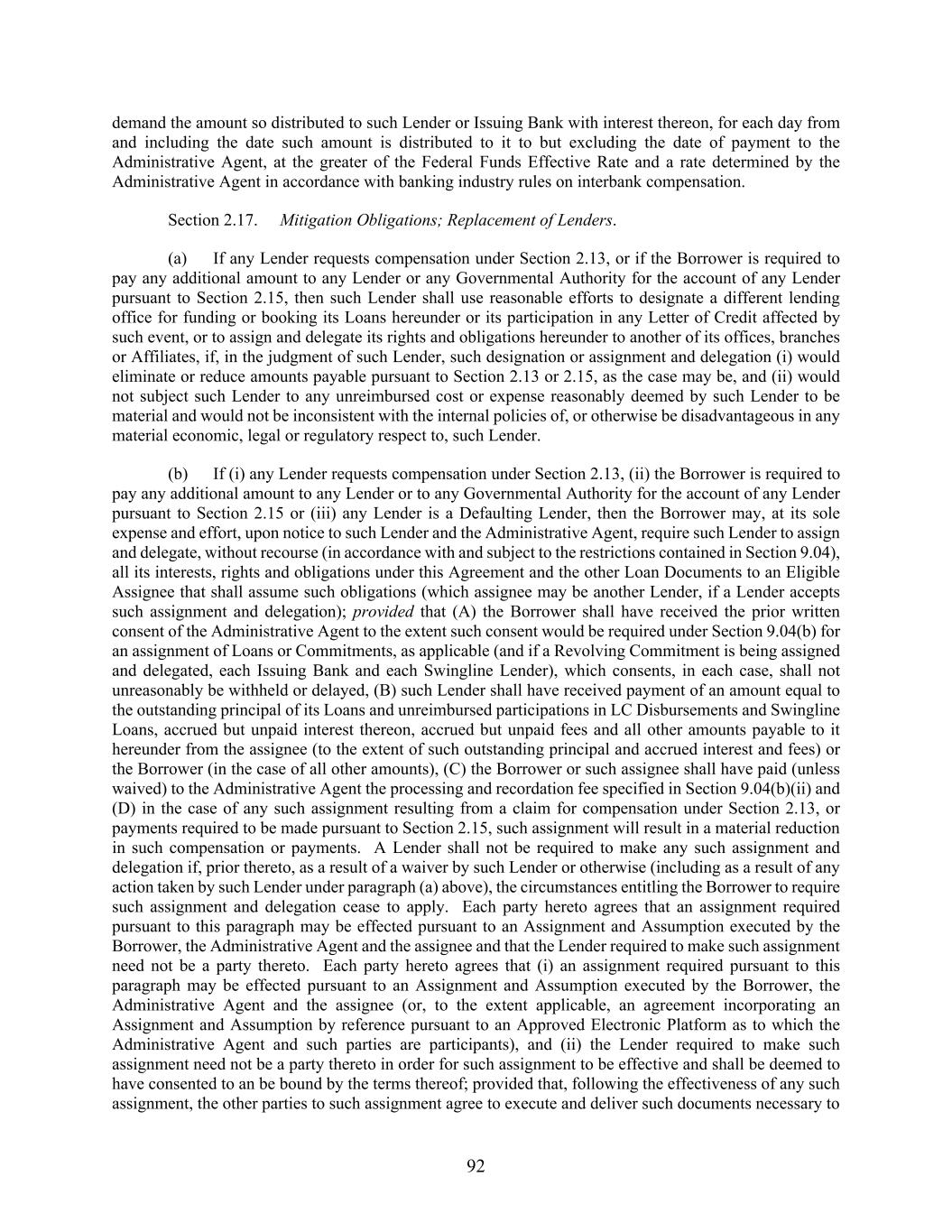 92 demand the amount so distributed to such Lender or Issuing Bank with interest thereon, for each day from and including the date such amount is distributed to it to but excluding the date of payment to the Administrative Agent, at the greater of the Federal Funds Effective Rate and a rate determined by the Administrative Agent in accordance with banking industry rules on interbank compensation. Section 2.17. Mitigation Obligations; Replacement of Lenders. (a) If any Lender requests compensation under Section 2.13, or if the Borrower is required to pay any additional amount to any Lender or any Governmental Authority for the account of any Lender pursuant to Section 2.15, then such Lender shall use reasonable efforts to designate a different lending office for funding or booking its Loans hereunder or its participation in any Letter of Credit affected by such event, or to assign and delegate its rights and obligations hereunder to another of its offices, branches or Affiliates, if, in the judgment of such Lender, such designation or assignment and delegation (i) would eliminate or reduce amounts payable pursuant to Section 2.13 or 2.15, as the case may be, and (ii) would not subject such Lender to any unreimbursed cost or expense reasonably deemed by such Lender to be material and would not be inconsistent with the internal policies of, or otherwise be disadvantageous in any material economic, legal or regulatory respect to, such Lender. (b) If (i) any Lender requests compensation under Section 2.13, (ii) the Borrower is required to pay any additional amount to any Lender or to any Governmental Authority for the account of any Lender pursuant to Section 2.15 or (iii) any Lender is a Defaulting Lender, then the Borrower may, at its sole expense and effort, upon notice to such Lender and the Administrative Agent, require such Lender to assign and delegate, without recourse (in accordance with and subject to the restrictions contained in Section 9.04), all its interests, rights and obligations under this Agreement and the other Loan Documents to an Eligible Assignee that shall assume such obligations (which assignee may be another Lender, if a Lender accepts such assignment and delegation); provided that (A) the Borrower shall have received the prior written consent of the Administrative Agent to the extent such consent would be required under Section 9.04(b) for an assignment of Loans or Commitments, as applicable (and if a Revolving Commitment is being assigned and delegated, each Issuing Bank and each Swingline Lender), which consents, in each case, shall not unreasonably be withheld or delayed, (B) such Lender shall have received payment of an amount equal to the outstanding principal of its Loans and unreimbursed participations in LC Disbursements and Swingline Loans, accrued but unpaid interest thereon, accrued but unpaid fees and all other amounts payable to it hereunder from the assignee (to the extent of such outstanding principal and accrued interest and fees) or the Borrower (in the case of all other amounts), (C) the Borrower or such assignee shall have paid (unless waived) to the Administrative Agent the processing and recordation fee specified in Section 9.04(b)(ii) and (D) in the case of any such assignment resulting from a claim for compensation under Section 2.13, or payments required to be made pursuant to Section 2.15, such assignment will result in a material reduction in such compensation or payments. A Lender shall not be required to make any such assignment and delegation if, prior thereto, as a result of a waiver by such Lender or otherwise (including as a result of any action taken by such Lender under paragraph (a) above), the circumstances entitling the Borrower to require such assignment and delegation cease to apply. Each party hereto agrees that an assignment required pursuant to this paragraph may be effected pursuant to an Assignment and Assumption executed by the Borrower, the Administrative Agent and the assignee and that the Lender required to make such assignment need not be a party thereto. Each party hereto agrees that (i) an assignment required pursuant to this paragraph may be effected pursuant to an Assignment and Assumption executed by the Borrower, the Administrative Agent and the assignee (or, to the extent applicable, an agreement incorporating an Assignment and Assumption by reference pursuant to an Approved Electronic Platform as to which the Administrative Agent and such parties are participants), and (ii) the Lender required to make such assignment need not be a party thereto in order for such assignment to be effective and shall be deemed to have consented to an be bound by the terms thereof; provided that, following the effectiveness of any such assignment, the other parties to such assignment agree to execute and deliver such documents necessary to