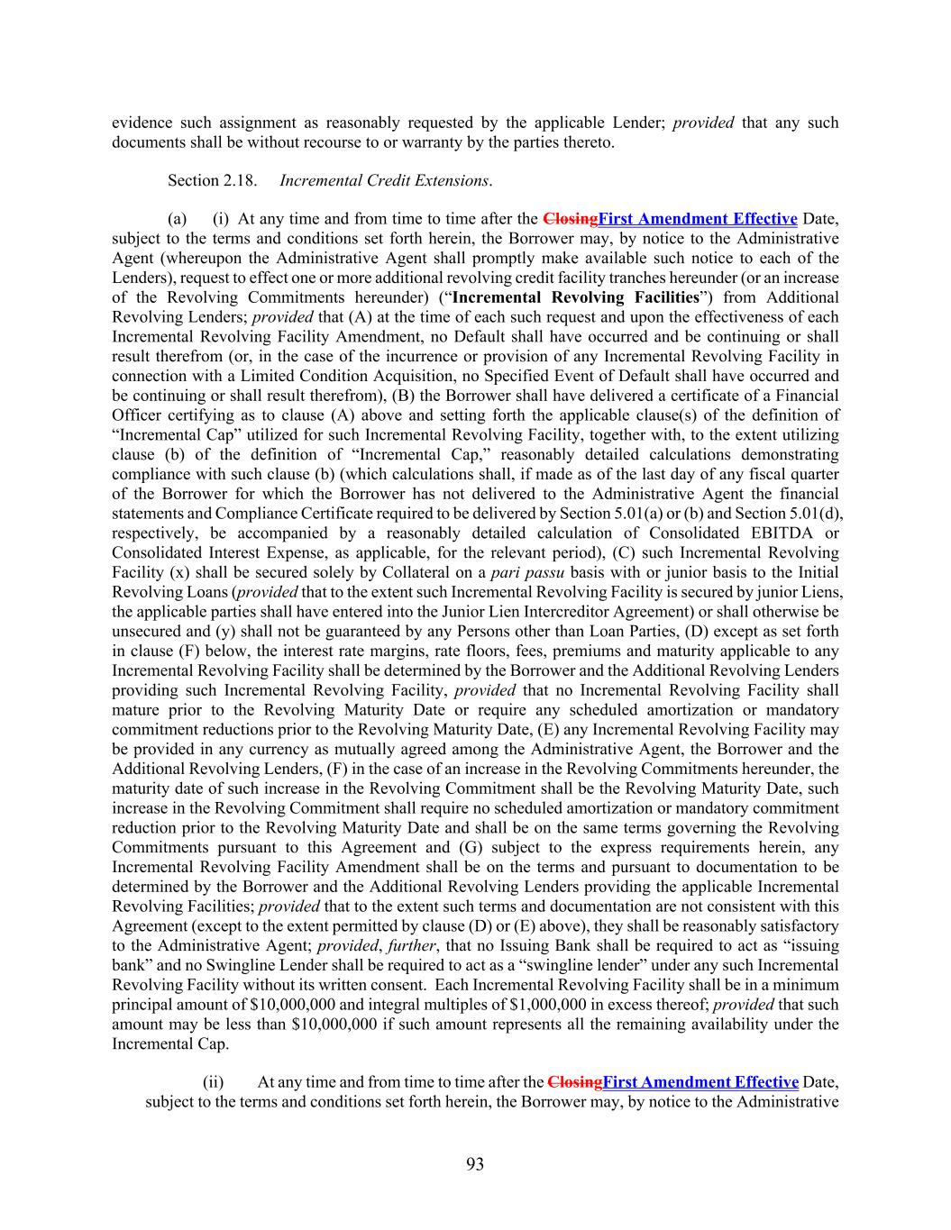93 evidence such assignment as reasonably requested by the applicable Lender; provided that any such documents shall be without recourse to or warranty by the parties thereto. Section 2.18. Incremental Credit Extensions. (a) (i) At any time and from time to time after the ClosingFirst Amendment Effective Date, subject to the terms and conditions set forth herein, the Borrower may, by notice to the Administrative Agent (whereupon the Administrative Agent shall promptly make available such notice to each of the Lenders), request to effect one or more additional revolving credit facility tranches hereunder (or an increase of the Revolving Commitments hereunder) (“Incremental Revolving Facilities”) from Additional Revolving Lenders; provided that (A) at the time of each such request and upon the effectiveness of each Incremental Revolving Facility Amendment, no Default shall have occurred and be continuing or shall result therefrom (or, in the case of the incurrence or provision of any Incremental Revolving Facility in connection with a Limited Condition Acquisition, no Specified Event of Default shall have occurred and be continuing or shall result therefrom), (B) the Borrower shall have delivered a certificate of a Financial Officer certifying as to clause (A) above and setting forth the applicable clause(s) of the definition of “Incremental Cap” utilized for such Incremental Revolving Facility, together with, to the extent utilizing clause (b) of the definition of “Incremental Cap,” reasonably detailed calculations demonstrating compliance with such clause (b) (which calculations shall, if made as of the last day of any fiscal quarter of the Borrower for which the Borrower has not delivered to the Administrative Agent the financial statements and Compliance Certificate required to be delivered by Section 5.01(a) or (b) and Section 5.01(d), respectively, be accompanied by a reasonably detailed calculation of Consolidated EBITDA or Consolidated Interest Expense, as applicable, for the relevant period), (C) such Incremental Revolving Facility (x) shall be secured solely by Collateral on a pari passu basis with or junior basis to the Initial Revolving Loans (provided that to the extent such Incremental Revolving Facility is secured by junior Liens, the applicable parties shall have entered into the Junior Lien Intercreditor Agreement) or shall otherwise be unsecured and (y) shall not be guaranteed by any Persons other than Loan Parties, (D) except as set forth in clause (F) below, the interest rate margins, rate floors, fees, premiums and maturity applicable to any Incremental Revolving Facility shall be determined by the Borrower and the Additional Revolving Lenders providing such Incremental Revolving Facility, provided that no Incremental Revolving Facility shall mature prior to the Revolving Maturity Date or require any scheduled amortization or mandatory commitment reductions prior to the Revolving Maturity Date, (E) any Incremental Revolving Facility may be provided in any currency as mutually agreed among the Administrative Agent, the Borrower and the Additional Revolving Lenders, (F) in the case of an increase in the Revolving Commitments hereunder, the maturity date of such increase in the Revolving Commitment shall be the Revolving Maturity Date, such increase in the Revolving Commitment shall require no scheduled amortization or mandatory commitment reduction prior to the Revolving Maturity Date and shall be on the same terms governing the Revolving Commitments pursuant to this Agreement and (G) subject to the express requirements herein, any Incremental Revolving Facility Amendment shall be on the terms and pursuant to documentation to be determined by the Borrower and the Additional Revolving Lenders providing the applicable Incremental Revolving Facilities; provided that to the extent such terms and documentation are not consistent with this Agreement (except to the extent permitted by clause (D) or (E) above), they shall be reasonably satisfactory to the Administrative Agent; provided, further, that no Issuing Bank shall be required to act as “issuing bank” and no Swingline Lender shall be required to act as a “swingline lender” under any such Incremental Revolving Facility without its written consent. Each Incremental Revolving Facility shall be in a minimum principal amount of $10,000,000 and integral multiples of $1,000,000 in excess thereof; provided that such amount may be less than $10,000,000 if such amount represents all the remaining availability under the Incremental Cap. (ii) At any time and from time to time after the ClosingFirst Amendment Effective Date, subject to the terms and conditions set forth herein, the Borrower may, by notice to the Administrative