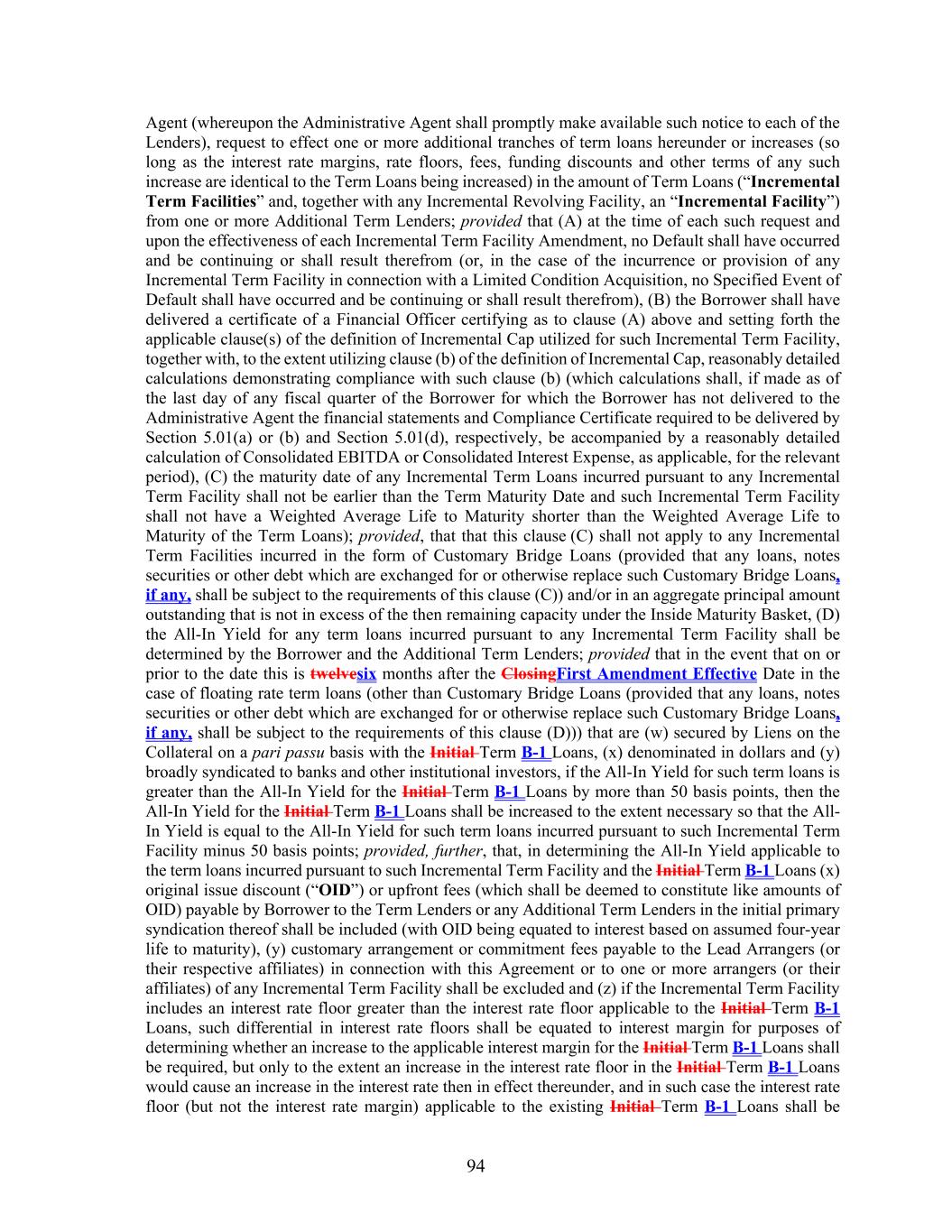 94 Agent (whereupon the Administrative Agent shall promptly make available such notice to each of the Lenders), request to effect one or more additional tranches of term loans hereunder or increases (so long as the interest rate margins, rate floors, fees, funding discounts and other terms of any such increase are identical to the Term Loans being increased) in the amount of Term Loans (“Incremental Term Facilities” and, together with any Incremental Revolving Facility, an “Incremental Facility”) from one or more Additional Term Lenders; provided that (A) at the time of each such request and upon the effectiveness of each Incremental Term Facility Amendment, no Default shall have occurred and be continuing or shall result therefrom (or, in the case of the incurrence or provision of any Incremental Term Facility in connection with a Limited Condition Acquisition, no Specified Event of Default shall have occurred and be continuing or shall result therefrom), (B) the Borrower shall have delivered a certificate of a Financial Officer certifying as to clause (A) above and setting forth the applicable clause(s) of the definition of Incremental Cap utilized for such Incremental Term Facility, together with, to the extent utilizing clause (b) of the definition of Incremental Cap, reasonably detailed calculations demonstrating compliance with such clause (b) (which calculations shall, if made as of the last day of any fiscal quarter of the Borrower for which the Borrower has not delivered to the Administrative Agent the financial statements and Compliance Certificate required to be delivered by Section 5.01(a) or (b) and Section 5.01(d), respectively, be accompanied by a reasonably detailed calculation of Consolidated EBITDA or Consolidated Interest Expense, as applicable, for the relevant period), (C) the maturity date of any Incremental Term Loans incurred pursuant to any Incremental Term Facility shall not be earlier than the Term Maturity Date and such Incremental Term Facility shall not have a Weighted Average Life to Maturity shorter than the Weighted Average Life to Maturity of the Term Loans); provided, that that this clause (C) shall not apply to any Incremental Term Facilities incurred in the form of Customary Bridge Loans (provided that any loans, notes securities or other debt which are exchanged for or otherwise replace such Customary Bridge Loans, if any, shall be subject to the requirements of this clause (C)) and/or in an aggregate principal amount outstanding that is not in excess of the then remaining capacity under the Inside Maturity Basket, (D) the All-In Yield for any term loans incurred pursuant to any Incremental Term Facility shall be determined by the Borrower and the Additional Term Lenders; provided that in the event that on or prior to the date this is twelvesix months after the ClosingFirst Amendment Effective Date in the case of floating rate term loans (other than Customary Bridge Loans (provided that any loans, notes securities or other debt which are exchanged for or otherwise replace such Customary Bridge Loans, if any, shall be subject to the requirements of this clause (D))) that are (w) secured by Liens on the Collateral on a pari passu basis with the Initial Term B-1 Loans, (x) denominated in dollars and (y) broadly syndicated to banks and other institutional investors, if the All-In Yield for such term loans is greater than the All-In Yield for the Initial Term B-1 Loans by more than 50 basis points, then the All-In Yield for the Initial Term B-1 Loans shall be increased to the extent necessary so that the All- In Yield is equal to the All-In Yield for such term loans incurred pursuant to such Incremental Term Facility minus 50 basis points; provided, further, that, in determining the All-In Yield applicable to the term loans incurred pursuant to such Incremental Term Facility and the Initial Term B-1 Loans (x) original issue discount (“OID”) or upfront fees (which shall be deemed to constitute like amounts of OID) payable by Borrower to the Term Lenders or any Additional Term Lenders in the initial primary syndication thereof shall be included (with OID being equated to interest based on assumed four-year life to maturity), (y) customary arrangement or commitment fees payable to the Lead Arrangers (or their respective affiliates) in connection with this Agreement or to one or more arrangers (or their affiliates) of any Incremental Term Facility shall be excluded and (z) if the Incremental Term Facility includes an interest rate floor greater than the interest rate floor applicable to the Initial Term B-1 Loans, such differential in interest rate floors shall be equated to interest margin for purposes of determining whether an increase to the applicable interest margin for the Initial Term B-1 Loans shall be required, but only to the extent an increase in the interest rate floor in the Initial Term B-1 Loans would cause an increase in the interest rate then in effect thereunder, and in such case the interest rate floor (but not the interest rate margin) applicable to the existing Initial Term B-1 Loans shall be