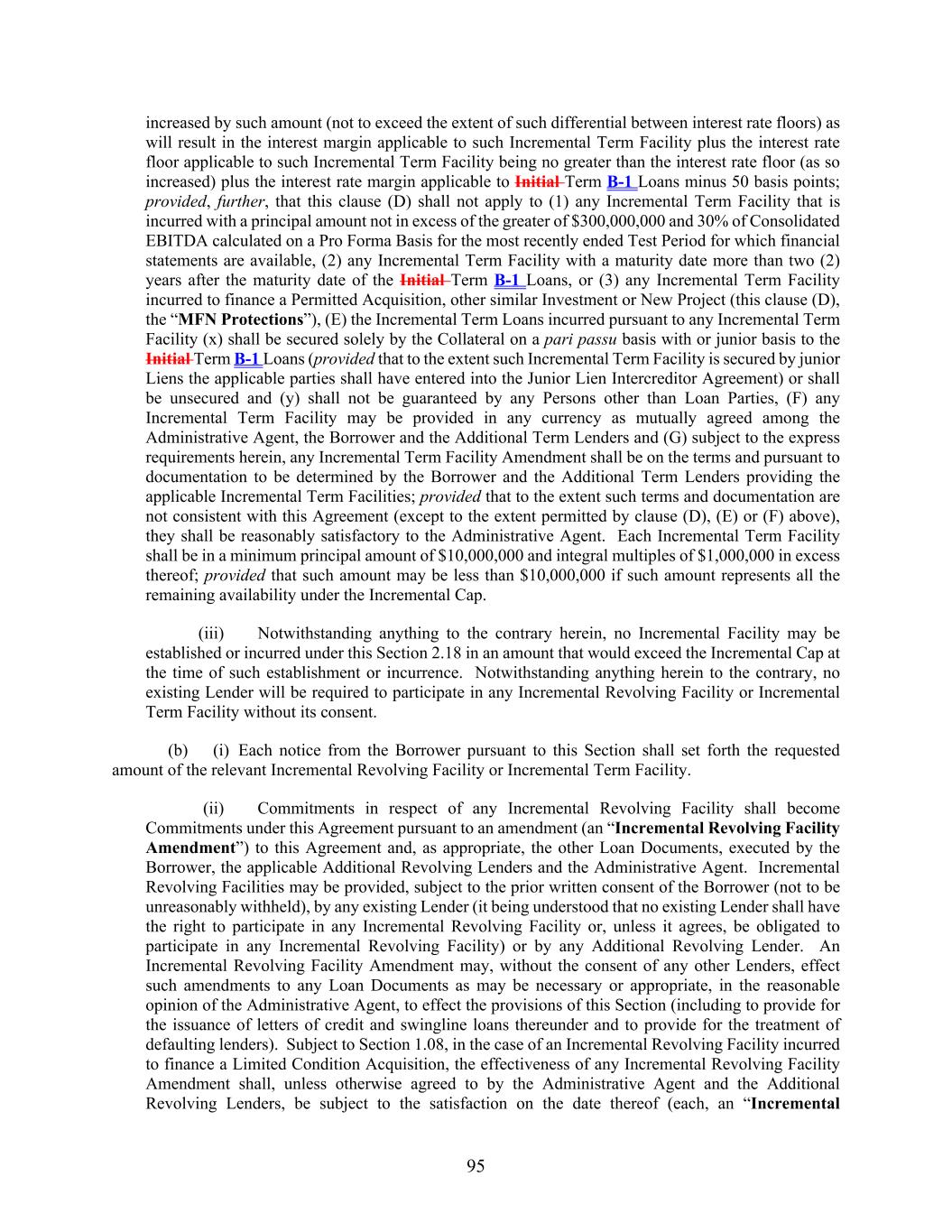 95 increased by such amount (not to exceed the extent of such differential between interest rate floors) as will result in the interest margin applicable to such Incremental Term Facility plus the interest rate floor applicable to such Incremental Term Facility being no greater than the interest rate floor (as so increased) plus the interest rate margin applicable to Initial Term B-1 Loans minus 50 basis points; provided, further, that this clause (D) shall not apply to (1) any Incremental Term Facility that is incurred with a principal amount not in excess of the greater of $300,000,000 and 30% of Consolidated EBITDA calculated on a Pro Forma Basis for the most recently ended Test Period for which financial statements are available, (2) any Incremental Term Facility with a maturity date more than two (2) years after the maturity date of the Initial Term B-1 Loans, or (3) any Incremental Term Facility incurred to finance a Permitted Acquisition, other similar Investment or New Project (this clause (D), the “MFN Protections”), (E) the Incremental Term Loans incurred pursuant to any Incremental Term Facility (x) shall be secured solely by the Collateral on a pari passu basis with or junior basis to the Initial Term B-1 Loans (provided that to the extent such Incremental Term Facility is secured by junior Liens the applicable parties shall have entered into the Junior Lien Intercreditor Agreement) or shall be unsecured and (y) shall not be guaranteed by any Persons other than Loan Parties, (F) any Incremental Term Facility may be provided in any currency as mutually agreed among the Administrative Agent, the Borrower and the Additional Term Lenders and (G) subject to the express requirements herein, any Incremental Term Facility Amendment shall be on the terms and pursuant to documentation to be determined by the Borrower and the Additional Term Lenders providing the applicable Incremental Term Facilities; provided that to the extent such terms and documentation are not consistent with this Agreement (except to the extent permitted by clause (D), (E) or (F) above), they shall be reasonably satisfactory to the Administrative Agent. Each Incremental Term Facility shall be in a minimum principal amount of $10,000,000 and integral multiples of $1,000,000 in excess thereof; provided that such amount may be less than $10,000,000 if such amount represents all the remaining availability under the Incremental Cap. (iii) Notwithstanding anything to the contrary herein, no Incremental Facility may be established or incurred under this Section 2.18 in an amount that would exceed the Incremental Cap at the time of such establishment or incurrence. Notwithstanding anything herein to the contrary, no existing Lender will be required to participate in any Incremental Revolving Facility or Incremental Term Facility without its consent. (b) (i) Each notice from the Borrower pursuant to this Section shall set forth the requested amount of the relevant Incremental Revolving Facility or Incremental Term Facility. (ii) Commitments in respect of any Incremental Revolving Facility shall become Commitments under this Agreement pursuant to an amendment (an “Incremental Revolving Facility Amendment”) to this Agreement and, as appropriate, the other Loan Documents, executed by the Borrower, the applicable Additional Revolving Lenders and the Administrative Agent. Incremental Revolving Facilities may be provided, subject to the prior written consent of the Borrower (not to be unreasonably withheld), by any existing Lender (it being understood that no existing Lender shall have the right to participate in any Incremental Revolving Facility or, unless it agrees, be obligated to participate in any Incremental Revolving Facility) or by any Additional Revolving Lender. An Incremental Revolving Facility Amendment may, without the consent of any other Lenders, effect such amendments to any Loan Documents as may be necessary or appropriate, in the reasonable opinion of the Administrative Agent, to effect the provisions of this Section (including to provide for the issuance of letters of credit and swingline loans thereunder and to provide for the treatment of defaulting lenders). Subject to Section 1.08, in the case of an Incremental Revolving Facility incurred to finance a Limited Condition Acquisition, the effectiveness of any Incremental Revolving Facility Amendment shall, unless otherwise agreed to by the Administrative Agent and the Additional Revolving Lenders, be subject to the satisfaction on the date thereof (each, an “Incremental