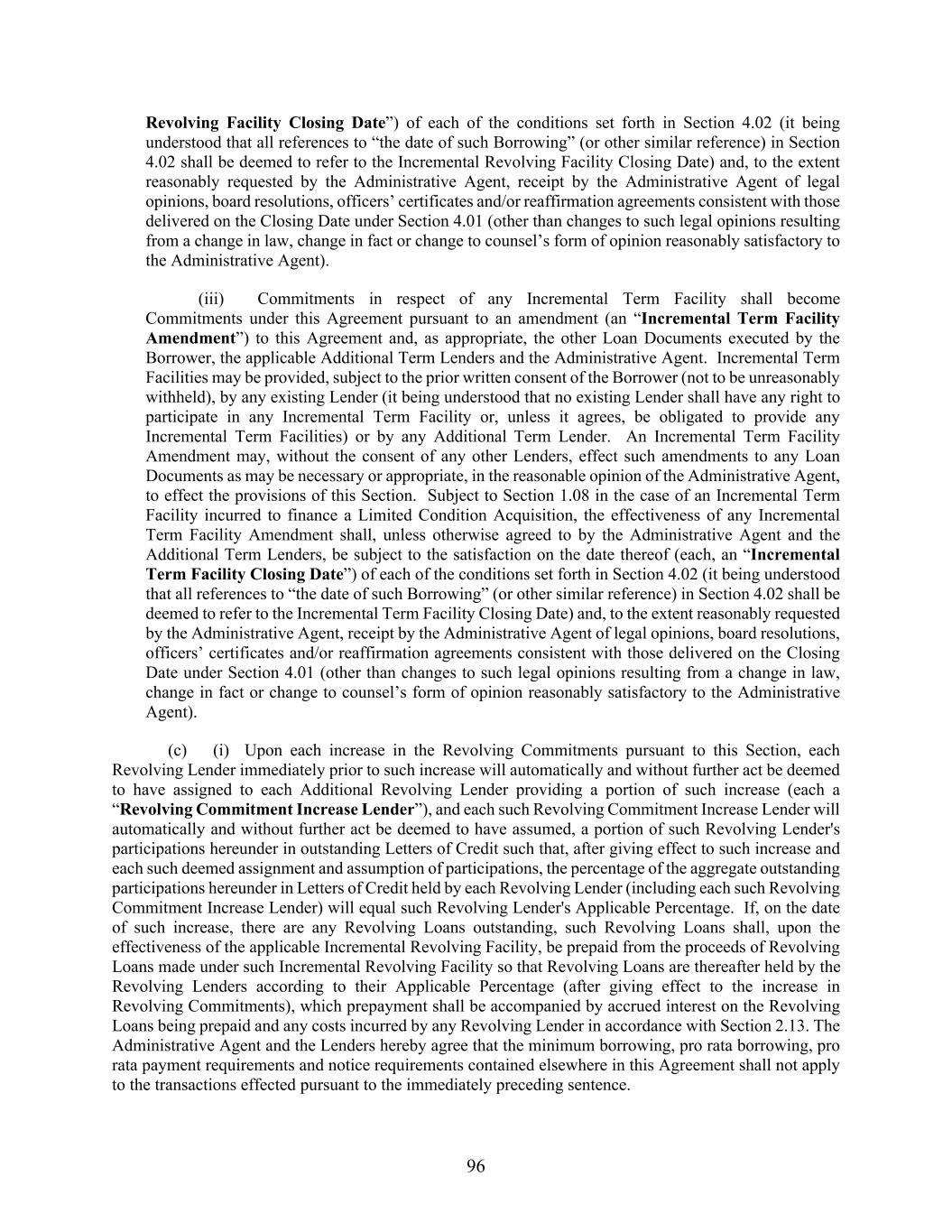 96 Revolving Facility Closing Date”) of each of the conditions set forth in Section 4.02 (it being understood that all references to “the date of such Borrowing” (or other similar reference) in Section 4.02 shall be deemed to refer to the Incremental Revolving Facility Closing Date) and, to the extent reasonably requested by the Administrative Agent, receipt by the Administrative Agent of legal opinions, board resolutions, officers’ certificates and/or reaffirmation agreements consistent with those delivered on the Closing Date under Section 4.01 (other than changes to such legal opinions resulting from a change in law, change in fact or change to counsel’s form of opinion reasonably satisfactory to the Administrative Agent). (iii) Commitments in respect of any Incremental Term Facility shall become Commitments under this Agreement pursuant to an amendment (an “Incremental Term Facility Amendment”) to this Agreement and, as appropriate, the other Loan Documents executed by the Borrower, the applicable Additional Term Lenders and the Administrative Agent. Incremental Term Facilities may be provided, subject to the prior written consent of the Borrower (not to be unreasonably withheld), by any existing Lender (it being understood that no existing Lender shall have any right to participate in any Incremental Term Facility or, unless it agrees, be obligated to provide any Incremental Term Facilities) or by any Additional Term Lender. An Incremental Term Facility Amendment may, without the consent of any other Lenders, effect such amendments to any Loan Documents as may be necessary or appropriate, in the reasonable opinion of the Administrative Agent, to effect the provisions of this Section. Subject to Section 1.08 in the case of an Incremental Term Facility incurred to finance a Limited Condition Acquisition, the effectiveness of any Incremental Term Facility Amendment shall, unless otherwise agreed to by the Administrative Agent and the Additional Term Lenders, be subject to the satisfaction on the date thereof (each, an “Incremental Term Facility Closing Date”) of each of the conditions set forth in Section 4.02 (it being understood that all references to “the date of such Borrowing” (or other similar reference) in Section 4.02 shall be deemed to refer to the Incremental Term Facility Closing Date) and, to the extent reasonably requested by the Administrative Agent, receipt by the Administrative Agent of legal opinions, board resolutions, officers’ certificates and/or reaffirmation agreements consistent with those delivered on the Closing Date under Section 4.01 (other than changes to such legal opinions resulting from a change in law, change in fact or change to counsel’s form of opinion reasonably satisfactory to the Administrative Agent). (c) (i) Upon each increase in the Revolving Commitments pursuant to this Section, each Revolving Lender immediately prior to such increase will automatically and without further act be deemed to have assigned to each Additional Revolving Lender providing a portion of such increase (each a “Revolving Commitment Increase Lender”), and each such Revolving Commitment Increase Lender will automatically and without further act be deemed to have assumed, a portion of such Revolving Lender's participations hereunder in outstanding Letters of Credit such that, after giving effect to such increase and each such deemed assignment and assumption of participations, the percentage of the aggregate outstanding participations hereunder in Letters of Credit held by each Revolving Lender (including each such Revolving Commitment Increase Lender) will equal such Revolving Lender's Applicable Percentage. If, on the date of such increase, there are any Revolving Loans outstanding, such Revolving Loans shall, upon the effectiveness of the applicable Incremental Revolving Facility, be prepaid from the proceeds of Revolving Loans made under such Incremental Revolving Facility so that Revolving Loans are thereafter held by the Revolving Lenders according to their Applicable Percentage (after giving effect to the increase in Revolving Commitments), which prepayment shall be accompanied by accrued interest on the Revolving Loans being prepaid and any costs incurred by any Revolving Lender in accordance with Section 2.13. The Administrative Agent and the Lenders hereby agree that the minimum borrowing, pro rata borrowing, pro rata payment requirements and notice requirements contained elsewhere in this Agreement shall not apply to the transactions effected pursuant to the immediately preceding sentence.