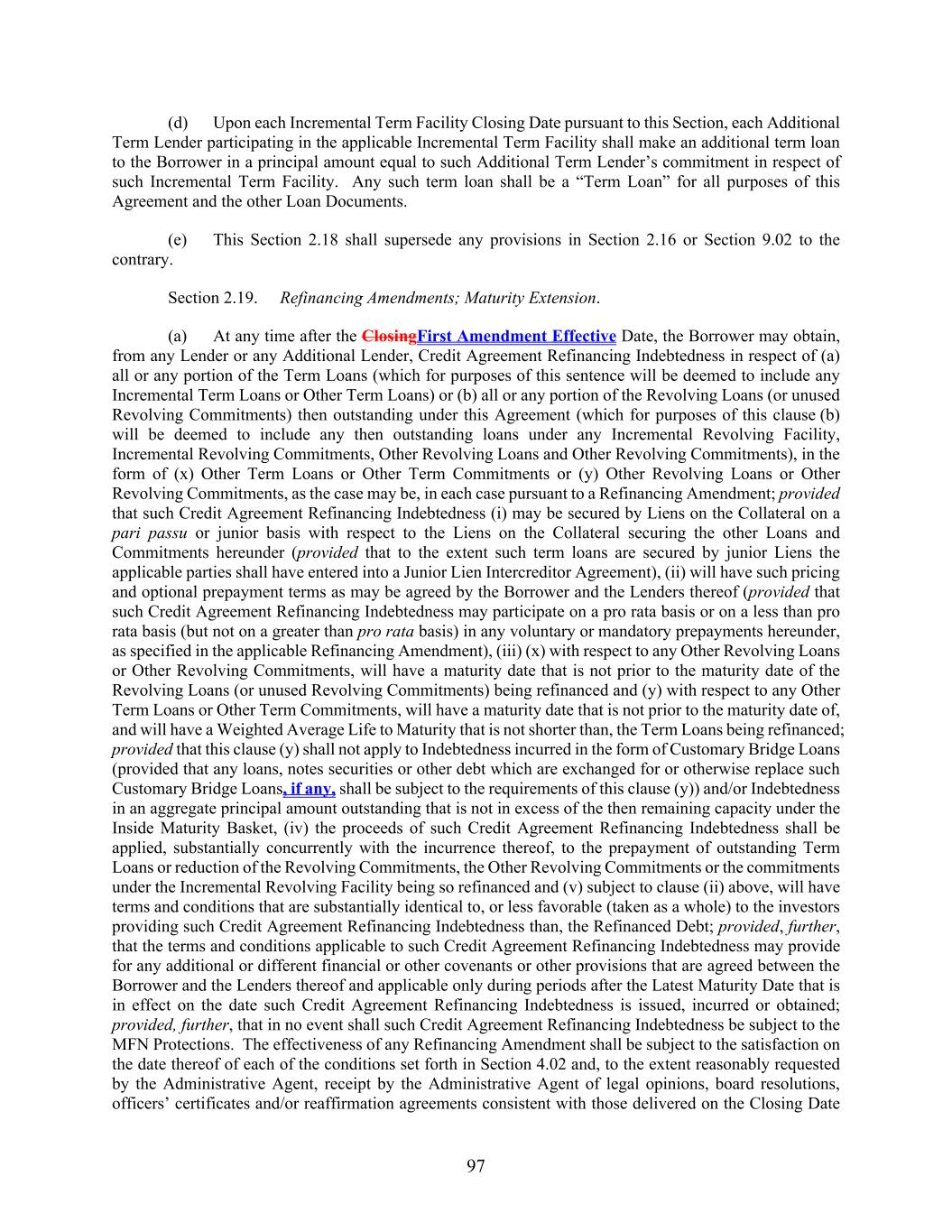 97 (d) Upon each Incremental Term Facility Closing Date pursuant to this Section, each Additional Term Lender participating in the applicable Incremental Term Facility shall make an additional term loan to the Borrower in a principal amount equal to such Additional Term Lender’s commitment in respect of such Incremental Term Facility. Any such term loan shall be a “Term Loan” for all purposes of this Agreement and the other Loan Documents. (e) This Section 2.18 shall supersede any provisions in Section 2.16 or Section 9.02 to the contrary. Section 2.19. Refinancing Amendments; Maturity Extension. (a) At any time after the ClosingFirst Amendment Effective Date, the Borrower may obtain, from any Lender or any Additional Lender, Credit Agreement Refinancing Indebtedness in respect of (a) all or any portion of the Term Loans (which for purposes of this sentence will be deemed to include any Incremental Term Loans or Other Term Loans) or (b) all or any portion of the Revolving Loans (or unused Revolving Commitments) then outstanding under this Agreement (which for purposes of this clause (b) will be deemed to include any then outstanding loans under any Incremental Revolving Facility, Incremental Revolving Commitments, Other Revolving Loans and Other Revolving Commitments), in the form of (x) Other Term Loans or Other Term Commitments or (y) Other Revolving Loans or Other Revolving Commitments, as the case may be, in each case pursuant to a Refinancing Amendment; provided that such Credit Agreement Refinancing Indebtedness (i) may be secured by Liens on the Collateral on a pari passu or junior basis with respect to the Liens on the Collateral securing the other Loans and Commitments hereunder (provided that to the extent such term loans are secured by junior Liens the applicable parties shall have entered into a Junior Lien Intercreditor Agreement), (ii) will have such pricing and optional prepayment terms as may be agreed by the Borrower and the Lenders thereof (provided that such Credit Agreement Refinancing Indebtedness may participate on a pro rata basis or on a less than pro rata basis (but not on a greater than pro rata basis) in any voluntary or mandatory prepayments hereunder, as specified in the applicable Refinancing Amendment), (iii) (x) with respect to any Other Revolving Loans or Other Revolving Commitments, will have a maturity date that is not prior to the maturity date of the Revolving Loans (or unused Revolving Commitments) being refinanced and (y) with respect to any Other Term Loans or Other Term Commitments, will have a maturity date that is not prior to the maturity date of, and will have a Weighted Average Life to Maturity that is not shorter than, the Term Loans being refinanced; provided that this clause (y) shall not apply to Indebtedness incurred in the form of Customary Bridge Loans (provided that any loans, notes securities or other debt which are exchanged for or otherwise replace such Customary Bridge Loans, if any, shall be subject to the requirements of this clause (y)) and/or Indebtedness in an aggregate principal amount outstanding that is not in excess of the then remaining capacity under the Inside Maturity Basket, (iv) the proceeds of such Credit Agreement Refinancing Indebtedness shall be applied, substantially concurrently with the incurrence thereof, to the prepayment of outstanding Term Loans or reduction of the Revolving Commitments, the Other Revolving Commitments or the commitments under the Incremental Revolving Facility being so refinanced and (v) subject to clause (ii) above, will have terms and conditions that are substantially identical to, or less favorable (taken as a whole) to the investors providing such Credit Agreement Refinancing Indebtedness than, the Refinanced Debt; provided, further, that the terms and conditions applicable to such Credit Agreement Refinancing Indebtedness may provide for any additional or different financial or other covenants or other provisions that are agreed between the Borrower and the Lenders thereof and applicable only during periods after the Latest Maturity Date that is in effect on the date such Credit Agreement Refinancing Indebtedness is issued, incurred or obtained; provided, further, that in no event shall such Credit Agreement Refinancing Indebtedness be subject to the MFN Protections. The effectiveness of any Refinancing Amendment shall be subject to the satisfaction on the date thereof of each of the conditions set forth in Section 4.02 and, to the extent reasonably requested by the Administrative Agent, receipt by the Administrative Agent of legal opinions, board resolutions, officers’ certificates and/or reaffirmation agreements consistent with those delivered on the Closing Date
