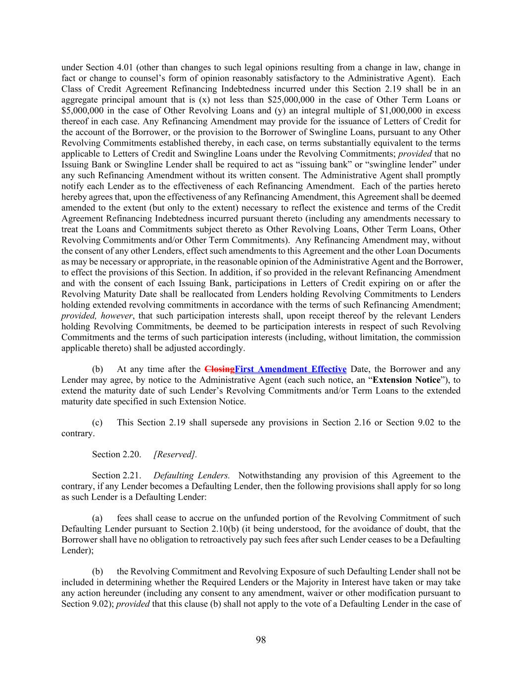 98 under Section 4.01 (other than changes to such legal opinions resulting from a change in law, change in fact or change to counsel’s form of opinion reasonably satisfactory to the Administrative Agent). Each Class of Credit Agreement Refinancing Indebtedness incurred under this Section 2.19 shall be in an aggregate principal amount that is (x) not less than $25,000,000 in the case of Other Term Loans or $5,000,000 in the case of Other Revolving Loans and (y) an integral multiple of $1,000,000 in excess thereof in each case. Any Refinancing Amendment may provide for the issuance of Letters of Credit for the account of the Borrower, or the provision to the Borrower of Swingline Loans, pursuant to any Other Revolving Commitments established thereby, in each case, on terms substantially equivalent to the terms applicable to Letters of Credit and Swingline Loans under the Revolving Commitments; provided that no Issuing Bank or Swingline Lender shall be required to act as “issuing bank” or “swingline lender” under any such Refinancing Amendment without its written consent. The Administrative Agent shall promptly notify each Lender as to the effectiveness of each Refinancing Amendment. Each of the parties hereto hereby agrees that, upon the effectiveness of any Refinancing Amendment, this Agreement shall be deemed amended to the extent (but only to the extent) necessary to reflect the existence and terms of the Credit Agreement Refinancing Indebtedness incurred pursuant thereto (including any amendments necessary to treat the Loans and Commitments subject thereto as Other Revolving Loans, Other Term Loans, Other Revolving Commitments and/or Other Term Commitments). Any Refinancing Amendment may, without the consent of any other Lenders, effect such amendments to this Agreement and the other Loan Documents as may be necessary or appropriate, in the reasonable opinion of the Administrative Agent and the Borrower, to effect the provisions of this Section. In addition, if so provided in the relevant Refinancing Amendment and with the consent of each Issuing Bank, participations in Letters of Credit expiring on or after the Revolving Maturity Date shall be reallocated from Lenders holding Revolving Commitments to Lenders holding extended revolving commitments in accordance with the terms of such Refinancing Amendment; provided, however, that such participation interests shall, upon receipt thereof by the relevant Lenders holding Revolving Commitments, be deemed to be participation interests in respect of such Revolving Commitments and the terms of such participation interests (including, without limitation, the commission applicable thereto) shall be adjusted accordingly. (b) At any time after the ClosingFirst Amendment Effective Date, the Borrower and any Lender may agree, by notice to the Administrative Agent (each such notice, an “Extension Notice”), to extend the maturity date of such Lender’s Revolving Commitments and/or Term Loans to the extended maturity date specified in such Extension Notice. (c) This Section 2.19 shall supersede any provisions in Section 2.16 or Section 9.02 to the contrary. Section 2.20. [Reserved]. Section 2.21. Defaulting Lenders. Notwithstanding any provision of this Agreement to the contrary, if any Lender becomes a Defaulting Lender, then the following provisions shall apply for so long as such Lender is a Defaulting Lender: (a) fees shall cease to accrue on the unfunded portion of the Revolving Commitment of such Defaulting Lender pursuant to Section 2.10(b) (it being understood, for the avoidance of doubt, that the Borrower shall have no obligation to retroactively pay such fees after such Lender ceases to be a Defaulting Lender); (b) the Revolving Commitment and Revolving Exposure of such Defaulting Lender shall not be included in determining whether the Required Lenders or the Majority in Interest have taken or may take any action hereunder (including any consent to any amendment, waiver or other modification pursuant to Section 9.02); provided that this clause (b) shall not apply to the vote of a Defaulting Lender in the case of