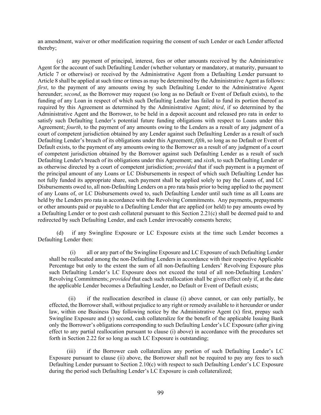 99 an amendment, waiver or other modification requiring the consent of such Lender or each Lender affected thereby; (c) any payment of principal, interest, fees or other amounts received by the Administrative Agent for the account of such Defaulting Lender (whether voluntary or mandatory, at maturity, pursuant to Article 7 or otherwise) or received by the Administrative Agent from a Defaulting Lender pursuant to Article 8 shall be applied at such time or times as may be determined by the Administrative Agent as follows: first, to the payment of any amounts owing by such Defaulting Lender to the Administrative Agent hereunder; second, as the Borrower may request (so long as no Default or Event of Default exists), to the funding of any Loan in respect of which such Defaulting Lender has failed to fund its portion thereof as required by this Agreement as determined by the Administrative Agent; third, if so determined by the Administrative Agent and the Borrower, to be held in a deposit account and released pro rata in order to satisfy such Defaulting Lender’s potential future funding obligations with respect to Loans under this Agreement; fourth, to the payment of any amounts owing to the Lenders as a result of any judgment of a court of competent jurisdiction obtained by any Lender against such Defaulting Lender as a result of such Defaulting Lender’s breach of its obligations under this Agreement; fifth, so long as no Default or Event of Default exists, to the payment of any amounts owing to the Borrower as a result of any judgment of a court of competent jurisdiction obtained by the Borrower against such Defaulting Lender as a result of such Defaulting Lender's breach of its obligations under this Agreement; and sixth, to such Defaulting Lender or as otherwise directed by a court of competent jurisdiction; provided that if such payment is a payment of the principal amount of any Loans or LC Disbursements in respect of which such Defaulting Lender has not fully funded its appropriate share, such payment shall be applied solely to pay the Loans of, and LC Disbursements owed to, all non-Defaulting Lenders on a pro rata basis prior to being applied to the payment of any Loans of, or LC Disbursements owed to, such Defaulting Lender until such time as all Loans are held by the Lenders pro rata in accordance with the Revolving Commitments. Any payments, prepayments or other amounts paid or payable to a Defaulting Lender that are applied (or held) to pay amounts owed by a Defaulting Lender or to post cash collateral pursuant to this Section 2.21(c) shall be deemed paid to and redirected by such Defaulting Lender, and each Lender irrevocably consents hereto; (d) if any Swingline Exposure or LC Exposure exists at the time such Lender becomes a Defaulting Lender then: (i) all or any part of the Swingline Exposure and LC Exposure of such Defaulting Lender shall be reallocated among the non-Defaulting Lenders in accordance with their respective Applicable Percentage but only to the extent the sum of all non-Defaulting Lenders’ Revolving Exposure plus such Defaulting Lender’s LC Exposure does not exceed the total of all non-Defaulting Lenders’ Revolving Commitments; provided that each such reallocation shall be given effect only if, at the date the applicable Lender becomes a Defaulting Lender, no Default or Event of Default exists; (ii) if the reallocation described in clause (i) above cannot, or can only partially, be effected, the Borrower shall, without prejudice to any right or remedy available to it hereunder or under law, within one Business Day following notice by the Administrative Agent (x) first, prepay such Swingline Exposure and (y) second, cash collateralize for the benefit of the applicable Issuing Bank only the Borrower’s obligations corresponding to such Defaulting Lender’s LC Exposure (after giving effect to any partial reallocation pursuant to clause (i) above) in accordance with the procedures set forth in Section 2.22 for so long as such LC Exposure is outstanding; (iii) if the Borrower cash collateralizes any portion of such Defaulting Lender’s LC Exposure pursuant to clause (ii) above, the Borrower shall not be required to pay any fees to such Defaulting Lender pursuant to Section 2.10(c) with respect to such Defaulting Lender’s LC Exposure during the period such Defaulting Lender’s LC Exposure is cash collateralized;