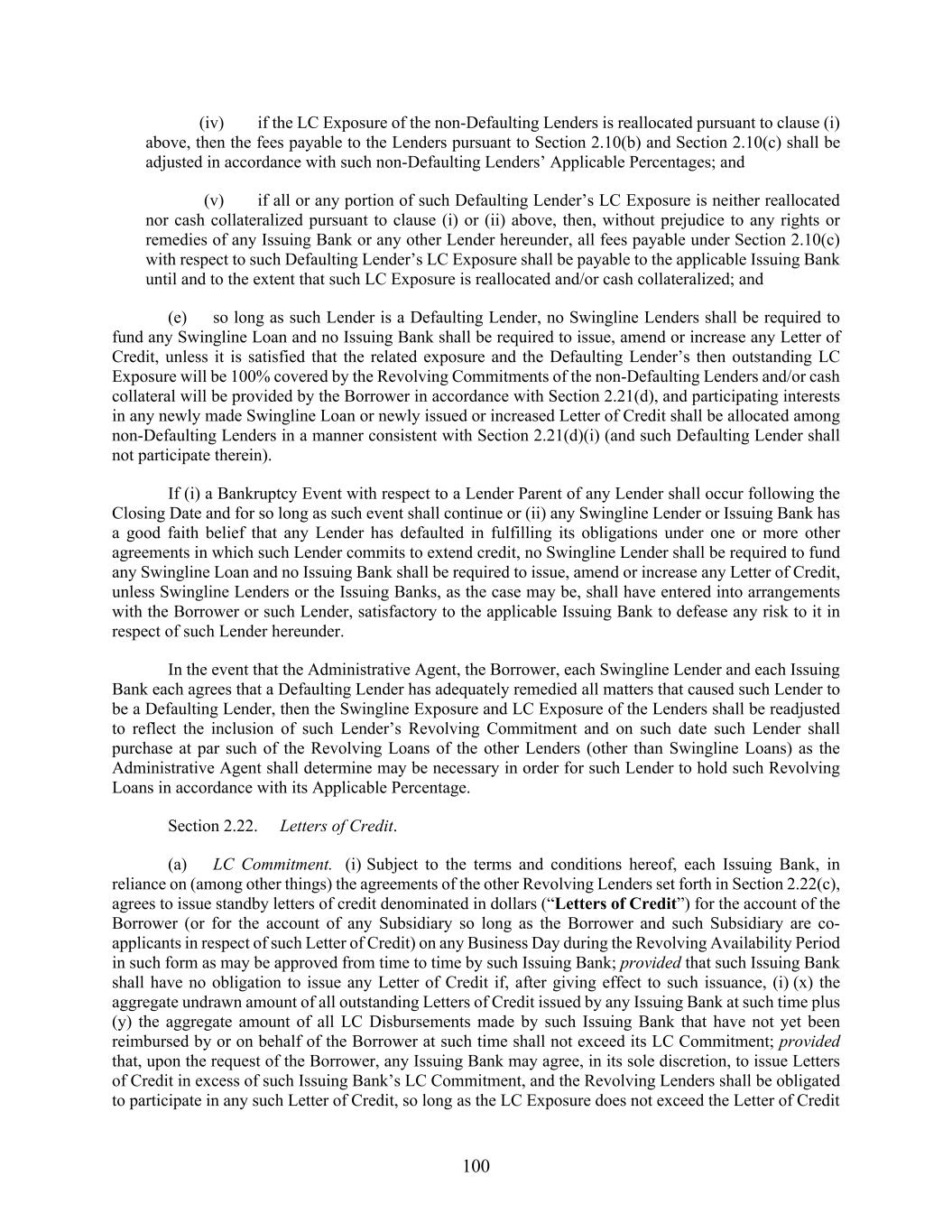 100 (iv) if the LC Exposure of the non-Defaulting Lenders is reallocated pursuant to clause (i) above, then the fees payable to the Lenders pursuant to Section 2.10(b) and Section 2.10(c) shall be adjusted in accordance with such non-Defaulting Lenders’ Applicable Percentages; and (v) if all or any portion of such Defaulting Lender’s LC Exposure is neither reallocated nor cash collateralized pursuant to clause (i) or (ii) above, then, without prejudice to any rights or remedies of any Issuing Bank or any other Lender hereunder, all fees payable under Section 2.10(c) with respect to such Defaulting Lender’s LC Exposure shall be payable to the applicable Issuing Bank until and to the extent that such LC Exposure is reallocated and/or cash collateralized; and (e) so long as such Lender is a Defaulting Lender, no Swingline Lenders shall be required to fund any Swingline Loan and no Issuing Bank shall be required to issue, amend or increase any Letter of Credit, unless it is satisfied that the related exposure and the Defaulting Lender’s then outstanding LC Exposure will be 100% covered by the Revolving Commitments of the non-Defaulting Lenders and/or cash collateral will be provided by the Borrower in accordance with Section 2.21(d), and participating interests in any newly made Swingline Loan or newly issued or increased Letter of Credit shall be allocated among non-Defaulting Lenders in a manner consistent with Section 2.21(d)(i) (and such Defaulting Lender shall not participate therein). If (i) a Bankruptcy Event with respect to a Lender Parent of any Lender shall occur following the Closing Date and for so long as such event shall continue or (ii) any Swingline Lender or Issuing Bank has a good faith belief that any Lender has defaulted in fulfilling its obligations under one or more other agreements in which such Lender commits to extend credit, no Swingline Lender shall be required to fund any Swingline Loan and no Issuing Bank shall be required to issue, amend or increase any Letter of Credit, unless Swingline Lenders or the Issuing Banks, as the case may be, shall have entered into arrangements with the Borrower or such Lender, satisfactory to the applicable Issuing Bank to defease any risk to it in respect of such Lender hereunder. In the event that the Administrative Agent, the Borrower, each Swingline Lender and each Issuing Bank each agrees that a Defaulting Lender has adequately remedied all matters that caused such Lender to be a Defaulting Lender, then the Swingline Exposure and LC Exposure of the Lenders shall be readjusted to reflect the inclusion of such Lender’s Revolving Commitment and on such date such Lender shall purchase at par such of the Revolving Loans of the other Lenders (other than Swingline Loans) as the Administrative Agent shall determine may be necessary in order for such Lender to hold such Revolving Loans in accordance with its Applicable Percentage. Section 2.22. Letters of Credit. (a) LC Commitment. (i) Subject to the terms and conditions hereof, each Issuing Bank, in reliance on (among other things) the agreements of the other Revolving Lenders set forth in Section 2.22(c), agrees to issue standby letters of credit denominated in dollars (“Letters of Credit”) for the account of the Borrower (or for the account of any Subsidiary so long as the Borrower and such Subsidiary are co- applicants in respect of such Letter of Credit) on any Business Day during the Revolving Availability Period in such form as may be approved from time to time by such Issuing Bank; provided that such Issuing Bank shall have no obligation to issue any Letter of Credit if, after giving effect to such issuance, (i) (x) the aggregate undrawn amount of all outstanding Letters of Credit issued by any Issuing Bank at such time plus (y) the aggregate amount of all LC Disbursements made by such Issuing Bank that have not yet been reimbursed by or on behalf of the Borrower at such time shall not exceed its LC Commitment; provided that, upon the request of the Borrower, any Issuing Bank may agree, in its sole discretion, to issue Letters of Credit in excess of such Issuing Bank’s LC Commitment, and the Revolving Lenders shall be obligated to participate in any such Letter of Credit, so long as the LC Exposure does not exceed the Letter of Credit