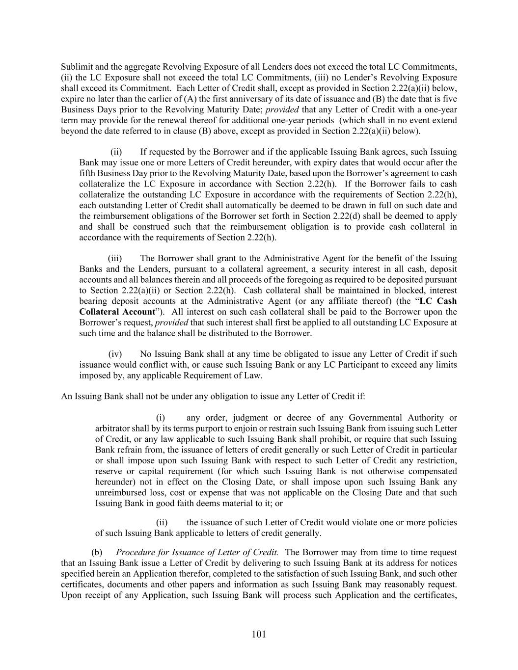 101 Sublimit and the aggregate Revolving Exposure of all Lenders does not exceed the total LC Commitments, (ii) the LC Exposure shall not exceed the total LC Commitments, (iii) no Lender’s Revolving Exposure shall exceed its Commitment. Each Letter of Credit shall, except as provided in Section 2.22(a)(ii) below, expire no later than the earlier of (A) the first anniversary of its date of issuance and (B) the date that is five Business Days prior to the Revolving Maturity Date; provided that any Letter of Credit with a one-year term may provide for the renewal thereof for additional one-year periods (which shall in no event extend beyond the date referred to in clause (B) above, except as provided in Section 2.22(a)(ii) below). (ii) If requested by the Borrower and if the applicable Issuing Bank agrees, such Issuing Bank may issue one or more Letters of Credit hereunder, with expiry dates that would occur after the fifth Business Day prior to the Revolving Maturity Date, based upon the Borrower’s agreement to cash collateralize the LC Exposure in accordance with Section 2.22(h). If the Borrower fails to cash collateralize the outstanding LC Exposure in accordance with the requirements of Section 2.22(h), each outstanding Letter of Credit shall automatically be deemed to be drawn in full on such date and the reimbursement obligations of the Borrower set forth in Section 2.22(d) shall be deemed to apply and shall be construed such that the reimbursement obligation is to provide cash collateral in accordance with the requirements of Section 2.22(h). (iii) The Borrower shall grant to the Administrative Agent for the benefit of the Issuing Banks and the Lenders, pursuant to a collateral agreement, a security interest in all cash, deposit accounts and all balances therein and all proceeds of the foregoing as required to be deposited pursuant to Section 2.22(a)(ii) or Section 2.22(h). Cash collateral shall be maintained in blocked, interest bearing deposit accounts at the Administrative Agent (or any affiliate thereof) (the “LC Cash Collateral Account”). All interest on such cash collateral shall be paid to the Borrower upon the Borrower’s request, provided that such interest shall first be applied to all outstanding LC Exposure at such time and the balance shall be distributed to the Borrower. (iv) No Issuing Bank shall at any time be obligated to issue any Letter of Credit if such issuance would conflict with, or cause such Issuing Bank or any LC Participant to exceed any limits imposed by, any applicable Requirement of Law. An Issuing Bank shall not be under any obligation to issue any Letter of Credit if: (i) any order, judgment or decree of any Governmental Authority or arbitrator shall by its terms purport to enjoin or restrain such Issuing Bank from issuing such Letter of Credit, or any law applicable to such Issuing Bank shall prohibit, or require that such Issuing Bank refrain from, the issuance of letters of credit generally or such Letter of Credit in particular or shall impose upon such Issuing Bank with respect to such Letter of Credit any restriction, reserve or capital requirement (for which such Issuing Bank is not otherwise compensated hereunder) not in effect on the Closing Date, or shall impose upon such Issuing Bank any unreimbursed loss, cost or expense that was not applicable on the Closing Date and that such Issuing Bank in good faith deems material to it; or (ii) the issuance of such Letter of Credit would violate one or more policies of such Issuing Bank applicable to letters of credit generally. (b) Procedure for Issuance of Letter of Credit. The Borrower may from time to time request that an Issuing Bank issue a Letter of Credit by delivering to such Issuing Bank at its address for notices specified herein an Application therefor, completed to the satisfaction of such Issuing Bank, and such other certificates, documents and other papers and information as such Issuing Bank may reasonably request. Upon receipt of any Application, such Issuing Bank will process such Application and the certificates,