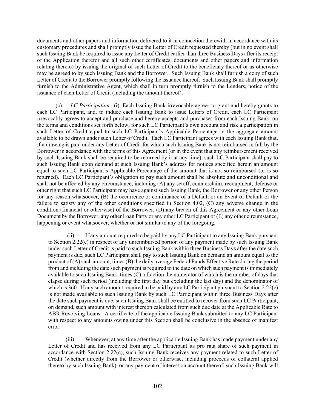 102 documents and other papers and information delivered to it in connection therewith in accordance with its customary procedures and shall promptly issue the Letter of Credit requested thereby (but in no event shall such Issuing Bank be required to issue any Letter of Credit earlier than three Business Days after its receipt of the Application therefor and all such other certificates, documents and other papers and information relating thereto) by issuing the original of such Letter of Credit to the beneficiary thereof or as otherwise may be agreed to by such Issuing Bank and the Borrower. Such Issuing Bank shall furnish a copy of such Letter of Credit to the Borrower promptly following the issuance thereof. Such Issuing Bank shall promptly furnish to the Administrative Agent, which shall in turn promptly furnish to the Lenders, notice of the issuance of each Letter of Credit (including the amount thereof). (c) LC Participation. (i) Each Issuing Bank irrevocably agrees to grant and hereby grants to each LC Participant, and, to induce each Issuing Bank to issue Letters of Credit, each LC Participant irrevocably agrees to accept and purchase and hereby accepts and purchases from each Issuing Bank, on the terms and conditions set forth below, for such LC Participant’s own account and risk a participation in such Letter of Credit equal to such LC Participant’s Applicable Percentage in the aggregate amount available to be drawn under such Letter of Credit. Each LC Participant agrees with each Issuing Bank that, if a drawing is paid under any Letter of Credit for which such Issuing Bank is not reimbursed in full by the Borrower in accordance with the terms of this Agreement (or in the event that any reimbursement received by such Issuing Bank shall be required to be returned by it at any time), such LC Participant shall pay to such Issuing Bank upon demand at such Issuing Bank’s address for notices specified herein an amount equal to such LC Participant’s Applicable Percentage of the amount that is not so reimbursed (or is so returned). Each LC Participant’s obligation to pay such amount shall be absolute and unconditional and shall not be affected by any circumstance, including (A) any setoff, counterclaim, recoupment, defense or other right that such LC Participant may have against such Issuing Bank, the Borrower or any other Person for any reason whatsoever, (B) the occurrence or continuance of a Default or an Event of Default or the failure to satisfy any of the other conditions specified in Section 4.02, (C) any adverse change in the condition (financial or otherwise) of the Borrower, (D) any breach of this Agreement or any other Loan Document by the Borrower, any other Loan Party or any other LC Participant or (E) any other circumstance, happening or event whatsoever, whether or not similar to any of the foregoing. (ii) If any amount required to be paid by any LC Participant to any Issuing Bank pursuant to Section 2.22(c) in respect of any unreimbursed portion of any payment made by such Issuing Bank under such Letter of Credit is paid to such Issuing Bank within three Business Days after the date such payment is due, such LC Participant shall pay to such Issuing Bank on demand an amount equal to the product of (A) such amount, times (B) the daily average Federal Funds Effective Rate during the period from and including the date such payment is required to the date on which such payment is immediately available to such Issuing Bank, times (C) a fraction the numerator of which is the number of days that elapse during such period (including the first day but excluding the last day) and the denominator of which is 360. If any such amount required to be paid by any LC Participant pursuant to Section 2.22(c) is not made available to such Issuing Bank by such LC Participant within three Business Days after the date such payment is due, such Issuing Bank shall be entitled to recover from such LC Participant, on demand, such amount with interest thereon calculated from such due date at the Applicable Rate to ABR Revolving Loans. A certificate of the applicable Issuing Bank submitted to any LC Participant with respect to any amounts owing under this Section shall be conclusive in the absence of manifest error. (iii) Whenever, at any time after the applicable Issuing Bank has made payment under any Letter of Credit and has received from any LC Participant its pro rata share of such payment in accordance with Section 2.22(c), such Issuing Bank receives any payment related to such Letter of Credit (whether directly from the Borrower or otherwise, including proceeds of collateral applied thereto by such Issuing Bank), or any payment of interest on account thereof, such Issuing Bank will