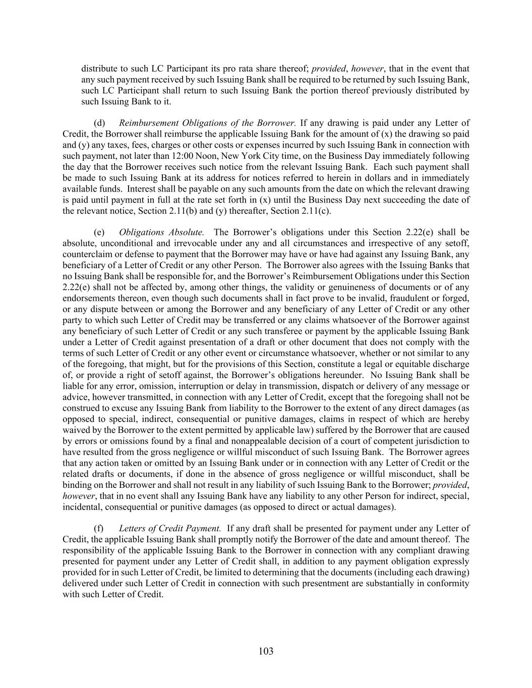 103 distribute to such LC Participant its pro rata share thereof; provided, however, that in the event that any such payment received by such Issuing Bank shall be required to be returned by such Issuing Bank, such LC Participant shall return to such Issuing Bank the portion thereof previously distributed by such Issuing Bank to it. (d) Reimbursement Obligations of the Borrower. If any drawing is paid under any Letter of Credit, the Borrower shall reimburse the applicable Issuing Bank for the amount of (x) the drawing so paid and (y) any taxes, fees, charges or other costs or expenses incurred by such Issuing Bank in connection with such payment, not later than 12:00 Noon, New York City time, on the Business Day immediately following the day that the Borrower receives such notice from the relevant Issuing Bank. Each such payment shall be made to such Issuing Bank at its address for notices referred to herein in dollars and in immediately available funds. Interest shall be payable on any such amounts from the date on which the relevant drawing is paid until payment in full at the rate set forth in (x) until the Business Day next succeeding the date of the relevant notice, Section 2.11(b) and (y) thereafter, Section 2.11(c). (e) Obligations Absolute. The Borrower’s obligations under this Section 2.22(e) shall be absolute, unconditional and irrevocable under any and all circumstances and irrespective of any setoff, counterclaim or defense to payment that the Borrower may have or have had against any Issuing Bank, any beneficiary of a Letter of Credit or any other Person. The Borrower also agrees with the Issuing Banks that no Issuing Bank shall be responsible for, and the Borrower’s Reimbursement Obligations under this Section 2.22(e) shall not be affected by, among other things, the validity or genuineness of documents or of any endorsements thereon, even though such documents shall in fact prove to be invalid, fraudulent or forged, or any dispute between or among the Borrower and any beneficiary of any Letter of Credit or any other party to which such Letter of Credit may be transferred or any claims whatsoever of the Borrower against any beneficiary of such Letter of Credit or any such transferee or payment by the applicable Issuing Bank under a Letter of Credit against presentation of a draft or other document that does not comply with the terms of such Letter of Credit or any other event or circumstance whatsoever, whether or not similar to any of the foregoing, that might, but for the provisions of this Section, constitute a legal or equitable discharge of, or provide a right of setoff against, the Borrower’s obligations hereunder. No Issuing Bank shall be liable for any error, omission, interruption or delay in transmission, dispatch or delivery of any message or advice, however transmitted, in connection with any Letter of Credit, except that the foregoing shall not be construed to excuse any Issuing Bank from liability to the Borrower to the extent of any direct damages (as opposed to special, indirect, consequential or punitive damages, claims in respect of which are hereby waived by the Borrower to the extent permitted by applicable law) suffered by the Borrower that are caused by errors or omissions found by a final and nonappealable decision of a court of competent jurisdiction to have resulted from the gross negligence or willful misconduct of such Issuing Bank. The Borrower agrees that any action taken or omitted by an Issuing Bank under or in connection with any Letter of Credit or the related drafts or documents, if done in the absence of gross negligence or willful misconduct, shall be binding on the Borrower and shall not result in any liability of such Issuing Bank to the Borrower; provided, however, that in no event shall any Issuing Bank have any liability to any other Person for indirect, special, incidental, consequential or punitive damages (as opposed to direct or actual damages). (f) Letters of Credit Payment. If any draft shall be presented for payment under any Letter of Credit, the applicable Issuing Bank shall promptly notify the Borrower of the date and amount thereof. The responsibility of the applicable Issuing Bank to the Borrower in connection with any compliant drawing presented for payment under any Letter of Credit shall, in addition to any payment obligation expressly provided for in such Letter of Credit, be limited to determining that the documents (including each drawing) delivered under such Letter of Credit in connection with such presentment are substantially in conformity with such Letter of Credit.