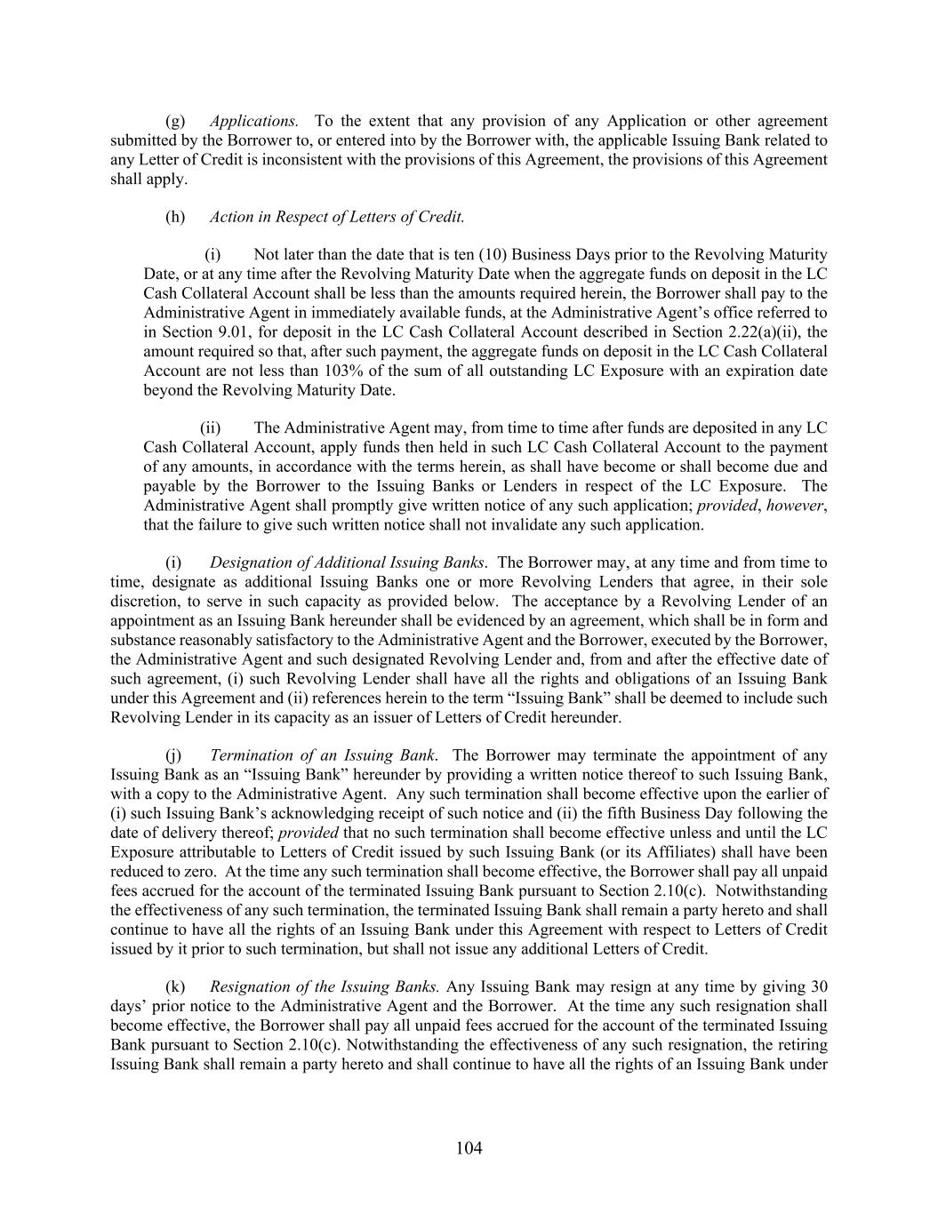 104 (g) Applications. To the extent that any provision of any Application or other agreement submitted by the Borrower to, or entered into by the Borrower with, the applicable Issuing Bank related to any Letter of Credit is inconsistent with the provisions of this Agreement, the provisions of this Agreement shall apply. (h) Action in Respect of Letters of Credit. (i) Not later than the date that is ten (10) Business Days prior to the Revolving Maturity Date, or at any time after the Revolving Maturity Date when the aggregate funds on deposit in the LC Cash Collateral Account shall be less than the amounts required herein, the Borrower shall pay to the Administrative Agent in immediately available funds, at the Administrative Agent’s office referred to in Section 9.01, for deposit in the LC Cash Collateral Account described in Section 2.22(a)(ii), the amount required so that, after such payment, the aggregate funds on deposit in the LC Cash Collateral Account are not less than 103% of the sum of all outstanding LC Exposure with an expiration date beyond the Revolving Maturity Date. (ii) The Administrative Agent may, from time to time after funds are deposited in any LC Cash Collateral Account, apply funds then held in such LC Cash Collateral Account to the payment of any amounts, in accordance with the terms herein, as shall have become or shall become due and payable by the Borrower to the Issuing Banks or Lenders in respect of the LC Exposure. The Administrative Agent shall promptly give written notice of any such application; provided, however, that the failure to give such written notice shall not invalidate any such application. (i) Designation of Additional Issuing Banks. The Borrower may, at any time and from time to time, designate as additional Issuing Banks one or more Revolving Lenders that agree, in their sole discretion, to serve in such capacity as provided below. The acceptance by a Revolving Lender of an appointment as an Issuing Bank hereunder shall be evidenced by an agreement, which shall be in form and substance reasonably satisfactory to the Administrative Agent and the Borrower, executed by the Borrower, the Administrative Agent and such designated Revolving Lender and, from and after the effective date of such agreement, (i) such Revolving Lender shall have all the rights and obligations of an Issuing Bank under this Agreement and (ii) references herein to the term “Issuing Bank” shall be deemed to include such Revolving Lender in its capacity as an issuer of Letters of Credit hereunder. (j) Termination of an Issuing Bank. The Borrower may terminate the appointment of any Issuing Bank as an “Issuing Bank” hereunder by providing a written notice thereof to such Issuing Bank, with a copy to the Administrative Agent. Any such termination shall become effective upon the earlier of (i) such Issuing Bank’s acknowledging receipt of such notice and (ii) the fifth Business Day following the date of delivery thereof; provided that no such termination shall become effective unless and until the LC Exposure attributable to Letters of Credit issued by such Issuing Bank (or its Affiliates) shall have been reduced to zero. At the time any such termination shall become effective, the Borrower shall pay all unpaid fees accrued for the account of the terminated Issuing Bank pursuant to Section 2.10(c). Notwithstanding the effectiveness of any such termination, the terminated Issuing Bank shall remain a party hereto and shall continue to have all the rights of an Issuing Bank under this Agreement with respect to Letters of Credit issued by it prior to such termination, but shall not issue any additional Letters of Credit. (k) Resignation of the Issuing Banks. Any Issuing Bank may resign at any time by giving 30 days’ prior notice to the Administrative Agent and the Borrower. At the time any such resignation shall become effective, the Borrower shall pay all unpaid fees accrued for the account of the terminated Issuing Bank pursuant to Section 2.10(c). Notwithstanding the effectiveness of any such resignation, the retiring Issuing Bank shall remain a party hereto and shall continue to have all the rights of an Issuing Bank under