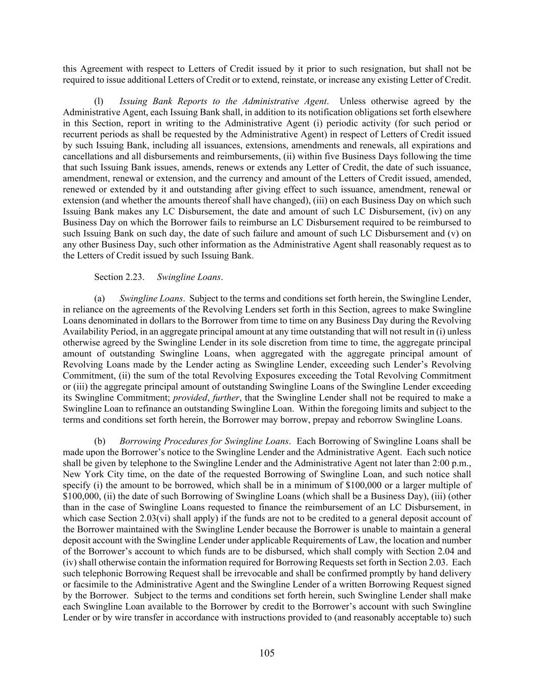 105 this Agreement with respect to Letters of Credit issued by it prior to such resignation, but shall not be required to issue additional Letters of Credit or to extend, reinstate, or increase any existing Letter of Credit. (l) Issuing Bank Reports to the Administrative Agent. Unless otherwise agreed by the Administrative Agent, each Issuing Bank shall, in addition to its notification obligations set forth elsewhere in this Section, report in writing to the Administrative Agent (i) periodic activity (for such period or recurrent periods as shall be requested by the Administrative Agent) in respect of Letters of Credit issued by such Issuing Bank, including all issuances, extensions, amendments and renewals, all expirations and cancellations and all disbursements and reimbursements, (ii) within five Business Days following the time that such Issuing Bank issues, amends, renews or extends any Letter of Credit, the date of such issuance, amendment, renewal or extension, and the currency and amount of the Letters of Credit issued, amended, renewed or extended by it and outstanding after giving effect to such issuance, amendment, renewal or extension (and whether the amounts thereof shall have changed), (iii) on each Business Day on which such Issuing Bank makes any LC Disbursement, the date and amount of such LC Disbursement, (iv) on any Business Day on which the Borrower fails to reimburse an LC Disbursement required to be reimbursed to such Issuing Bank on such day, the date of such failure and amount of such LC Disbursement and (v) on any other Business Day, such other information as the Administrative Agent shall reasonably request as to the Letters of Credit issued by such Issuing Bank. Section 2.23. Swingline Loans. (a) Swingline Loans. Subject to the terms and conditions set forth herein, the Swingline Lender, in reliance on the agreements of the Revolving Lenders set forth in this Section, agrees to make Swingline Loans denominated in dollars to the Borrower from time to time on any Business Day during the Revolving Availability Period, in an aggregate principal amount at any time outstanding that will not result in (i) unless otherwise agreed by the Swingline Lender in its sole discretion from time to time, the aggregate principal amount of outstanding Swingline Loans, when aggregated with the aggregate principal amount of Revolving Loans made by the Lender acting as Swingline Lender, exceeding such Lender’s Revolving Commitment, (ii) the sum of the total Revolving Exposures exceeding the Total Revolving Commitment or (iii) the aggregate principal amount of outstanding Swingline Loans of the Swingline Lender exceeding its Swingline Commitment; provided, further, that the Swingline Lender shall not be required to make a Swingline Loan to refinance an outstanding Swingline Loan. Within the foregoing limits and subject to the terms and conditions set forth herein, the Borrower may borrow, prepay and reborrow Swingline Loans. (b) Borrowing Procedures for Swingline Loans. Each Borrowing of Swingline Loans shall be made upon the Borrower’s notice to the Swingline Lender and the Administrative Agent. Each such notice shall be given by telephone to the Swingline Lender and the Administrative Agent not later than 2:00 p.m., New York City time, on the date of the requested Borrowing of Swingline Loan, and such notice shall specify (i) the amount to be borrowed, which shall be in a minimum of $100,000 or a larger multiple of $100,000, (ii) the date of such Borrowing of Swingline Loans (which shall be a Business Day), (iii) (other than in the case of Swingline Loans requested to finance the reimbursement of an LC Disbursement, in which case Section 2.03(vi) shall apply) if the funds are not to be credited to a general deposit account of the Borrower maintained with the Swingline Lender because the Borrower is unable to maintain a general deposit account with the Swingline Lender under applicable Requirements of Law, the location and number of the Borrower’s account to which funds are to be disbursed, which shall comply with Section 2.04 and (iv) shall otherwise contain the information required for Borrowing Requests set forth in Section 2.03. Each such telephonic Borrowing Request shall be irrevocable and shall be confirmed promptly by hand delivery or facsimile to the Administrative Agent and the Swingline Lender of a written Borrowing Request signed by the Borrower. Subject to the terms and conditions set forth herein, such Swingline Lender shall make each Swingline Loan available to the Borrower by credit to the Borrower’s account with such Swingline Lender or by wire transfer in accordance with instructions provided to (and reasonably acceptable to) such