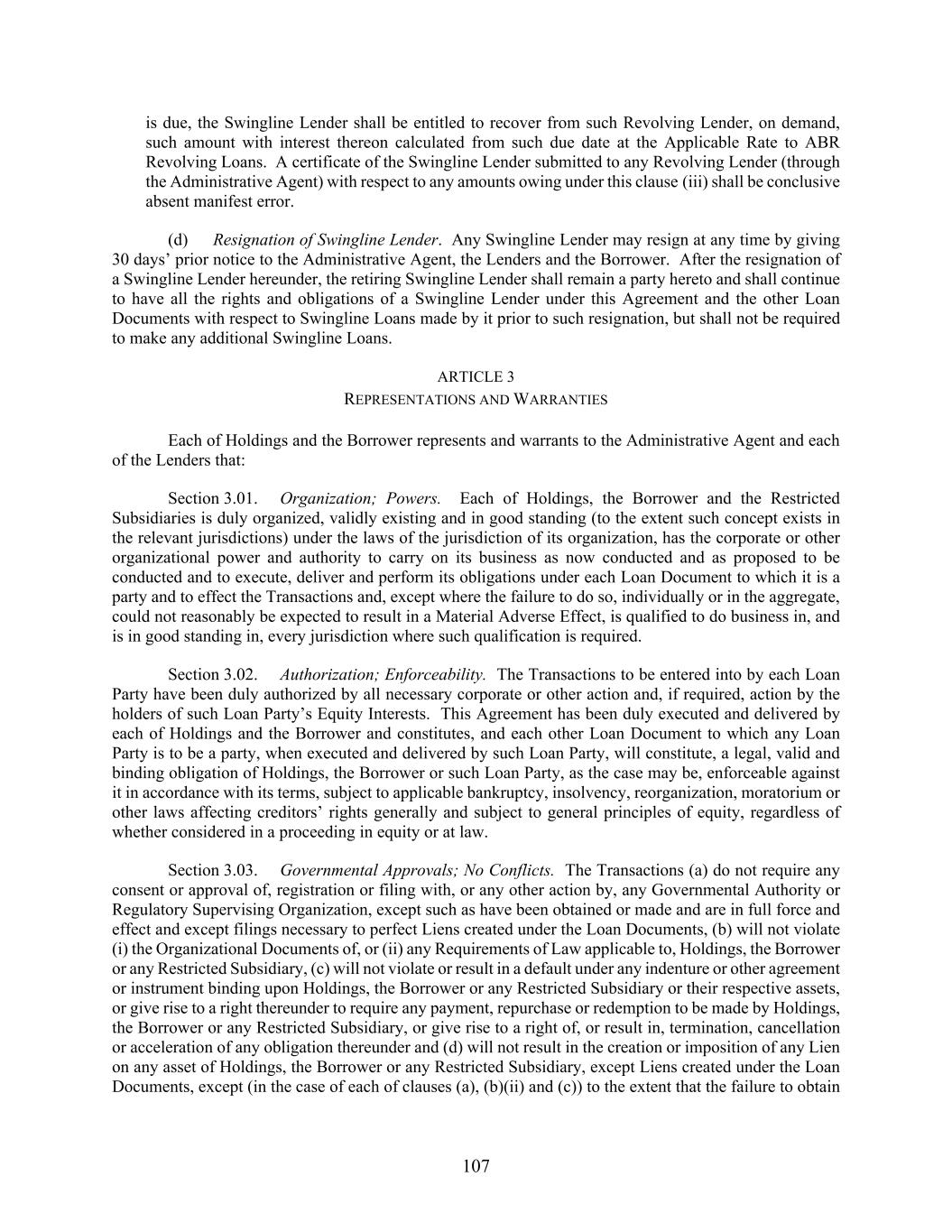107 is due, the Swingline Lender shall be entitled to recover from such Revolving Lender, on demand, such amount with interest thereon calculated from such due date at the Applicable Rate to ABR Revolving Loans. A certificate of the Swingline Lender submitted to any Revolving Lender (through the Administrative Agent) with respect to any amounts owing under this clause (iii) shall be conclusive absent manifest error. (d) Resignation of Swingline Lender. Any Swingline Lender may resign at any time by giving 30 days’ prior notice to the Administrative Agent, the Lenders and the Borrower. After the resignation of a Swingline Lender hereunder, the retiring Swingline Lender shall remain a party hereto and shall continue to have all the rights and obligations of a Swingline Lender under this Agreement and the other Loan Documents with respect to Swingline Loans made by it prior to such resignation, but shall not be required to make any additional Swingline Loans. ARTICLE 3 REPRESENTATIONS AND WARRANTIES Each of Holdings and the Borrower represents and warrants to the Administrative Agent and each of the Lenders that: Section 3.01. Organization; Powers. Each of Holdings, the Borrower and the Restricted Subsidiaries is duly organized, validly existing and in good standing (to the extent such concept exists in the relevant jurisdictions) under the laws of the jurisdiction of its organization, has the corporate or other organizational power and authority to carry on its business as now conducted and as proposed to be conducted and to execute, deliver and perform its obligations under each Loan Document to which it is a party and to effect the Transactions and, except where the failure to do so, individually or in the aggregate, could not reasonably be expected to result in a Material Adverse Effect, is qualified to do business in, and is in good standing in, every jurisdiction where such qualification is required. Section 3.02. Authorization; Enforceability. The Transactions to be entered into by each Loan Party have been duly authorized by all necessary corporate or other action and, if required, action by the holders of such Loan Party’s Equity Interests. This Agreement has been duly executed and delivered by each of Holdings and the Borrower and constitutes, and each other Loan Document to which any Loan Party is to be a party, when executed and delivered by such Loan Party, will constitute, a legal, valid and binding obligation of Holdings, the Borrower or such Loan Party, as the case may be, enforceable against it in accordance with its terms, subject to applicable bankruptcy, insolvency, reorganization, moratorium or other laws affecting creditors’ rights generally and subject to general principles of equity, regardless of whether considered in a proceeding in equity or at law. Section 3.03. Governmental Approvals; No Conflicts. The Transactions (a) do not require any consent or approval of, registration or filing with, or any other action by, any Governmental Authority or Regulatory Supervising Organization, except such as have been obtained or made and are in full force and effect and except filings necessary to perfect Liens created under the Loan Documents, (b) will not violate (i) the Organizational Documents of, or (ii) any Requirements of Law applicable to, Holdings, the Borrower or any Restricted Subsidiary, (c) will not violate or result in a default under any indenture or other agreement or instrument binding upon Holdings, the Borrower or any Restricted Subsidiary or their respective assets, or give rise to a right thereunder to require any payment, repurchase or redemption to be made by Holdings, the Borrower or any Restricted Subsidiary, or give rise to a right of, or result in, termination, cancellation or acceleration of any obligation thereunder and (d) will not result in the creation or imposition of any Lien on any asset of Holdings, the Borrower or any Restricted Subsidiary, except Liens created under the Loan Documents, except (in the case of each of clauses (a), (b)(ii) and (c)) to the extent that the failure to obtain