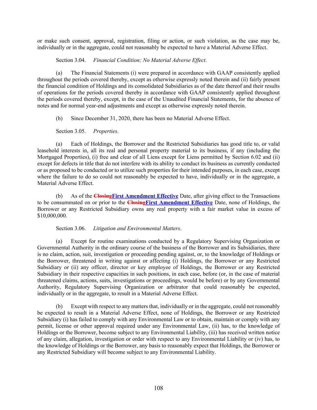 108 or make such consent, approval, registration, filing or action, or such violation, as the case may be, individually or in the aggregate, could not reasonably be expected to have a Material Adverse Effect. Section 3.04. Financial Condition; No Material Adverse Effect. (a) The Financial Statements (i) were prepared in accordance with GAAP consistently applied throughout the periods covered thereby, except as otherwise expressly noted therein and (ii) fairly present the financial condition of Holdings and its consolidated Subsidiaries as of the date thereof and their results of operations for the periods covered thereby in accordance with GAAP consistently applied throughout the periods covered thereby, except, in the case of the Unaudited Financial Statements, for the absence of notes and for normal year-end adjustments and except as otherwise expressly noted therein. (b) Since December 31, 2020, there has been no Material Adverse Effect. Section 3.05. Properties. (a) Each of Holdings, the Borrower and the Restricted Subsidiaries has good title to, or valid leasehold interests in, all its real and personal property material to its business, if any (including the Mortgaged Properties), (i) free and clear of all Liens except for Liens permitted by Section 6.02 and (ii) except for defects in title that do not interfere with its ability to conduct its business as currently conducted or as proposed to be conducted or to utilize such properties for their intended purposes, in each case, except where the failure to do so could not reasonably be expected to have, individually or in the aggregate, a Material Adverse Effect. (b) As of the ClosingFirst Amendment Effective Date, after giving effect to the Transactions to be consummated on or prior to the ClosingFirst Amendment Effective Date, none of Holdings, the Borrower or any Restricted Subsidiary owns any real property with a fair market value in excess of $10,000,000. Section 3.06. Litigation and Environmental Matters. (a) Except for routine examinations conducted by a Regulatory Supervising Organization or Governmental Authority in the ordinary course of the business of the Borrower and its Subsidiaries, there is no claim, action, suit, investigation or proceeding pending against, or, to the knowledge of Holdings or the Borrower, threatened in writing against or affecting (i) Holdings, the Borrower or any Restricted Subsidiary or (ii) any officer, director or key employee of Holdings, the Borrower or any Restricted Subsidiary in their respective capacities in such positions, in each case, before (or, in the case of material threatened claims, actions, suits, investigations or proceedings, would be before) or by any Governmental Authority, Regulatory Supervising Organization or arbitrator that could reasonably be expected, individually or in the aggregate, to result in a Material Adverse Effect. (b) Except with respect to any matters that, individually or in the aggregate, could not reasonably be expected to result in a Material Adverse Effect, none of Holdings, the Borrower or any Restricted Subsidiary (i) has failed to comply with any Environmental Law or to obtain, maintain or comply with any permit, license or other approval required under any Environmental Law, (ii) has, to the knowledge of Holdings or the Borrower, become subject to any Environmental Liability, (iii) has received written notice of any claim, allegation, investigation or order with respect to any Environmental Liability or (iv) has, to the knowledge of Holdings or the Borrower, any basis to reasonably expect that Holdings, the Borrower or any Restricted Subsidiary will become subject to any Environmental Liability.