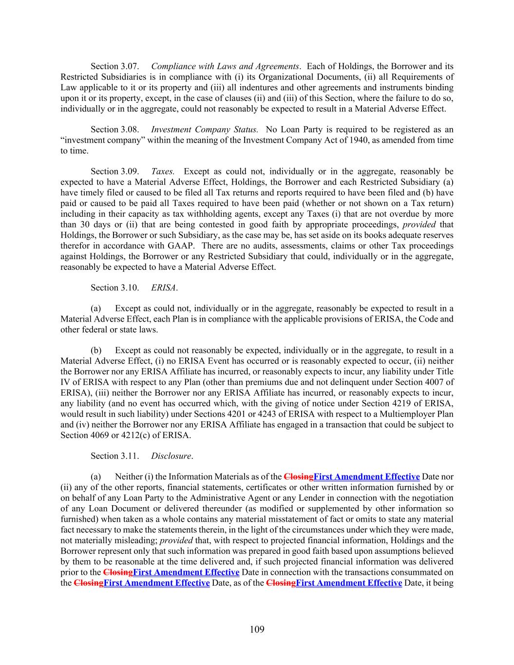109 Section 3.07. Compliance with Laws and Agreements. Each of Holdings, the Borrower and its Restricted Subsidiaries is in compliance with (i) its Organizational Documents, (ii) all Requirements of Law applicable to it or its property and (iii) all indentures and other agreements and instruments binding upon it or its property, except, in the case of clauses (ii) and (iii) of this Section, where the failure to do so, individually or in the aggregate, could not reasonably be expected to result in a Material Adverse Effect. Section 3.08. Investment Company Status. No Loan Party is required to be registered as an “investment company” within the meaning of the Investment Company Act of 1940, as amended from time to time. Section 3.09. Taxes. Except as could not, individually or in the aggregate, reasonably be expected to have a Material Adverse Effect, Holdings, the Borrower and each Restricted Subsidiary (a) have timely filed or caused to be filed all Tax returns and reports required to have been filed and (b) have paid or caused to be paid all Taxes required to have been paid (whether or not shown on a Tax return) including in their capacity as tax withholding agents, except any Taxes (i) that are not overdue by more than 30 days or (ii) that are being contested in good faith by appropriate proceedings, provided that Holdings, the Borrower or such Subsidiary, as the case may be, has set aside on its books adequate reserves therefor in accordance with GAAP. There are no audits, assessments, claims or other Tax proceedings against Holdings, the Borrower or any Restricted Subsidiary that could, individually or in the aggregate, reasonably be expected to have a Material Adverse Effect. Section 3.10. ERISA. (a) Except as could not, individually or in the aggregate, reasonably be expected to result in a Material Adverse Effect, each Plan is in compliance with the applicable provisions of ERISA, the Code and other federal or state laws. (b) Except as could not reasonably be expected, individually or in the aggregate, to result in a Material Adverse Effect, (i) no ERISA Event has occurred or is reasonably expected to occur, (ii) neither the Borrower nor any ERISA Affiliate has incurred, or reasonably expects to incur, any liability under Title IV of ERISA with respect to any Plan (other than premiums due and not delinquent under Section 4007 of ERISA), (iii) neither the Borrower nor any ERISA Affiliate has incurred, or reasonably expects to incur, any liability (and no event has occurred which, with the giving of notice under Section 4219 of ERISA, would result in such liability) under Sections 4201 or 4243 of ERISA with respect to a Multiemployer Plan and (iv) neither the Borrower nor any ERISA Affiliate has engaged in a transaction that could be subject to Section 4069 or 4212(c) of ERISA. Section 3.11. Disclosure. (a) Neither (i) the Information Materials as of the ClosingFirst Amendment Effective Date nor (ii) any of the other reports, financial statements, certificates or other written information furnished by or on behalf of any Loan Party to the Administrative Agent or any Lender in connection with the negotiation of any Loan Document or delivered thereunder (as modified or supplemented by other information so furnished) when taken as a whole contains any material misstatement of fact or omits to state any material fact necessary to make the statements therein, in the light of the circumstances under which they were made, not materially misleading; provided that, with respect to projected financial information, Holdings and the Borrower represent only that such information was prepared in good faith based upon assumptions believed by them to be reasonable at the time delivered and, if such projected financial information was delivered prior to the ClosingFirst Amendment Effective Date in connection with the transactions consummated on the ClosingFirst Amendment Effective Date, as of the ClosingFirst Amendment Effective Date, it being