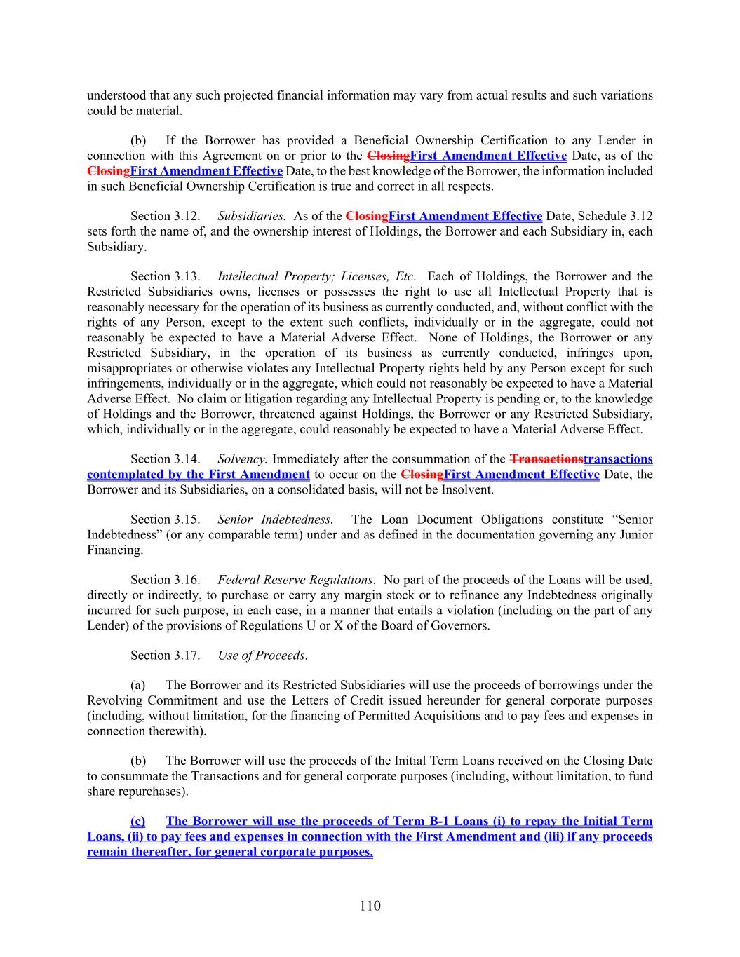 110 understood that any such projected financial information may vary from actual results and such variations could be material. (b) If the Borrower has provided a Beneficial Ownership Certification to any Lender in connection with this Agreement on or prior to the ClosingFirst Amendment Effective Date, as of the ClosingFirst Amendment Effective Date, to the best knowledge of the Borrower, the information included in such Beneficial Ownership Certification is true and correct in all respects. Section 3.12. Subsidiaries. As of the ClosingFirst Amendment Effective Date, Schedule 3.12 sets forth the name of, and the ownership interest of Holdings, the Borrower and each Subsidiary in, each Subsidiary. Section 3.13. Intellectual Property; Licenses, Etc. Each of Holdings, the Borrower and the Restricted Subsidiaries owns, licenses or possesses the right to use all Intellectual Property that is reasonably necessary for the operation of its business as currently conducted, and, without conflict with the rights of any Person, except to the extent such conflicts, individually or in the aggregate, could not reasonably be expected to have a Material Adverse Effect. None of Holdings, the Borrower or any Restricted Subsidiary, in the operation of its business as currently conducted, infringes upon, misappropriates or otherwise violates any Intellectual Property rights held by any Person except for such infringements, individually or in the aggregate, which could not reasonably be expected to have a Material Adverse Effect. No claim or litigation regarding any Intellectual Property is pending or, to the knowledge of Holdings and the Borrower, threatened against Holdings, the Borrower or any Restricted Subsidiary, which, individually or in the aggregate, could reasonably be expected to have a Material Adverse Effect. Section 3.14. Solvency. Immediately after the consummation of the Transactionstransactions contemplated by the First Amendment to occur on the ClosingFirst Amendment Effective Date, the Borrower and its Subsidiaries, on a consolidated basis, will not be Insolvent. Section 3.15. Senior Indebtedness. The Loan Document Obligations constitute “Senior Indebtedness” (or any comparable term) under and as defined in the documentation governing any Junior Financing. Section 3.16. Federal Reserve Regulations. No part of the proceeds of the Loans will be used, directly or indirectly, to purchase or carry any margin stock or to refinance any Indebtedness originally incurred for such purpose, in each case, in a manner that entails a violation (including on the part of any Lender) of the provisions of Regulations U or X of the Board of Governors. Section 3.17. Use of Proceeds. (a) The Borrower and its Restricted Subsidiaries will use the proceeds of borrowings under the Revolving Commitment and use the Letters of Credit issued hereunder for general corporate purposes (including, without limitation, for the financing of Permitted Acquisitions and to pay fees and expenses in connection therewith). (b) The Borrower will use the proceeds of the Initial Term Loans received on the Closing Date to consummate the Transactions and for general corporate purposes (including, without limitation, to fund share repurchases). (c) The Borrower will use the proceeds of Term B-1 Loans (i) to repay the Initial Term Loans, (ii) to pay fees and expenses in connection with the First Amendment and (iii) if any proceeds remain thereafter, for general corporate purposes.