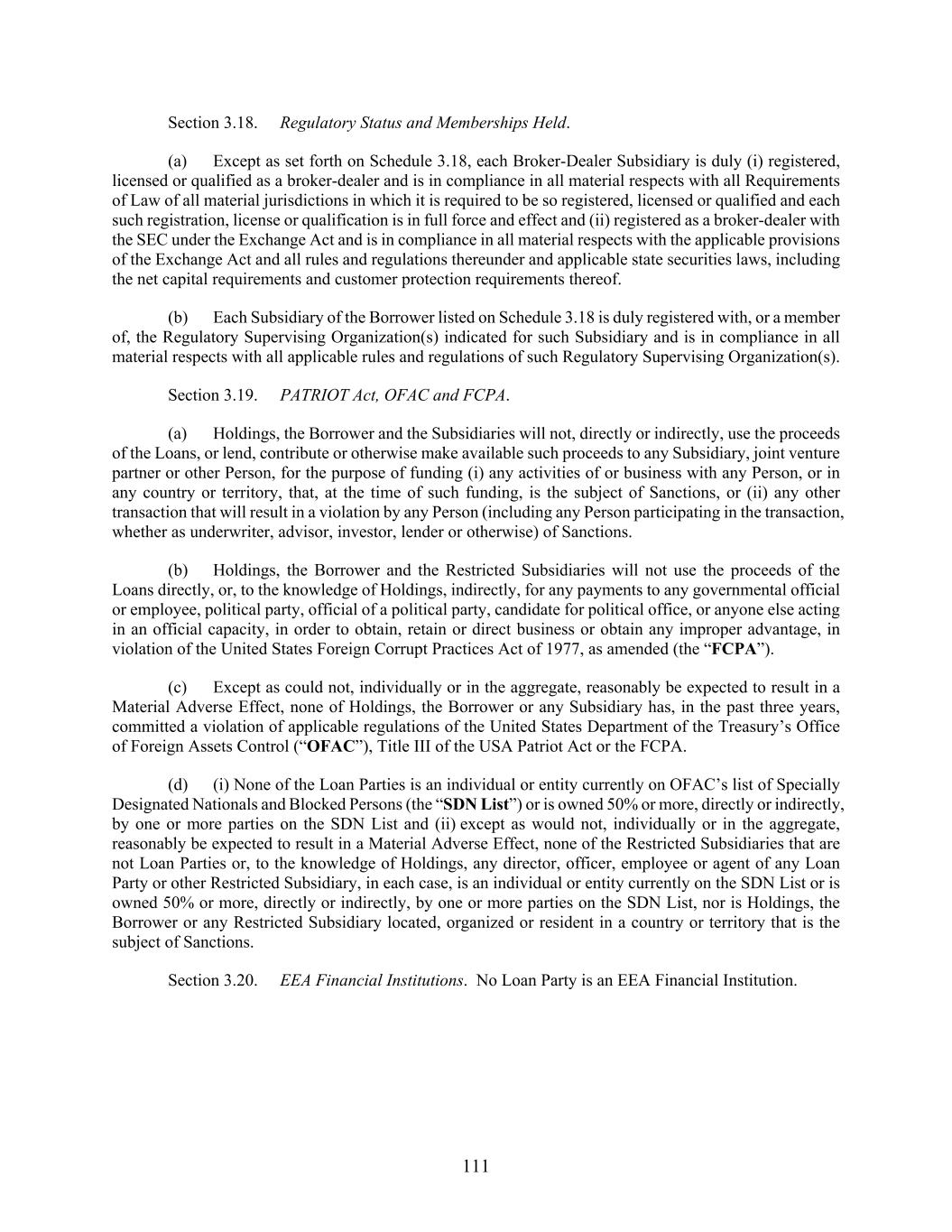 111 Section 3.18. Regulatory Status and Memberships Held. (a) Except as set forth on Schedule 3.18, each Broker-Dealer Subsidiary is duly (i) registered, licensed or qualified as a broker-dealer and is in compliance in all material respects with all Requirements of Law of all material jurisdictions in which it is required to be so registered, licensed or qualified and each such registration, license or qualification is in full force and effect and (ii) registered as a broker-dealer with the SEC under the Exchange Act and is in compliance in all material respects with the applicable provisions of the Exchange Act and all rules and regulations thereunder and applicable state securities laws, including the net capital requirements and customer protection requirements thereof. (b) Each Subsidiary of the Borrower listed on Schedule 3.18 is duly registered with, or a member of, the Regulatory Supervising Organization(s) indicated for such Subsidiary and is in compliance in all material respects with all applicable rules and regulations of such Regulatory Supervising Organization(s). Section 3.19. PATRIOT Act, OFAC and FCPA. (a) Holdings, the Borrower and the Subsidiaries will not, directly or indirectly, use the proceeds of the Loans, or lend, contribute or otherwise make available such proceeds to any Subsidiary, joint venture partner or other Person, for the purpose of funding (i) any activities of or business with any Person, or in any country or territory, that, at the time of such funding, is the subject of Sanctions, or (ii) any other transaction that will result in a violation by any Person (including any Person participating in the transaction, whether as underwriter, advisor, investor, lender or otherwise) of Sanctions. (b) Holdings, the Borrower and the Restricted Subsidiaries will not use the proceeds of the Loans directly, or, to the knowledge of Holdings, indirectly, for any payments to any governmental official or employee, political party, official of a political party, candidate for political office, or anyone else acting in an official capacity, in order to obtain, retain or direct business or obtain any improper advantage, in violation of the United States Foreign Corrupt Practices Act of 1977, as amended (the “FCPA”). (c) Except as could not, individually or in the aggregate, reasonably be expected to result in a Material Adverse Effect, none of Holdings, the Borrower or any Subsidiary has, in the past three years, committed a violation of applicable regulations of the United States Department of the Treasury’s Office of Foreign Assets Control (“OFAC”), Title III of the USA Patriot Act or the FCPA. (d) (i) None of the Loan Parties is an individual or entity currently on OFAC’s list of Specially Designated Nationals and Blocked Persons (the “SDN List”) or is owned 50% or more, directly or indirectly, by one or more parties on the SDN List and (ii) except as would not, individually or in the aggregate, reasonably be expected to result in a Material Adverse Effect, none of the Restricted Subsidiaries that are not Loan Parties or, to the knowledge of Holdings, any director, officer, employee or agent of any Loan Party or other Restricted Subsidiary, in each case, is an individual or entity currently on the SDN List or is owned 50% or more, directly or indirectly, by one or more parties on the SDN List, nor is Holdings, the Borrower or any Restricted Subsidiary located, organized or resident in a country or territory that is the subject of Sanctions. Section 3.20. EEA Financial Institutions. No Loan Party is an EEA Financial Institution.