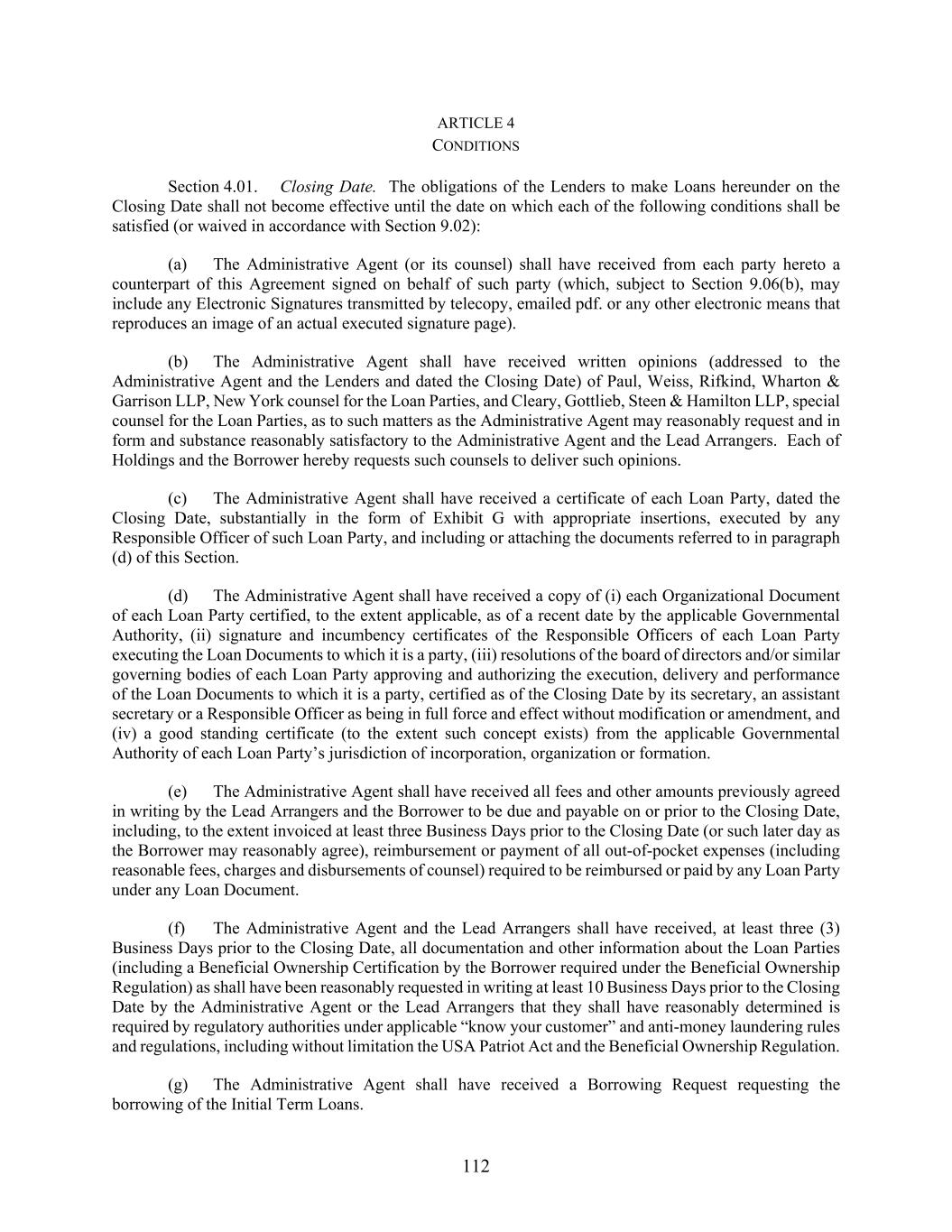 112 ARTICLE 4 CONDITIONS Section 4.01. Closing Date. The obligations of the Lenders to make Loans hereunder on the Closing Date shall not become effective until the date on which each of the following conditions shall be satisfied (or waived in accordance with Section 9.02): (a) The Administrative Agent (or its counsel) shall have received from each party hereto a counterpart of this Agreement signed on behalf of such party (which, subject to Section 9.06(b), may include any Electronic Signatures transmitted by telecopy, emailed pdf. or any other electronic means that reproduces an image of an actual executed signature page). (b) The Administrative Agent shall have received written opinions (addressed to the Administrative Agent and the Lenders and dated the Closing Date) of Paul, Weiss, Rifkind, Wharton & Garrison LLP, New York counsel for the Loan Parties, and Cleary, Gottlieb, Steen & Hamilton LLP, special counsel for the Loan Parties, as to such matters as the Administrative Agent may reasonably request and in form and substance reasonably satisfactory to the Administrative Agent and the Lead Arrangers. Each of Holdings and the Borrower hereby requests such counsels to deliver such opinions. (c) The Administrative Agent shall have received a certificate of each Loan Party, dated the Closing Date, substantially in the form of Exhibit G with appropriate insertions, executed by any Responsible Officer of such Loan Party, and including or attaching the documents referred to in paragraph (d) of this Section. (d) The Administrative Agent shall have received a copy of (i) each Organizational Document of each Loan Party certified, to the extent applicable, as of a recent date by the applicable Governmental Authority, (ii) signature and incumbency certificates of the Responsible Officers of each Loan Party executing the Loan Documents to which it is a party, (iii) resolutions of the board of directors and/or similar governing bodies of each Loan Party approving and authorizing the execution, delivery and performance of the Loan Documents to which it is a party, certified as of the Closing Date by its secretary, an assistant secretary or a Responsible Officer as being in full force and effect without modification or amendment, and (iv) a good standing certificate (to the extent such concept exists) from the applicable Governmental Authority of each Loan Party’s jurisdiction of incorporation, organization or formation. (e) The Administrative Agent shall have received all fees and other amounts previously agreed in writing by the Lead Arrangers and the Borrower to be due and payable on or prior to the Closing Date, including, to the extent invoiced at least three Business Days prior to the Closing Date (or such later day as the Borrower may reasonably agree), reimbursement or payment of all out-of-pocket expenses (including reasonable fees, charges and disbursements of counsel) required to be reimbursed or paid by any Loan Party under any Loan Document. (f) The Administrative Agent and the Lead Arrangers shall have received, at least three (3) Business Days prior to the Closing Date, all documentation and other information about the Loan Parties (including a Beneficial Ownership Certification by the Borrower required under the Beneficial Ownership Regulation) as shall have been reasonably requested in writing at least 10 Business Days prior to the Closing Date by the Administrative Agent or the Lead Arrangers that they shall have reasonably determined is required by regulatory authorities under applicable “know your customer” and anti-money laundering rules and regulations, including without limitation the USA Patriot Act and the Beneficial Ownership Regulation. (g) The Administrative Agent shall have received a Borrowing Request requesting the borrowing of the Initial Term Loans.