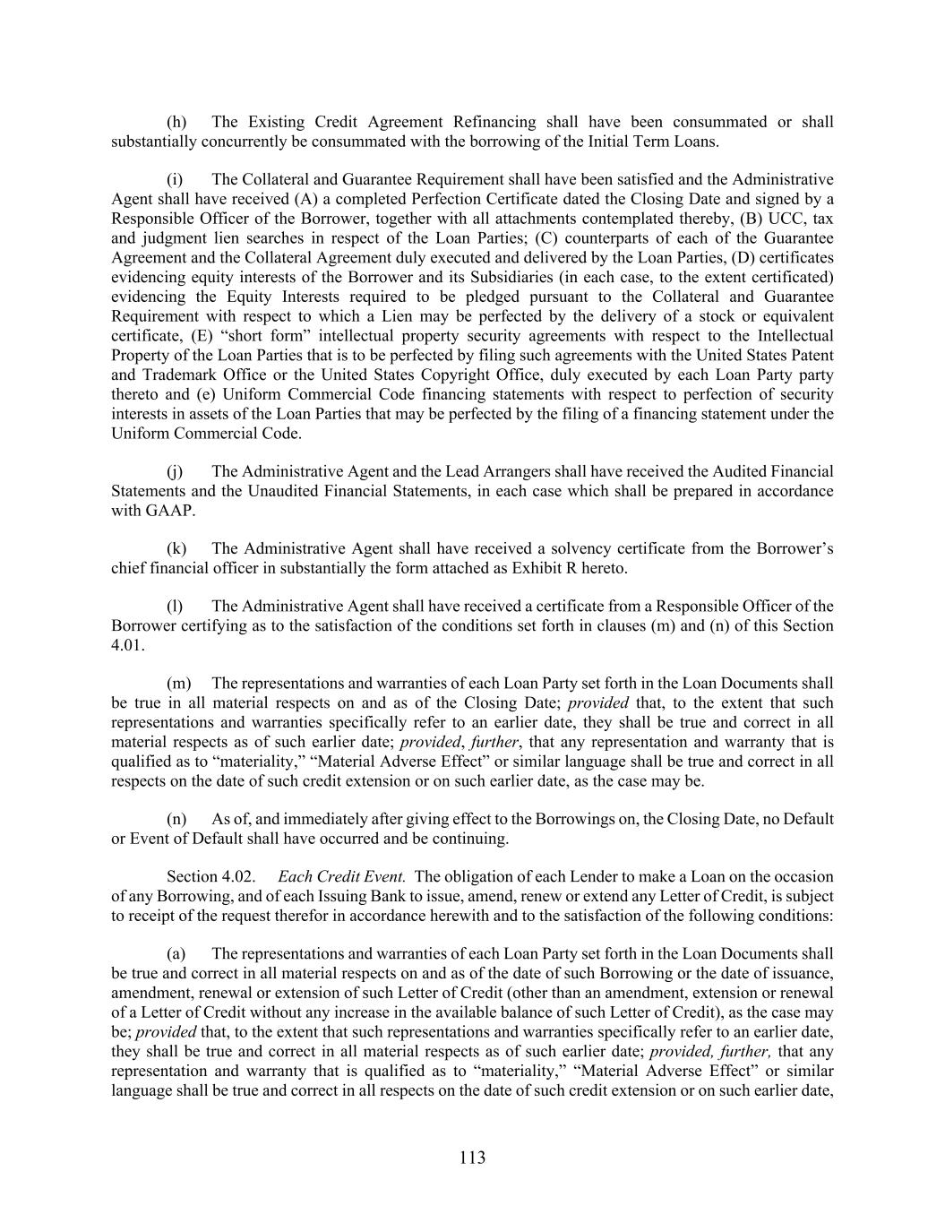 113 (h) The Existing Credit Agreement Refinancing shall have been consummated or shall substantially concurrently be consummated with the borrowing of the Initial Term Loans. (i) The Collateral and Guarantee Requirement shall have been satisfied and the Administrative Agent shall have received (A) a completed Perfection Certificate dated the Closing Date and signed by a Responsible Officer of the Borrower, together with all attachments contemplated thereby, (B) UCC, tax and judgment lien searches in respect of the Loan Parties; (C) counterparts of each of the Guarantee Agreement and the Collateral Agreement duly executed and delivered by the Loan Parties, (D) certificates evidencing equity interests of the Borrower and its Subsidiaries (in each case, to the extent certificated) evidencing the Equity Interests required to be pledged pursuant to the Collateral and Guarantee Requirement with respect to which a Lien may be perfected by the delivery of a stock or equivalent certificate, (E) “short form” intellectual property security agreements with respect to the Intellectual Property of the Loan Parties that is to be perfected by filing such agreements with the United States Patent and Trademark Office or the United States Copyright Office, duly executed by each Loan Party party thereto and (e) Uniform Commercial Code financing statements with respect to perfection of security interests in assets of the Loan Parties that may be perfected by the filing of a financing statement under the Uniform Commercial Code. (j) The Administrative Agent and the Lead Arrangers shall have received the Audited Financial Statements and the Unaudited Financial Statements, in each case which shall be prepared in accordance with GAAP. (k) The Administrative Agent shall have received a solvency certificate from the Borrower’s chief financial officer in substantially the form attached as Exhibit R hereto. (l) The Administrative Agent shall have received a certificate from a Responsible Officer of the Borrower certifying as to the satisfaction of the conditions set forth in clauses (m) and (n) of this Section 4.01. (m) The representations and warranties of each Loan Party set forth in the Loan Documents shall be true in all material respects on and as of the Closing Date; provided that, to the extent that such representations and warranties specifically refer to an earlier date, they shall be true and correct in all material respects as of such earlier date; provided, further, that any representation and warranty that is qualified as to “materiality,” “Material Adverse Effect” or similar language shall be true and correct in all respects on the date of such credit extension or on such earlier date, as the case may be. (n) As of, and immediately after giving effect to the Borrowings on, the Closing Date, no Default or Event of Default shall have occurred and be continuing. Section 4.02. Each Credit Event. The obligation of each Lender to make a Loan on the occasion of any Borrowing, and of each Issuing Bank to issue, amend, renew or extend any Letter of Credit, is subject to receipt of the request therefor in accordance herewith and to the satisfaction of the following conditions: (a) The representations and warranties of each Loan Party set forth in the Loan Documents shall be true and correct in all material respects on and as of the date of such Borrowing or the date of issuance, amendment, renewal or extension of such Letter of Credit (other than an amendment, extension or renewal of a Letter of Credit without any increase in the available balance of such Letter of Credit), as the case may be; provided that, to the extent that such representations and warranties specifically refer to an earlier date, they shall be true and correct in all material respects as of such earlier date; provided, further, that any representation and warranty that is qualified as to “materiality,” “Material Adverse Effect” or similar language shall be true and correct in all respects on the date of such credit extension or on such earlier date,