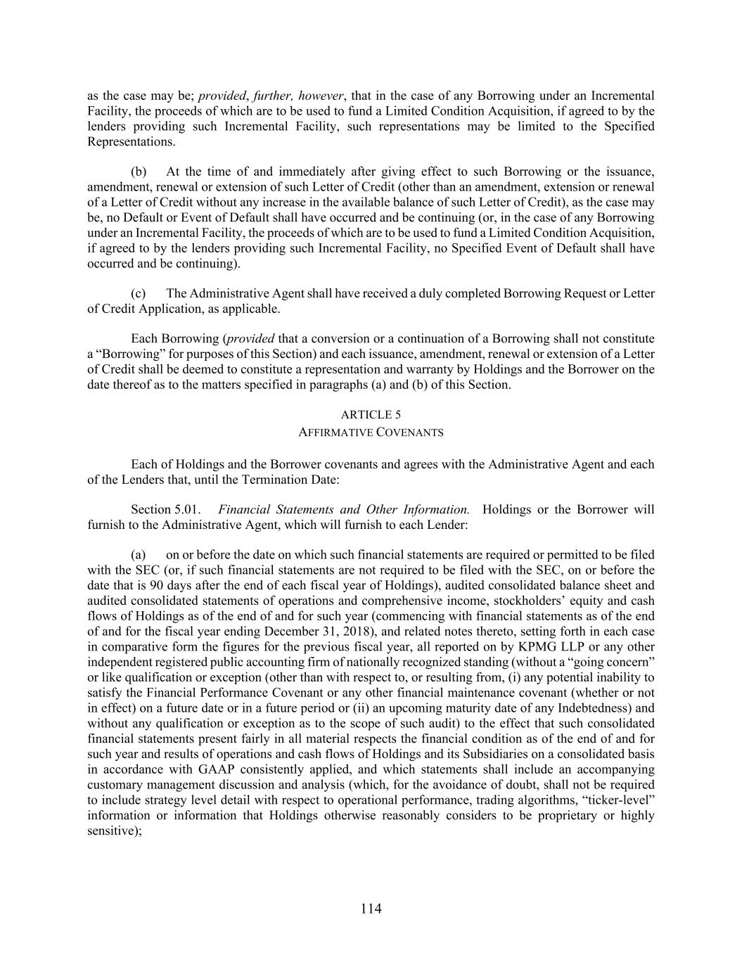 114 as the case may be; provided, further, however, that in the case of any Borrowing under an Incremental Facility, the proceeds of which are to be used to fund a Limited Condition Acquisition, if agreed to by the lenders providing such Incremental Facility, such representations may be limited to the Specified Representations. (b) At the time of and immediately after giving effect to such Borrowing or the issuance, amendment, renewal or extension of such Letter of Credit (other than an amendment, extension or renewal of a Letter of Credit without any increase in the available balance of such Letter of Credit), as the case may be, no Default or Event of Default shall have occurred and be continuing (or, in the case of any Borrowing under an Incremental Facility, the proceeds of which are to be used to fund a Limited Condition Acquisition, if agreed to by the lenders providing such Incremental Facility, no Specified Event of Default shall have occurred and be continuing). (c) The Administrative Agent shall have received a duly completed Borrowing Request or Letter of Credit Application, as applicable. Each Borrowing (provided that a conversion or a continuation of a Borrowing shall not constitute a “Borrowing” for purposes of this Section) and each issuance, amendment, renewal or extension of a Letter of Credit shall be deemed to constitute a representation and warranty by Holdings and the Borrower on the date thereof as to the matters specified in paragraphs (a) and (b) of this Section. ARTICLE 5 AFFIRMATIVE COVENANTS Each of Holdings and the Borrower covenants and agrees with the Administrative Agent and each of the Lenders that, until the Termination Date: Section 5.01. Financial Statements and Other Information. Holdings or the Borrower will furnish to the Administrative Agent, which will furnish to each Lender: (a) on or before the date on which such financial statements are required or permitted to be filed with the SEC (or, if such financial statements are not required to be filed with the SEC, on or before the date that is 90 days after the end of each fiscal year of Holdings), audited consolidated balance sheet and audited consolidated statements of operations and comprehensive income, stockholders’ equity and cash flows of Holdings as of the end of and for such year (commencing with financial statements as of the end of and for the fiscal year ending December 31, 2018), and related notes thereto, setting forth in each case in comparative form the figures for the previous fiscal year, all reported on by KPMG LLP or any other independent registered public accounting firm of nationally recognized standing (without a “going concern” or like qualification or exception (other than with respect to, or resulting from, (i) any potential inability to satisfy the Financial Performance Covenant or any other financial maintenance covenant (whether or not in effect) on a future date or in a future period or (ii) an upcoming maturity date of any Indebtedness) and without any qualification or exception as to the scope of such audit) to the effect that such consolidated financial statements present fairly in all material respects the financial condition as of the end of and for such year and results of operations and cash flows of Holdings and its Subsidiaries on a consolidated basis in accordance with GAAP consistently applied, and which statements shall include an accompanying customary management discussion and analysis (which, for the avoidance of doubt, shall not be required to include strategy level detail with respect to operational performance, trading algorithms, “ticker-level” information or information that Holdings otherwise reasonably considers to be proprietary or highly sensitive);