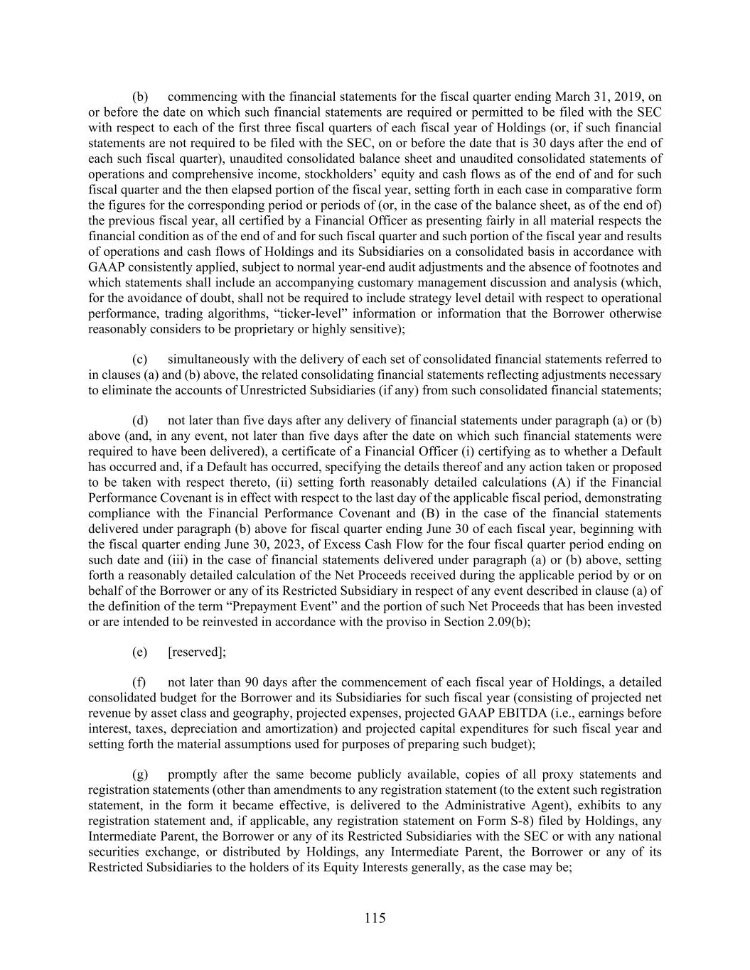 115 (b) commencing with the financial statements for the fiscal quarter ending March 31, 2019, on or before the date on which such financial statements are required or permitted to be filed with the SEC with respect to each of the first three fiscal quarters of each fiscal year of Holdings (or, if such financial statements are not required to be filed with the SEC, on or before the date that is 30 days after the end of each such fiscal quarter), unaudited consolidated balance sheet and unaudited consolidated statements of operations and comprehensive income, stockholders’ equity and cash flows as of the end of and for such fiscal quarter and the then elapsed portion of the fiscal year, setting forth in each case in comparative form the figures for the corresponding period or periods of (or, in the case of the balance sheet, as of the end of) the previous fiscal year, all certified by a Financial Officer as presenting fairly in all material respects the financial condition as of the end of and for such fiscal quarter and such portion of the fiscal year and results of operations and cash flows of Holdings and its Subsidiaries on a consolidated basis in accordance with GAAP consistently applied, subject to normal year-end audit adjustments and the absence of footnotes and which statements shall include an accompanying customary management discussion and analysis (which, for the avoidance of doubt, shall not be required to include strategy level detail with respect to operational performance, trading algorithms, “ticker-level” information or information that the Borrower otherwise reasonably considers to be proprietary or highly sensitive); (c) simultaneously with the delivery of each set of consolidated financial statements referred to in clauses (a) and (b) above, the related consolidating financial statements reflecting adjustments necessary to eliminate the accounts of Unrestricted Subsidiaries (if any) from such consolidated financial statements; (d) not later than five days after any delivery of financial statements under paragraph (a) or (b) above (and, in any event, not later than five days after the date on which such financial statements were required to have been delivered), a certificate of a Financial Officer (i) certifying as to whether a Default has occurred and, if a Default has occurred, specifying the details thereof and any action taken or proposed to be taken with respect thereto, (ii) setting forth reasonably detailed calculations (A) if the Financial Performance Covenant is in effect with respect to the last day of the applicable fiscal period, demonstrating compliance with the Financial Performance Covenant and (B) in the case of the financial statements delivered under paragraph (b) above for fiscal quarter ending June 30 of each fiscal year, beginning with the fiscal quarter ending June 30, 2023, of Excess Cash Flow for the four fiscal quarter period ending on such date and (iii) in the case of financial statements delivered under paragraph (a) or (b) above, setting forth a reasonably detailed calculation of the Net Proceeds received during the applicable period by or on behalf of the Borrower or any of its Restricted Subsidiary in respect of any event described in clause (a) of the definition of the term “Prepayment Event” and the portion of such Net Proceeds that has been invested or are intended to be reinvested in accordance with the proviso in Section 2.09(b); (e) [reserved]; (f) not later than 90 days after the commencement of each fiscal year of Holdings, a detailed consolidated budget for the Borrower and its Subsidiaries for such fiscal year (consisting of projected net revenue by asset class and geography, projected expenses, projected GAAP EBITDA (i.e., earnings before interest, taxes, depreciation and amortization) and projected capital expenditures for such fiscal year and setting forth the material assumptions used for purposes of preparing such budget); (g) promptly after the same become publicly available, copies of all proxy statements and registration statements (other than amendments to any registration statement (to the extent such registration statement, in the form it became effective, is delivered to the Administrative Agent), exhibits to any registration statement and, if applicable, any registration statement on Form S-8) filed by Holdings, any Intermediate Parent, the Borrower or any of its Restricted Subsidiaries with the SEC or with any national securities exchange, or distributed by Holdings, any Intermediate Parent, the Borrower or any of its Restricted Subsidiaries to the holders of its Equity Interests generally, as the case may be;