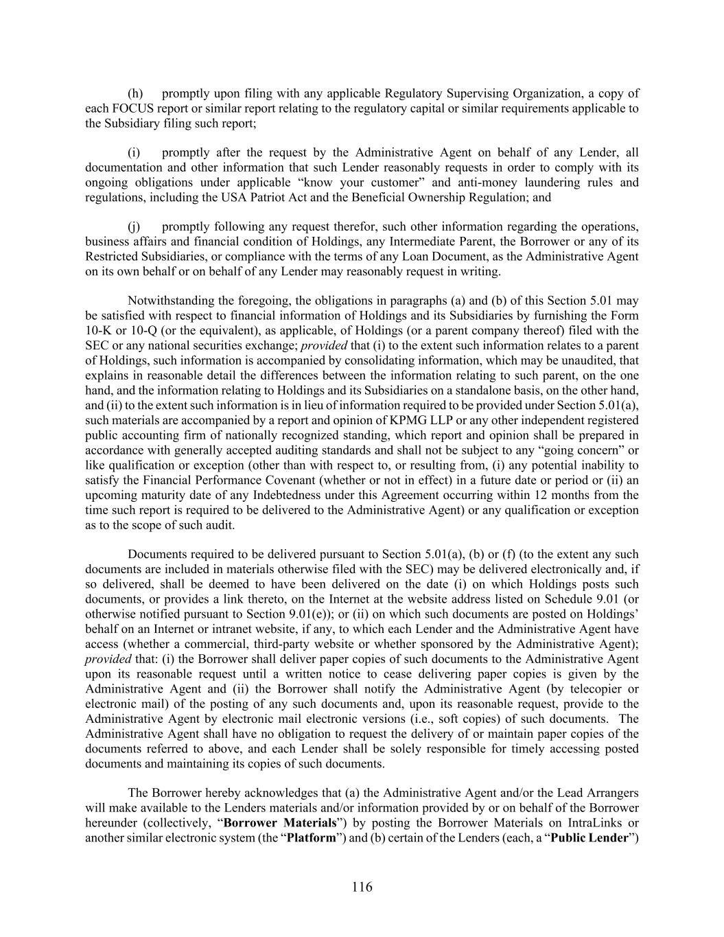 116 (h) promptly upon filing with any applicable Regulatory Supervising Organization, a copy of each FOCUS report or similar report relating to the regulatory capital or similar requirements applicable to the Subsidiary filing such report; (i) promptly after the request by the Administrative Agent on behalf of any Lender, all documentation and other information that such Lender reasonably requests in order to comply with its ongoing obligations under applicable “know your customer” and anti-money laundering rules and regulations, including the USA Patriot Act and the Beneficial Ownership Regulation; and (j) promptly following any request therefor, such other information regarding the operations, business affairs and financial condition of Holdings, any Intermediate Parent, the Borrower or any of its Restricted Subsidiaries, or compliance with the terms of any Loan Document, as the Administrative Agent on its own behalf or on behalf of any Lender may reasonably request in writing. Notwithstanding the foregoing, the obligations in paragraphs (a) and (b) of this Section 5.01 may be satisfied with respect to financial information of Holdings and its Subsidiaries by furnishing the Form 10-K or 10-Q (or the equivalent), as applicable, of Holdings (or a parent company thereof) filed with the SEC or any national securities exchange; provided that (i) to the extent such information relates to a parent of Holdings, such information is accompanied by consolidating information, which may be unaudited, that explains in reasonable detail the differences between the information relating to such parent, on the one hand, and the information relating to Holdings and its Subsidiaries on a standalone basis, on the other hand, and (ii) to the extent such information is in lieu of information required to be provided under Section 5.01(a), such materials are accompanied by a report and opinion of KPMG LLP or any other independent registered public accounting firm of nationally recognized standing, which report and opinion shall be prepared in accordance with generally accepted auditing standards and shall not be subject to any “going concern” or like qualification or exception (other than with respect to, or resulting from, (i) any potential inability to satisfy the Financial Performance Covenant (whether or not in effect) in a future date or period or (ii) an upcoming maturity date of any Indebtedness under this Agreement occurring within 12 months from the time such report is required to be delivered to the Administrative Agent) or any qualification or exception as to the scope of such audit. Documents required to be delivered pursuant to Section 5.01(a), (b) or (f) (to the extent any such documents are included in materials otherwise filed with the SEC) may be delivered electronically and, if so delivered, shall be deemed to have been delivered on the date (i) on which Holdings posts such documents, or provides a link thereto, on the Internet at the website address listed on Schedule 9.01 (or otherwise notified pursuant to Section 9.01(e)); or (ii) on which such documents are posted on Holdings’ behalf on an Internet or intranet website, if any, to which each Lender and the Administrative Agent have access (whether a commercial, third-party website or whether sponsored by the Administrative Agent); provided that: (i) the Borrower shall deliver paper copies of such documents to the Administrative Agent upon its reasonable request until a written notice to cease delivering paper copies is given by the Administrative Agent and (ii) the Borrower shall notify the Administrative Agent (by telecopier or electronic mail) of the posting of any such documents and, upon its reasonable request, provide to the Administrative Agent by electronic mail electronic versions (i.e., soft copies) of such documents. The Administrative Agent shall have no obligation to request the delivery of or maintain paper copies of the documents referred to above, and each Lender shall be solely responsible for timely accessing posted documents and maintaining its copies of such documents. The Borrower hereby acknowledges that (a) the Administrative Agent and/or the Lead Arrangers will make available to the Lenders materials and/or information provided by or on behalf of the Borrower hereunder (collectively, “Borrower Materials”) by posting the Borrower Materials on IntraLinks or another similar electronic system (the “Platform”) and (b) certain of the Lenders (each, a “Public Lender”)