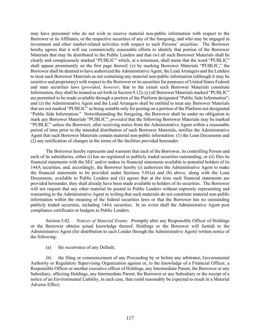 117 may have personnel who do not wish to receive material non-public information with respect to the Borrower or its Affiliates, or the respective securities of any of the foregoing, and who may be engaged in investment and other market-related activities with respect to such Persons’ securities. The Borrower hereby agrees that it will use commercially reasonable efforts to identify that portion of the Borrower Materials that may be distributed to the Public Lenders and that (w) all such Borrower Materials shall be clearly and conspicuously marked “PUBLIC” which, at a minimum, shall mean that the word “PUBLIC” shall appear prominently on the first page thereof; (x) by marking Borrower Materials “PUBLIC,” the Borrower shall be deemed to have authorized the Administrative Agent, the Lead Arrangers and the Lenders to treat such Borrower Materials as not containing any material non-public information (although it may be sensitive and proprietary) with respect to the Borrower or its securities for purposes of United States Federal and state securities laws (provided, however, that to the extent such Borrower Materials constitute Information, they shall be treated as set forth in Section 9.12); (y) all Borrower Materials marked “PUBLIC” are permitted to be made available through a portion of the Platform designated “Public Side Information”; and (z) the Administrative Agent and the Lead Arrangers shall be entitled to treat any Borrower Materials that are not marked “PUBLIC” as being suitable only for posting on a portion of the Platform not designated “Public Side Information.” Notwithstanding the foregoing, the Borrower shall be under no obligation to mark any Borrower Materials “PUBLIC”; provided that the following Borrower Materials may be marked “PUBLIC” unless the Borrower, after receiving notice from the Administrative Agent within a reasonable period of time prior to the intended distribution of such Borrower Materials, notifies the Administrative Agent that such Borrower Materials contain material non-public information: (1) the Loan Documents and (2) any notification of changes in the terms of the facilities provided hereunder. The Borrower hereby represents and warrants that each of the Borrower, its controlling Person and each of its subsidiaries, either (i) has no registered or publicly traded securities outstanding, or (ii) files its financial statements with the SEC and/or makes its financial statements available to potential holders of its 144A securities, and, accordingly, the Borrower hereby (i) authorizes the Administrative Agent to make the financial statements to be provided under Sections 5.01(a) and (b) above, along with the Loan Documents, available to Public Lenders and (ii) agrees that at the time such financial statements are provided hereunder, they shall already have been made available to holders of its securities. The Borrower will not request that any other material be posted to Public Lenders without expressly representing and warranting to the Administrative Agent in writing that such materials do not constitute material non-public information within the meaning of the federal securities laws or that the Borrower has no outstanding publicly traded securities, including 144A securities. In no event shall the Administrative Agent post compliance certificates or budgets to Public Lenders. Section 5.02. Notices of Material Events. Promptly after any Responsible Officer of Holdings or the Borrower obtains actual knowledge thereof, Holdings or the Borrower will furnish to the Administrative Agent (for distribution to each Lender through the Administrative Agent) written notice of the following: (a) the occurrence of any Default; (b) the filing or commencement of any Proceeding by or before any arbitrator, Governmental Authority or Regulatory Supervising Organization against or, to the knowledge of a Financial Officer, a Responsible Officer or another executive officer of Holdings, any Intermediate Parent, the Borrower or any Subsidiary, affecting Holdings, any Intermediate Parent, the Borrower or any Subsidiary or the receipt of a notice of an Environmental Liability, in each case, that could reasonably be expected to result in a Material Adverse Effect;